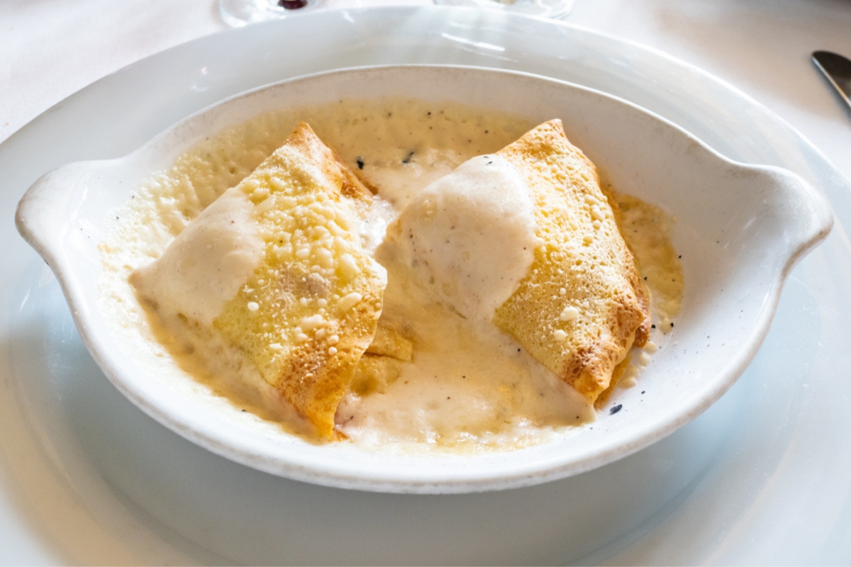 Manfrigole, or Manfrigoli, are thin crêpes from the upper Valtellina region, crafted with a blend of buckwheat and wheat flour. Once cooked, they are filled with a mixture of cheese, bresaola, and soaked stale bread, often made with rye bread. The filled crêpes are rolled and sliced into two or three cylinders, then placed in a baking dish. They are garnished with cubes of Casera cheese, curls of butter, and baked in a hot oven for 3 to 5 minutes until the cheese melts, achieving a deep golden bubbly finish. This dish serves as a hearty appetizer, perfect for colder days, best enjoyed straight from the oven.