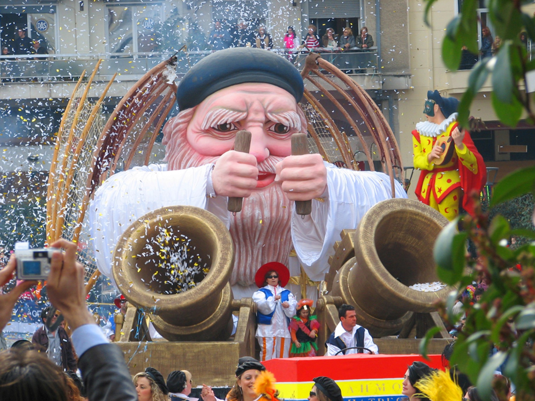 Un char coloré et animé lors du carnaval de Patras, avec des festivités partout autour.