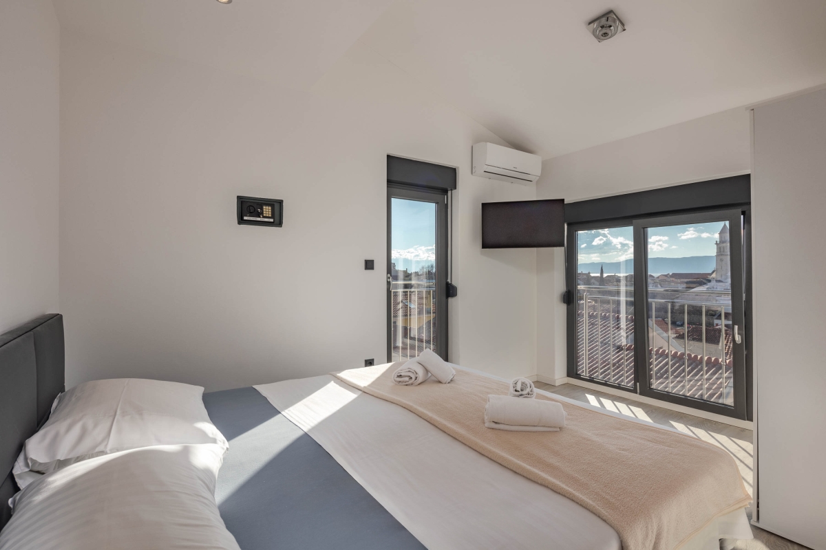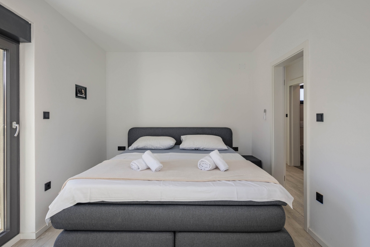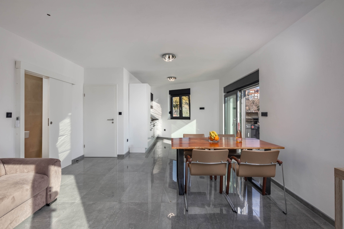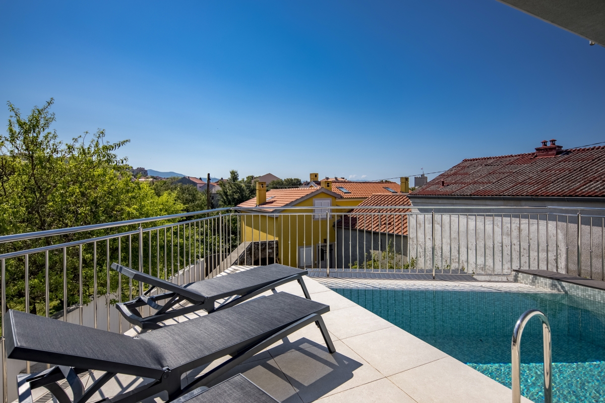 Just a 10-minute walk from Novi Vinodolski’s beautiful seafront, this contemporary villa offers the ideal combination of modern comfort with old-world charm. The villa has been designed to ensure that guests can relax and recharge in this lovely seaside town. Spread over 3 floors, the villa can sleep up to 7 people. It is divided into two separate apartments which allow guests to holiday together but retain some privacy and independence. The décor is sleek and modern, without compromising guests’ comfort. The ground-floor apartment includes an open living/dining space, furnished with a corner sofa, dining table and chairs. Next to this is the new kitchen which is very well-appointed with an induction hob, oven, fridge/freezer and American-style coffee machine. Glass doors open onto an attractive walled garden where guests will find a BBQ, table and chairs for outdoor meals. On the first floor, the second open-plan living area has large glass doors which lead out onto a private terrace with a swimming pool - ideal for guests to cool off on a hot day. Inside, the living area has a large, flat-screen TV and dining table and chairs. The open kitchen is well-equipped with an induction hob, oven, dishwasher, kettle, toaster and fridge/freezer. Sleeping The villa has 3 bedrooms, each with a king-size double bed, a flat-screen TV and a wardrobe. The upstairs bedrooms have access to a balcony overlooking the pool. The ground-floor bedroom has a glass door leading to the garden. The living room has a single sofa. Bathroom The four bathrooms are beautifully appointed. One has a full bath with a shower, the other three have showers. Each has a basin and WC. Additional • Free wifi • Private, unheated outdoor swimming pool • Outdoor dining • BBQ • Air conditioning • Private garden • Washing machine • Child friendly • Suitable for elderly • 2 Private parking spaces - car recommended Location The villa enjoys a sunny position and lovely views across Novi Vinodolski Old Town to Kvarner Bay. The neighbouring coastline is blessed with several beautiful beaches and clear water. If you can tear yourself away from the coast there is plenty to see and do in the town itself, including the Medieval Frankopan Castle and several historic churches. There is also a regular farmers’ market in the town where you can find the freshest fruit, vegetables and other produce to cook at home. There is a separate fish market for the best catch of the day. There are plenty of water sports available on the town’s beaches including water skiing, jet skis, parasailing and pedal boats. Visitors can also hire larger boats to explore the nearby coast and islands. Rijeka International Airport is just 30 minutes away.