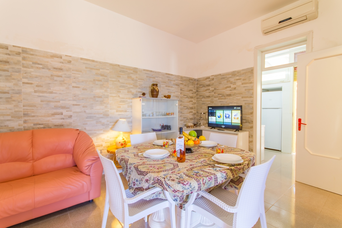 Lo spazio esterno dove poter fare colazione e pranzare/cenare comodamente ed il soggiorno curato nell'arredamento, cucina appena sufficiente, bagno piccolino..