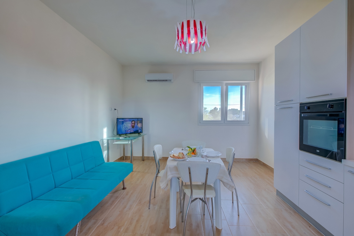 When the beaches call, this terrace apartment near the sea is what you want! Situated minutes away from the sea, this spacious contemporary apartment with a sunny private garden and open-air dining is a relaxing holiday option for families or friends. The 2-bedroom apartment sleeps 6 people and is in a quiet part of the town, but close to restaurants and shops. Inside, there is a fully furnished living/dining room with a sofa, a large flat-screen TV, a dining table and an open kitchen. In the kitchen, you’ll find everything needed for a hassle-free, self-catering stay, including a cooker hob, oven, fridge with freezer and coffee machine. Bigger groups can book a similar apartment in the same building, depending upon availability. Please ask for ID 10214. Sleeping Both bedrooms feature a double bed along with a wardrobe. Extra: The sofa in the living room converts into a double bed. Bathrooms Bathroom 1: The bathroom has a shower, hairdryer, basin, bidet and WC. Additional • Free Wi-Fi (Portable Device) • Private garden • Outside dining • Digital TV • Hairdryer • Washing machine • Waste disposal • Private parking - car recommended • Child-friendly • Child’s cot €20 and highchair €20 on request, depending on availability • Pets not allowed - Electricity cost €8/day Location Guests are perfectly placed to easily access the beautiful sandy beaches of the Manduria ( Spiaggia di San Bevagna and Rio de Mar Beach) as well as the amazing Nature Reserve of River Chidro in less than a 10-minute drive from the apartment. And in about a 5-minute drive, you can enjoy restaurants serving typical Apulian cuisine. At a 25-minute drive, the resort of Porto Cesareo has beautiful beaches and lively nightlife. The town’s weekly market (Thursday) is the best place to find the finest local food, including olive oil and a variety of cheeses. Guests are placed right in the middle of two fascinating destinations along the Ionian coast, the historic town of Gallipoli a very popular tourist destination during the summer months and the famous city of Taranto, both about a 45-minute drive from the apartment. The closest airport is at Brindisi - just under an hour away by car.