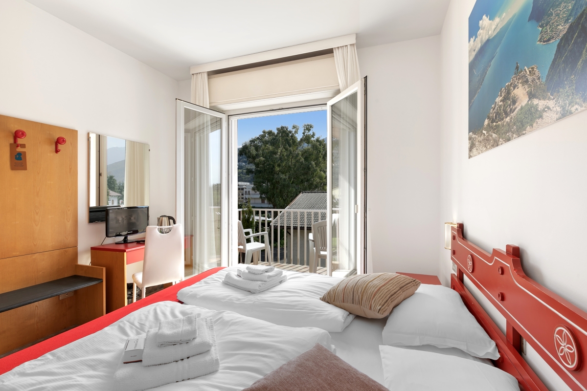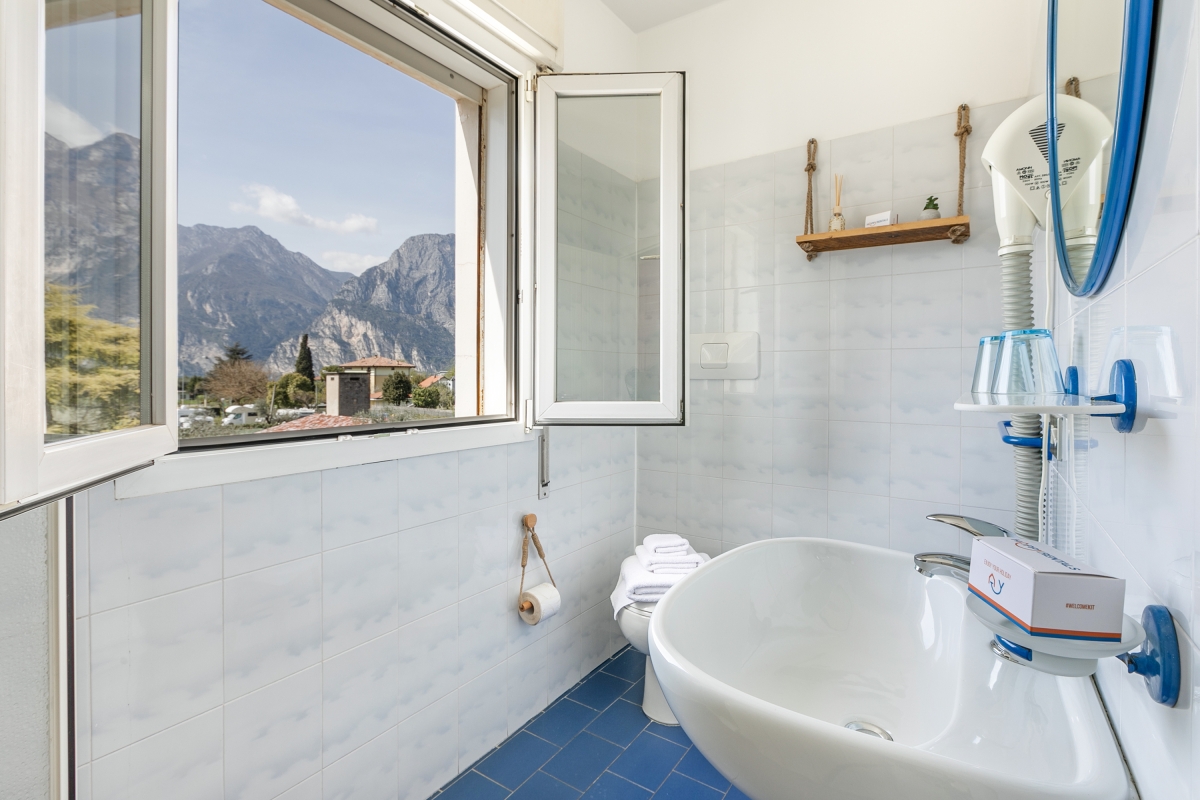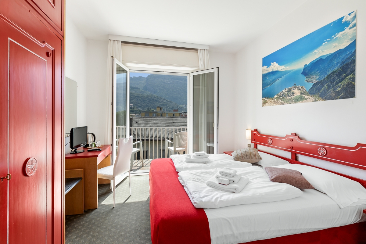 Enjoy the best Torbole with this air-conditioned balcony room for 2 in the centre of the resort! A few steps from the picturesque port of Torbole, essential services and the lakefront, the Bike and Wind Hotel Villa Maria offers maximum comfort, convenience and relaxation. Enjoy by the pool, relax in the sunny garden, enjoy the continental breakfast and unwind with the tranquil lake and mountain views. The room has twin joinable beds, TV, an attached bathroom and a private balcony with an outdoor dining area for moments of intimate relaxation. For larger groups, it is possible to rent similar rooms in hotels. Please inquire with our reservations team. Bath Bathroom 1: The modern bathroom is equipped with a shower, toilet, hairdryer and bidet. More • Free Wi-Fi • Child-friendly • Private outdoor parking • Second Floor • Air conditioning and central heating • Car not necessary • Shared pool and garden • Lift • Waste disposal • Lake view • Bike storage • Electric Kettle • Fridge Extra Charges and Information Breakfast is included and served daily from 7:30 am to 10:00 am, featuring a buffet with continental cold cuts, cheeses, and eggs. Pool towels are provided at no additional cost. Guests can use the bikes on the property for free, subject to availability. Dogs are allowed. Please ensure they do not disturb other guests and note that there are other dogs on the property. The pet fee is €35 per stay or €15 per day for stays over three nights. Location The accommodation is perfect for immersing yourself in the beauty of nature and the adventures that Nago-Torbole offers. Torbole is an international hub for windsurfing and the nearest beginner windsurfing school is just a 5-minute walk from here. The Casa del Dazio, perched along Torbole's scenic harbour, the lakeside Parco Pavese and the breathtaking views of the Arco Belvedere, are also just 10 minutes from here. Furthermore, Torbole Beach is just a 5-minute walk away for relaxing by the lake. Restaurants and cafes are all close at hand, a minute or 2 walk away. The area also offers easy access to the spa and the Bussatte-Tempesta panoramic path, reachable in 6 minutes by car. Other Lake Garda tourist locations such as Riva del Garda are just 10 minutes away by car, ideal for shopping, eating in multi-cuisine restaurants and exploring cultural heritage such as the Torre Apponale, the ancient thermal baths and the Rocco with the Civic Museum; the Italian climbing capital, Arco is 15 minutes away and the scenic walk across Lake Garda to Limone Sul Garda is 20 minutes from here. The nearest international airport is Verona Airport, approximately a 65-minute drive from this holiday apartment in Torbole-Nago.