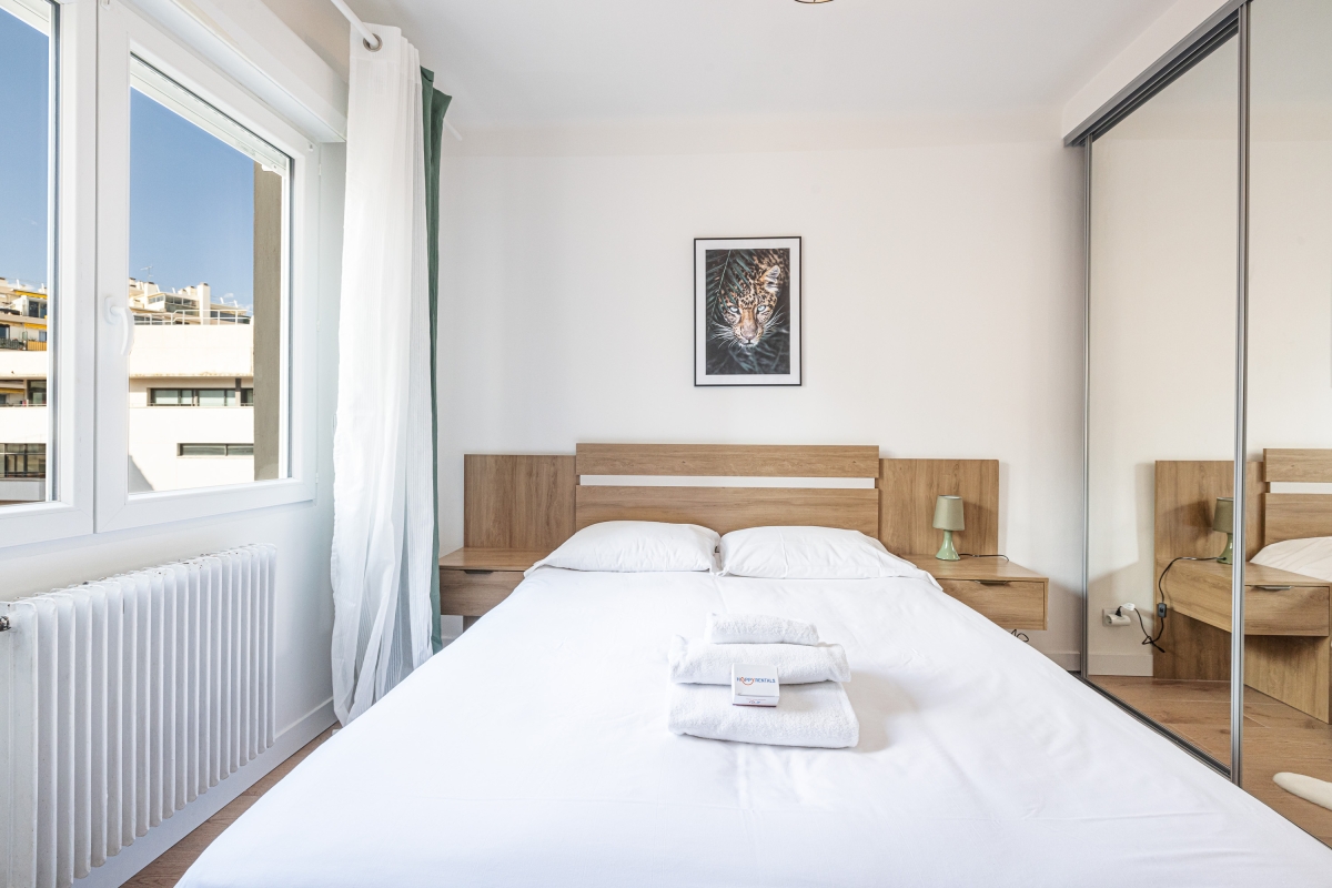 Bedroom 1: The first bedroom is furnished with a double bed, a large wardrobe and has access to a balcony