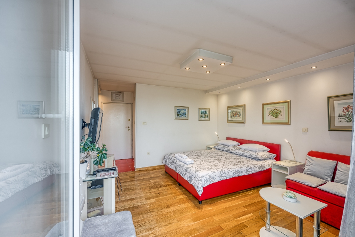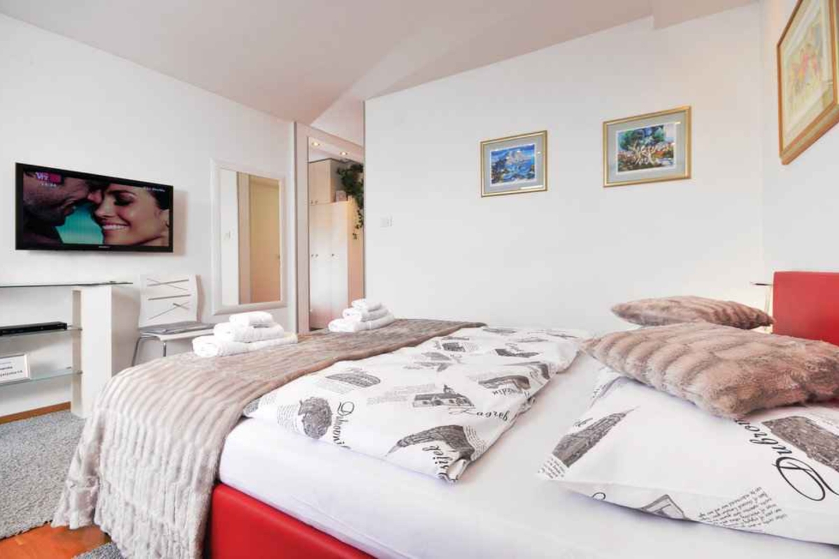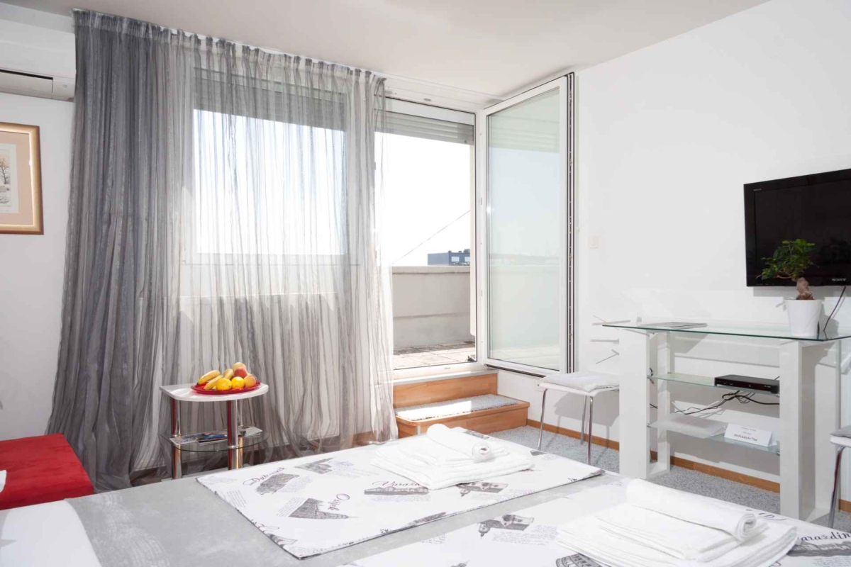Experience breathtaking panoramic views of Zagreb's city skyline and the majestic Medvednica mountain at this terraced penthouse. Nestled in the heart of Zagreb, this penthouse on the 10th floor offers an unparalleled living experience with a tastefully furnished space designed for comfort and functionality. The apartment has a cosy and inviting ambience featuring an open-plan living area with a double bed, a single sofa and a TV. A well-equipped kitchenette includes a cooker hob, electric kettle, microwave, oven, toaster and fridge. The bathroom features contemporary fixtures and a refreshing aesthetic. The highlight of this penthouse is its spacious terrace with outdoor seating and stunning panoramic views. Enjoy morning coffee in the sunshine, picturesque sunsets, or star-gazing at night, this modern apartment offers comfort and accessibility for everyone. Sleeping A cosy living area features a double bed and a sofa-single bed. Bathroom The bathroom features a shower and WC. Additional • Terrace • Outside dining area • Free Wi-Fi • TV • Air-conditioning • Central heating • Washing machine • Paid public parking • Kitchennette • Mountain view • In town • Pets not allowed Self-check-in: from 16:00 onwards Self-checkout: by 10:00 a.m. Location Situated in Korčulanska Street, Zagreb, this apartment offers a delightful blend of urban convenience and cultural exploration. The beautiful Bundek Lake is a 10-minute drive from the apartment and is perfect for relaxation and outdoor activities, with well-maintained parks, playgrounds, and walking trails. Guests can also find various bars and restaurants within a 5-10 minute drive offering traditional Croatian dishes to international cuisine and a vibrant atmosphere. A unique experience awaits at the famous Museum of Broken Relationships, a 15-minute drive away, where personal artefacts and stories from failed relationships are displayed, offering a deeply emotional and human connection. Within an 11-minute drive, guests can explore attractions like the Croatian National Theatre, Museum of Illusions and Nikola Tesla Technical Museum. This location is surrounded by parks like Zrinjevac, King Tomislav Square and Ribnjak Park reachable within 10 minutes.
