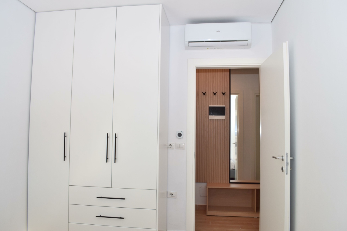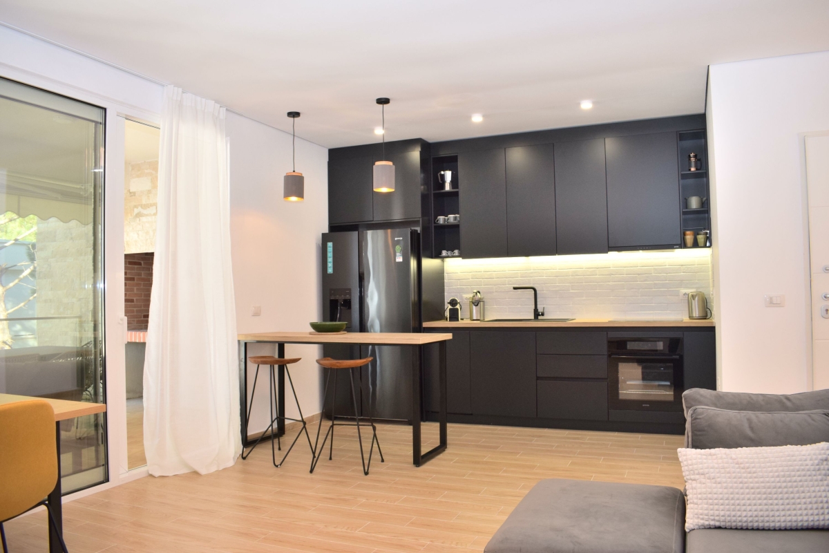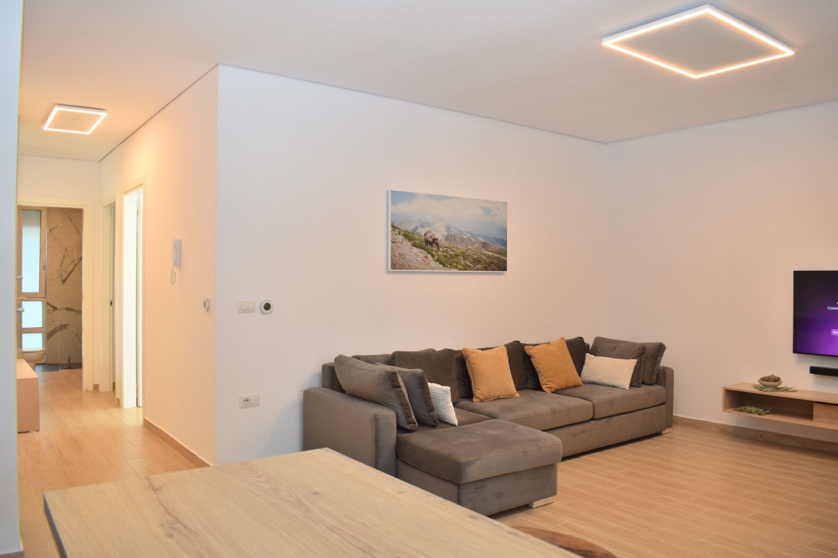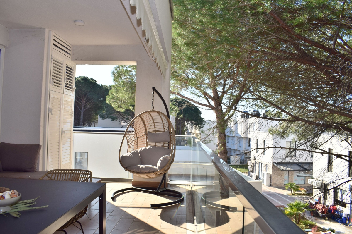 Set among umbrella pine trees, this third-floor apartment sleeps 6 people. It is part of San Pietro Resort and just a 5-minute walk from Lalzit Bay on the Adriatic Riviera. The apartment makes an ideal base for friends or family looking for a relaxing beach holiday in this beautiful corner of Albania. The contemporary apartment has been carefully decorated and has an airy open-plan living area with an L-shaped sofa and a flat-screen TV. The wooden dining table is next to large glass doors which open onto the shaded balcony. The balcony offers outdoor living space and is furnished with a comfortable sofa, coffee table and a swinging egg chair. There is also a dining table and chairs for meals al fresco. Back indoors we find a sleek, open kitchen which is fully equipped with a cooker hob, oven, coffee machine, dishwasher, a fridge/freezer and a breakfast bar with 2 stools. Sleeping Bedroom 1: The master bedroom is furnished with a double bed and a wardrobe. Bedroom 2: This sunny bedroom has two single beds and a wardrobe. Extra: One of the sofas in the living area converts into a comfortable double bed. Bathroom This stylish bathroom has a glass shower, basin, washing machine and WC. Additional • Free Wifi • Shared gardens • Outdoor seating • Balcony • Air conditioning • Flat-screen TV • Waste disposal • Washing machine • Hair dryer • Private parking - car essential • Child friendly • Smoking is permitted only on the balcony or in designated smoking areas. Location The resort of San Pietro is on Lalzit Bay, one of the most popular holiday-destinations in Albania. The gently sloping beaches are very child-friendly. There are also several good restaurants (2-minute walk) and bars. Visitors who are looking for a more active holiday will plenty to do on the beach including scuba diving, jet-skiing, water-skiing and a children’s playground. For self-catering there is a supermarket in San Pietro (1-minute drive). Away from the coast there are many charming hill towns, including Kruje (1 hour) which is home to 5th-century Kruje Castle, as well as Kruje Bazaar which dates back to the 17th century. Here you can find authentic Albanian carpets, textiles and ceramics. There are also hiking routes in the surrounding mountains which range from the easy to the challenging. Tirana is a 45-minute drive and makes a great day trip. It is an eclectic mix of Ottoman, Soviet and Fascist architecture. The city is easy to explore on foot. Blloku is an exciting, young area, full of cafés and interesting boutiques. The main square – Skanderbeg Square is a must-see. The city’s markets offer a window onto everyday life. The New Market, Pazari Ri offers a wide range of local produce. Tirana International Airport is just a 40-minute drive from the apartment.