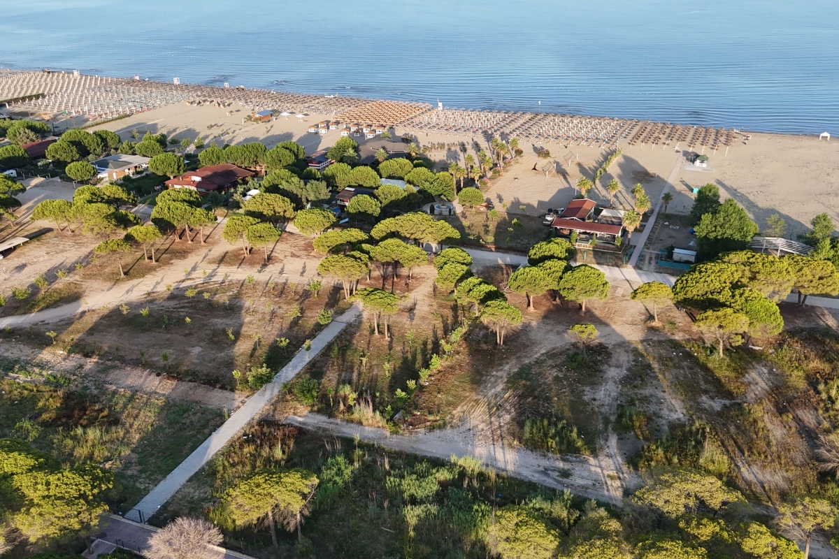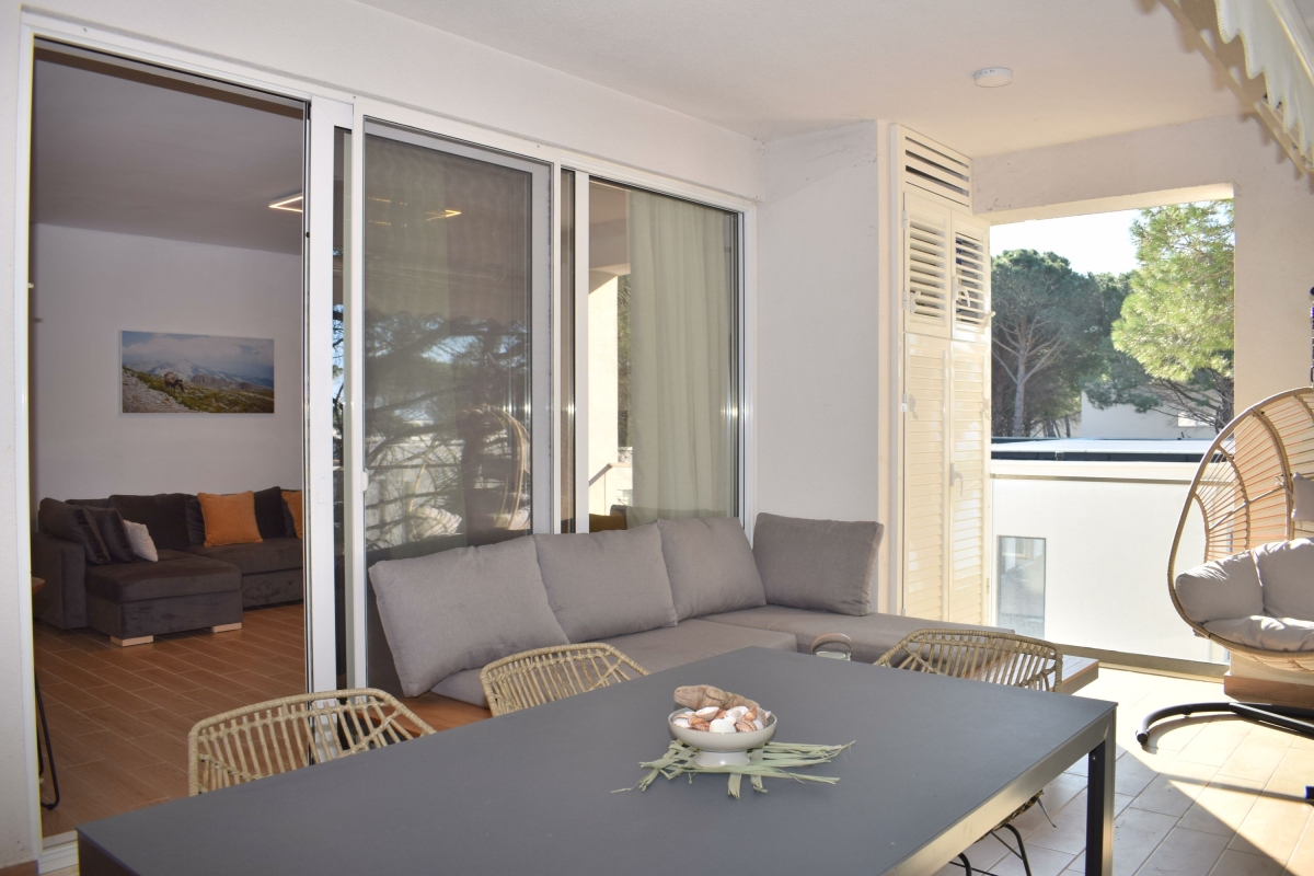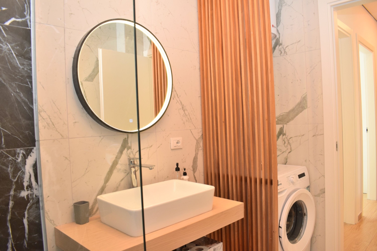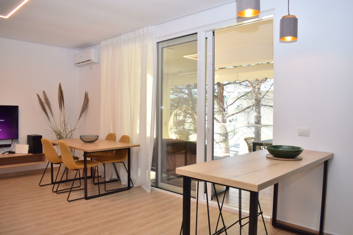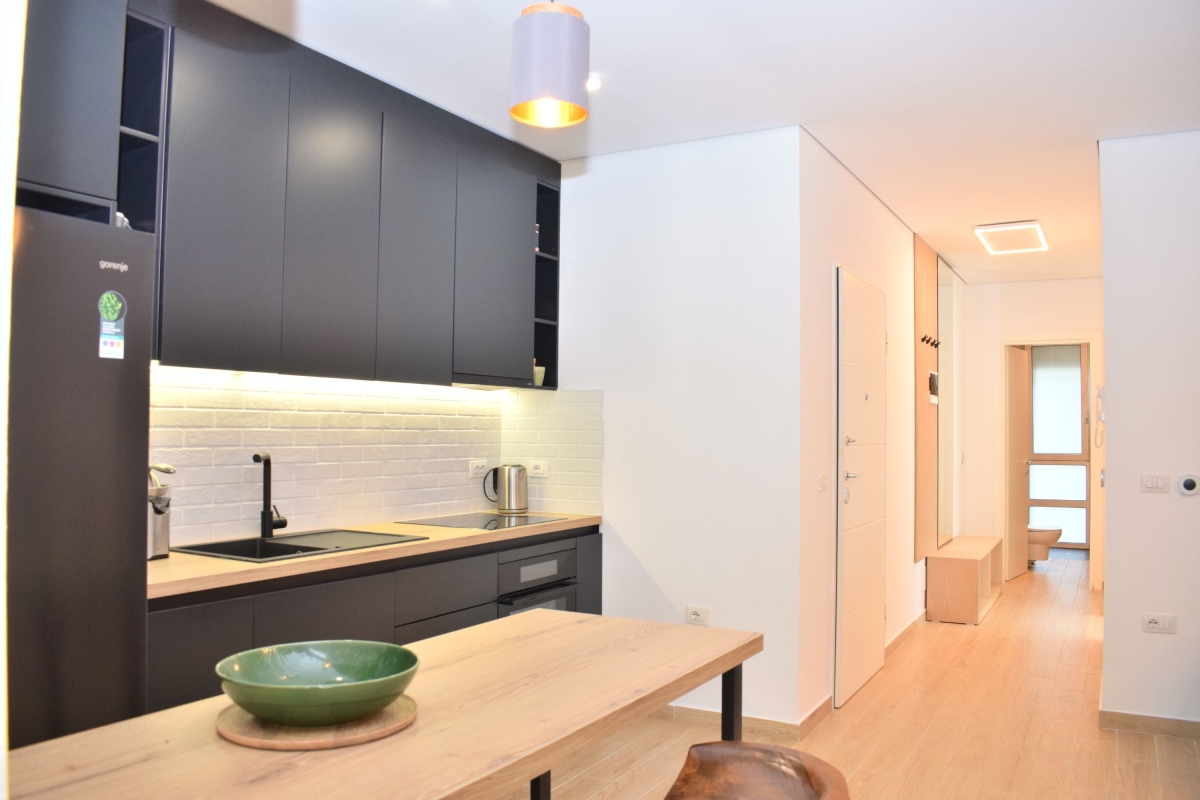 Set among umbrella pine trees, this third-floor apartment sleeps 6 people. It is part of San Pietro Resort and just a 5-minute walk from Lalzit Bay on the Adriatic Riviera. The apartment makes an ideal base for friends or family looking for a relaxing beach holiday in this beautiful corner of Albania. The contemporary apartment has been carefully decorated and has an airy open-plan living area with an L-shaped sofa and a flat-screen TV. The wooden dining table is next to large glass doors which open onto the shaded balcony. The balcony offers outdoor living space and is furnished with a comfortable sofa, coffee table and a swinging egg chair. There is also a dining table and chairs for meals al fresco. Back indoors we find a sleek, open kitchen which is fully equipped with a cooker hob, oven, coffee machine, dishwasher, a fridge/freezer and a breakfast bar with 2 stools. Sleeping Bedroom 1: The master bedroom is furnished with a double bed and a wardrobe. Bedroom 2: This sunny bedroom has two single beds and a wardrobe. Extra: One of the sofas in the living area converts into a comfortable double bed. Bathroom This stylish bathroom has a glass shower, basin, washing machine and WC. Additional • Free Wifi • Shared gardens • Outdoor seating • Balcony • Air conditioning • Flat-screen TV • Waste disposal • Washing machine • Hair dryer • Private parking - car essential • Child friendly • Smoking is permitted only on the balcony or in designated smoking areas. Location The resort of San Pietro is on Lalzit Bay, one of the most popular holiday-destinations in Albania. The gently sloping beaches are very child-friendly. There are also several good restaurants (2-minute walk) and bars. Visitors who are looking for a more active holiday will plenty to do on the beach including scuba diving, jet-skiing, water-skiing and a children’s playground. For self-catering there is a supermarket in San Pietro (1-minute drive). Away from the coast there are many charming hill towns, including Kruje (1 hour) which is home to 5th-century Kruje Castle, as well as Kruje Bazaar which dates back to the 17th century. Here you can find authentic Albanian carpets, textiles and ceramics. There are also hiking routes in the surrounding mountains which range from the easy to the challenging. Tirana is a 45-minute drive and makes a great day trip. It is an eclectic mix of Ottoman, Soviet and Fascist architecture. The city is easy to explore on foot. Blloku is an exciting, young area, full of cafés and interesting boutiques. The main square – Skanderbeg Square is a must-see. The city’s markets offer a window onto everyday life. The New Market, Pazari Ri offers a wide range of local produce. Tirana International Airport is just a 40-minute drive from the apartment.