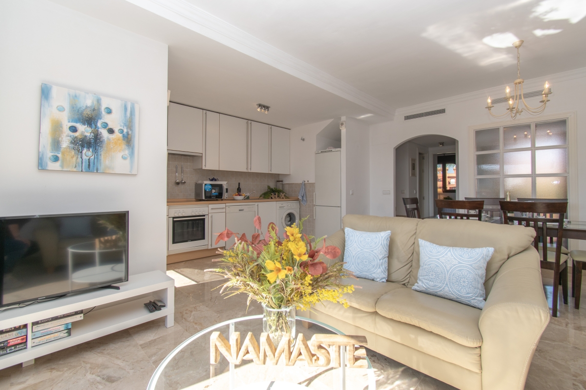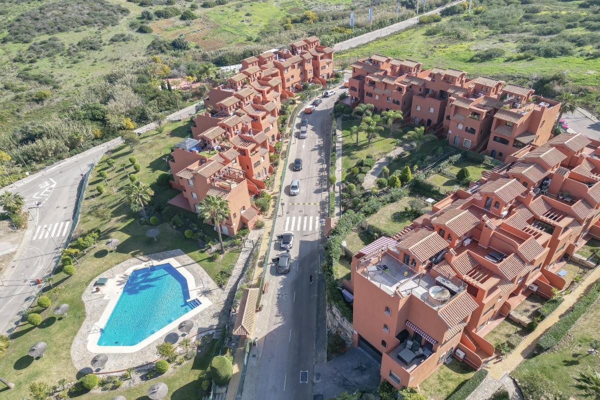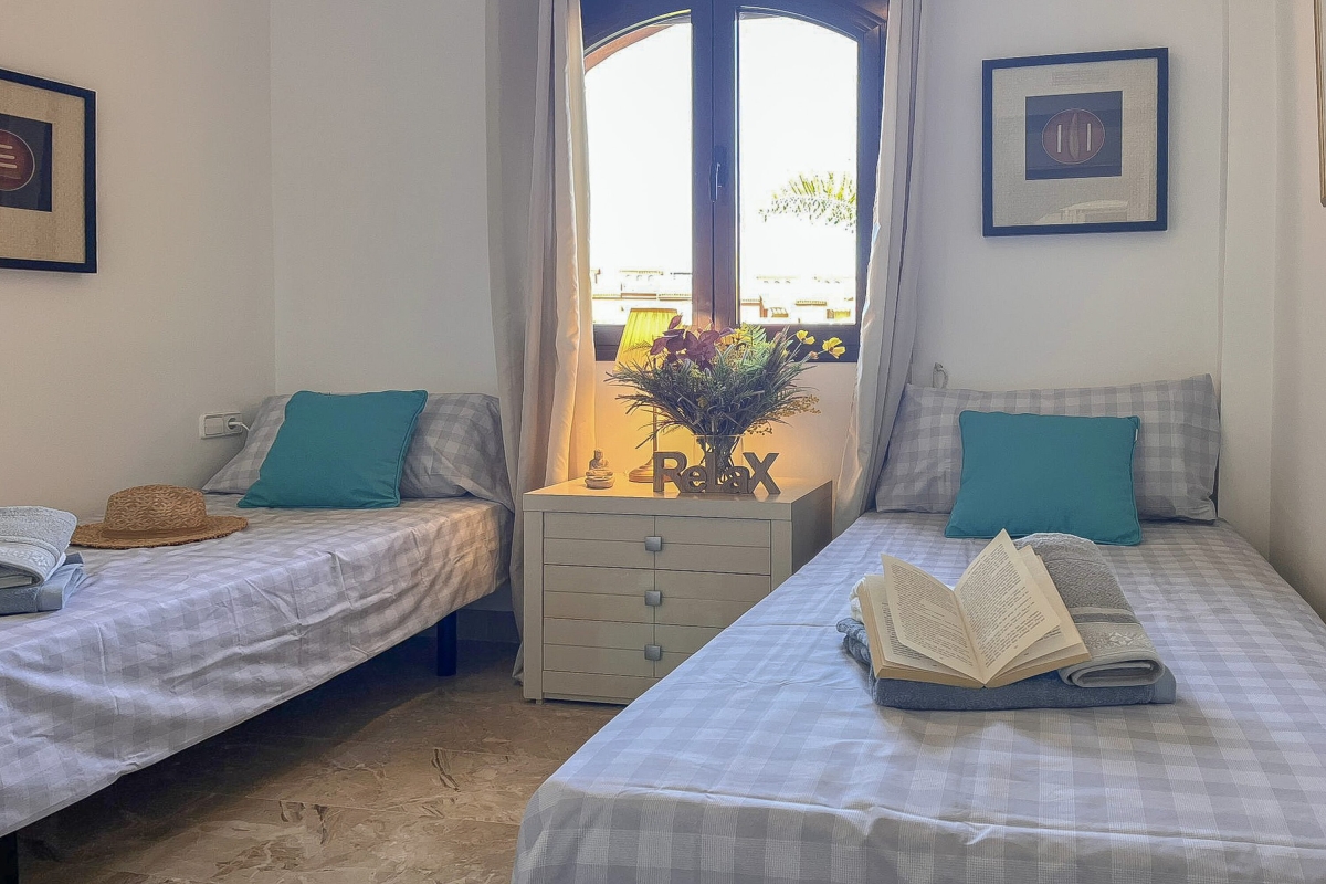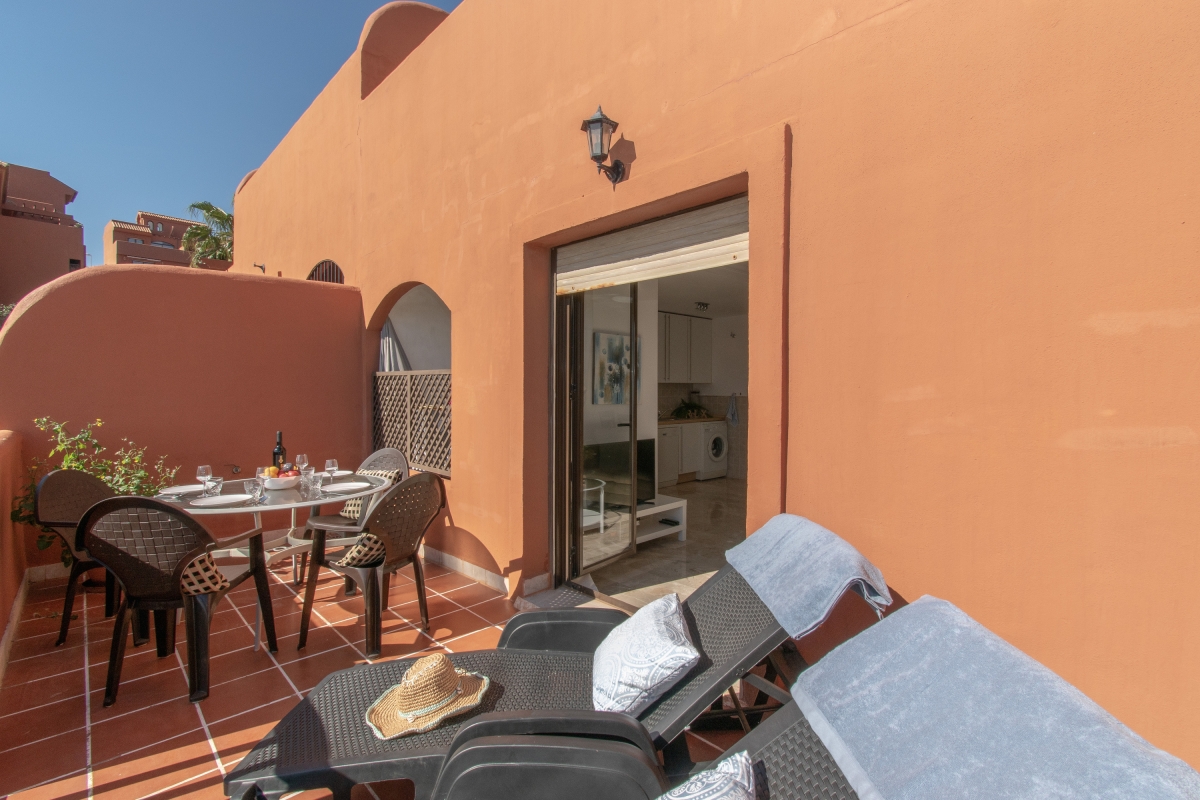 This attractive apartment for 4, just 2 minutes from the Mediterranean coast, makes an ideal base for a relaxed beach holiday. Set in a quiet condominium, with a shared outdoor pool, but just 30 minutes from glamorous Marbella, the apartment offers the best of both worlds. The area is known for its micro-climate and has over 320 days of sunshine every year, making it a great option at any time of year. The duplex is on the first floor and has wonderful views of the sea from the balcony. The balcony, which is off the living area, acts as an extension of the apartment. There is a dining table for meals al fresco, plus sun loungers for guests to relax in peace. The apartment also has a roof terrace with panoramic 360° views over the sea and surrounding area. Indoors, the stylish living area is furnished with a large sofa, flat-screen TV and a second dining table and chairs. The open-plan kitchen is next to the dining area and is well-equipped with fitted units an induction hob, oven, microwave, dishwasher, fridge/freezer, a coffee machine and a washing machine. There are two (linked) swimming pools on site, as well as a communal garden. Sleeping Bedroom 1: The master bedroom has 2 single beds which can be joined, a wardrobe and an en suite bathroom. Glass doors open onto a private balcony with sea views. The balcony has armchairs for enjoying a cup of coffee, a large parasol and sun loungers. Bedroom 2: This airy room has 2 single beds, a wardrobe and a glass door out onto a balcony. Bathrooms Bathroom 1: En suite to the master bedroom, this new bathroom has a full bath with a shower, basin and WC. Bathroom 2: An independent bathroom, equipped with a shower, basin and WC Additional • Free Wifi • Shared outdoor swimming pool • Shared gardens • Balconies • Outside dining • Air conditioning • Hair dryer • Washing machine • Private parking (garage), a car is essential • Location The condominium is on the southern edge of Estepona which hugs the coast and is home to many fine long beaches. Playa de la Galera (3 minutes) is relatively quiet with good water quality, which makes it a popular area for scuba diving. The centre of Estepona (15 minutes) has charming traditional Andalusian architecture and is decked with flowers throughout the year. The cobbled pedestrian streets are ideal for families who want to explore the town. The town’s weekly market (Wednesday) is worth a visit. It is one of the best in Andalucia, and you will be able to find the best local produce to cook at home. Golf lovers will be spoiled for choice with 3 courses close to the apartment; Casares Costa Golf (6 minutes); Dona Julia Golf Club (7 minutes) and Estepona Golf Club (7 minutes). The closest international airports are Gibraltar International Airport (41 minutes) and Malaga Costa del Sol Airport (55 minutes)