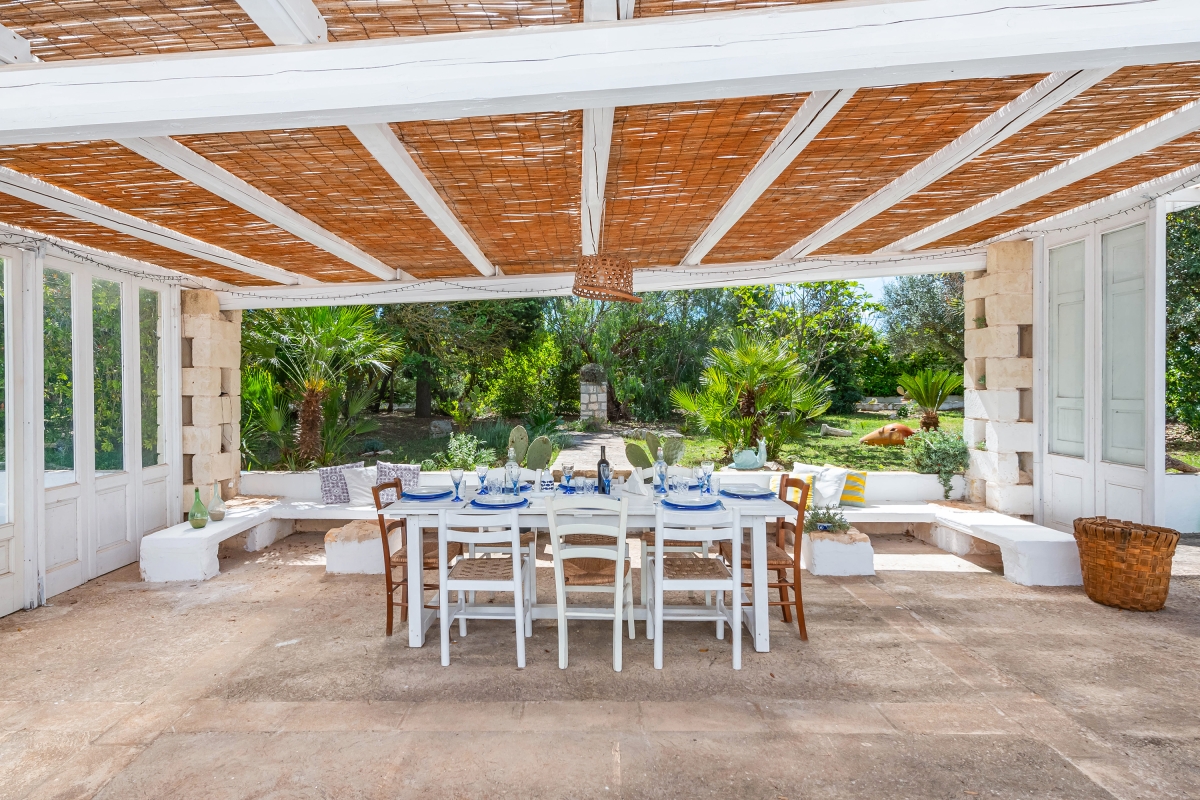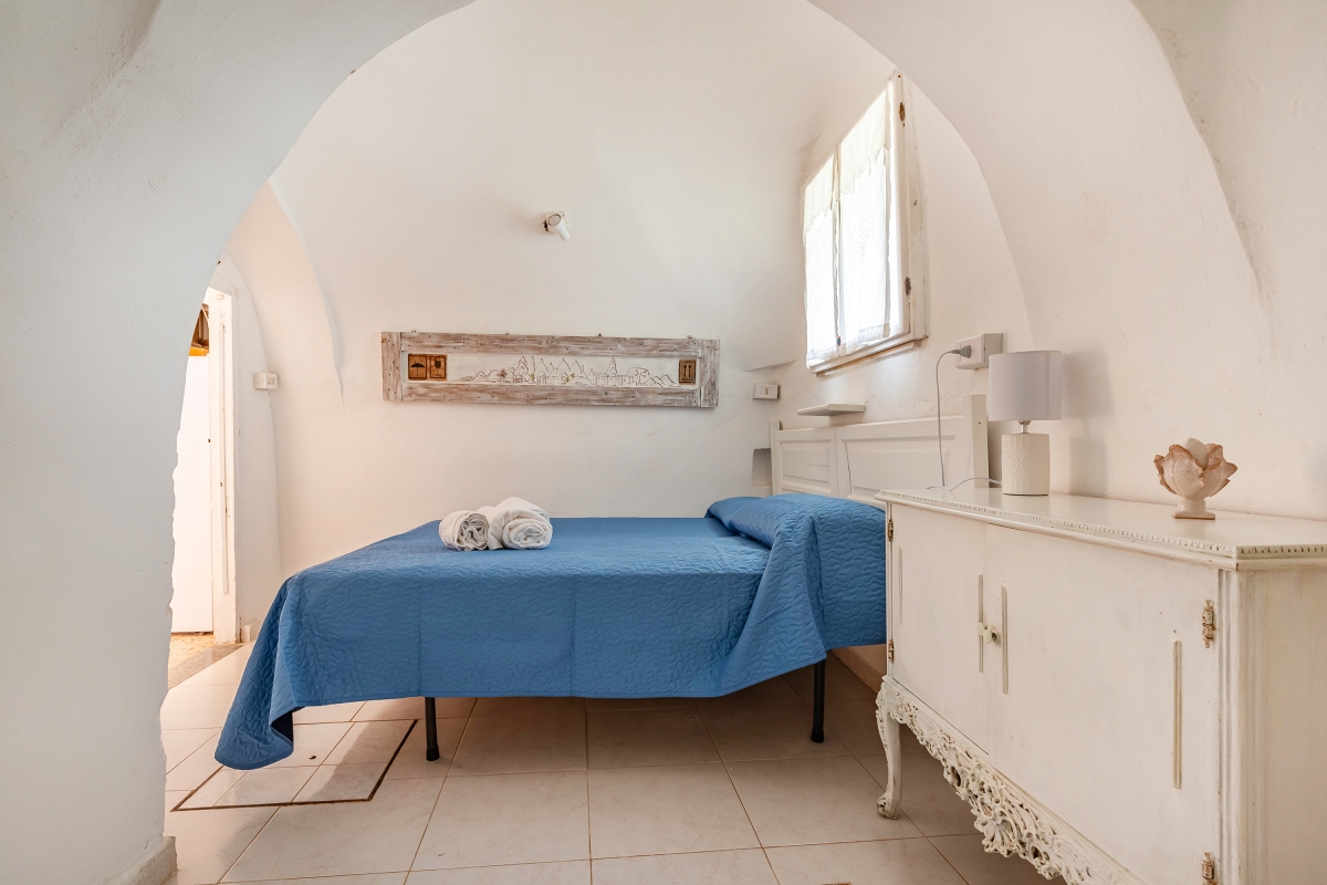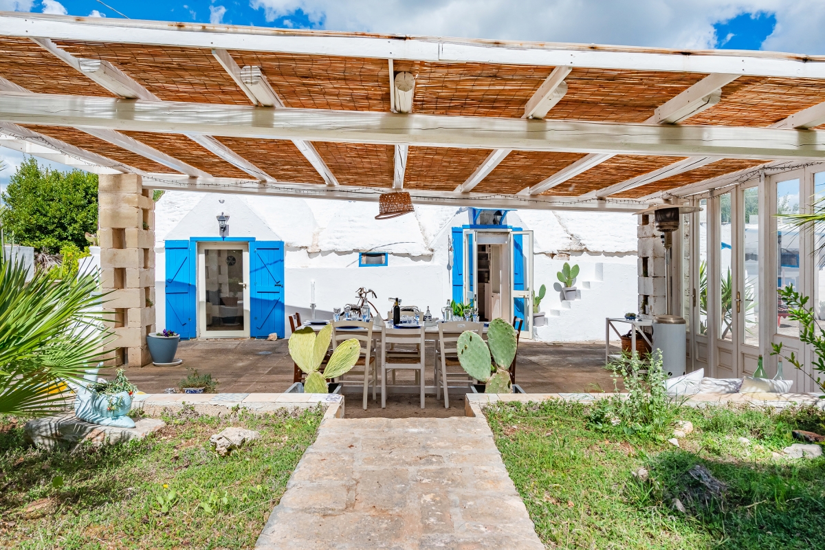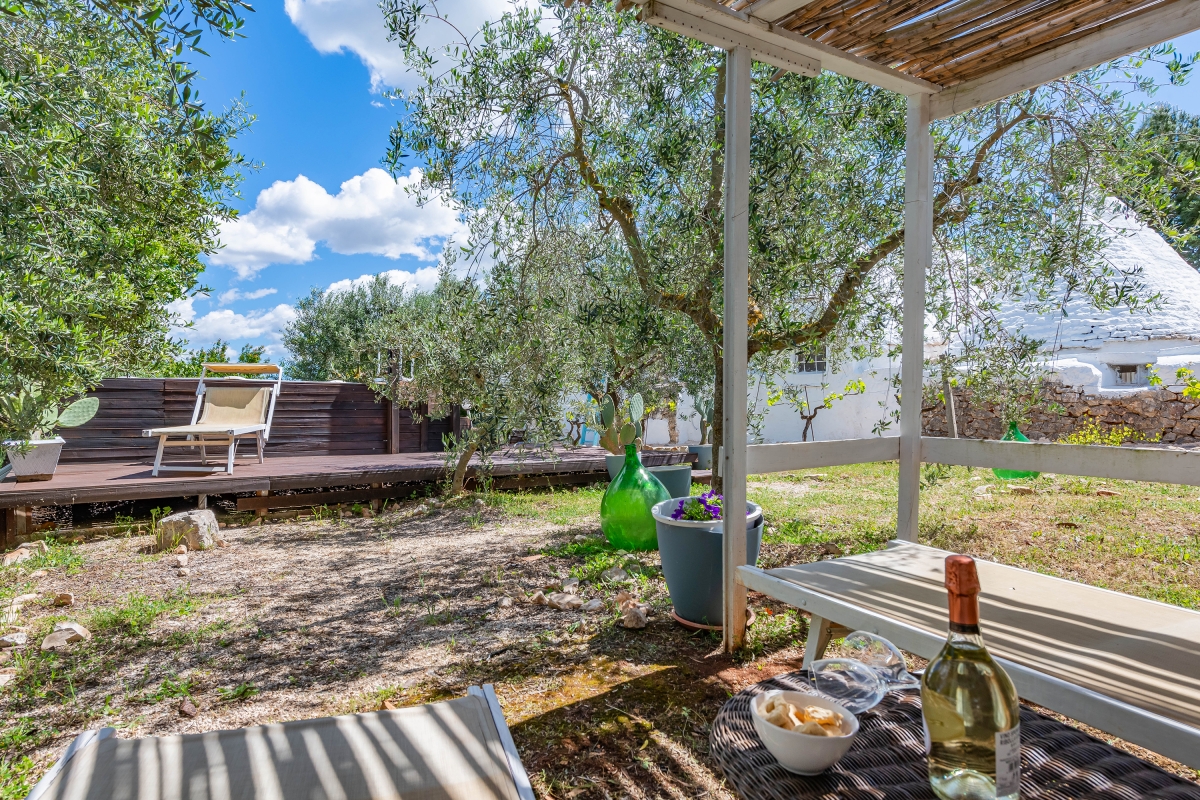 Experience the old-world charm of a trullo stay in Martina Franca’s countryside. Located on Ostuni Road, Trullo Nicolo offers a taste of authentic Apulian living with a taste of luxury featuring a private swimming pool, BBQ and huge outdoor area. This home has 4 bedrooms accommodating up to 8 guests. As you enter through a quaint garden, you’ll find a large patio perfect for al-fresco dining and soaking up the sun with a dining table and stone seats. The wooden swimming pool with sun loungers located amidst olive groves allows you to enjoy a relaxing time. Step inside through the main entrance into an airy kitchen equipped with a microwave, fridge, dishwasher, kettle, coffee machine and utensils. A dining table is in the centre of this area. The access to the first three bedrooms is through the kitchen area. The first bedroom features 2 single beds and a wardrobe. The second bedroom features a double bed and an ensuite bathroom with shower, bidet and WC. This bedroom is connected to the third bedroom which features 2 single beds, a wardrobe and a fireplace. The fourth bedroom features a sitting area with a sofa and fireplace and a sleeping area with a double bed. A hallway through the kitchen leads to the second bathroom with shower, bidet and WC. Sleeping Bedroom 1: A master bedroom includes a double bed, wardrobe, Bedroom 2: The bedroom includes 2 single beds, a wardrobe and a terrace. Bedroom 3: The bedroom includes 2 single beds, a wardrobe and a terrace. Bedroom 4: The bedroom includes a double bed and a terrace. Bathrooms Bathroom 1: The ensuite bathroom to the second bedroom includes shower, bidet and WC. Bathroom 2: The shared bathroom includes shower, bidet and WC. Additional • Private pool • Private Garden • Outside dining area • BBQ • Wi-Fi • Air-conditioning • Private parking space • Washing machine • Laundry facilities • Fireplace • Wood-burning stove • Fire extinguisher • Microwave • Dishwasher • Fridge • Among greenery • Quiet • Child-friendly Self-check-in: from 16:00 onwards Self check out: by 10:00 am Location This home is located at an 8-min drive from the historic centre of Martina Franca where guests can enjoy an array of Italian restaurants and bars. Just a 22-minute drive from Ostuni with its historic white-washed houses, narrow lanes, and Adriatic sea views and 18 minutes from Ceglie Messapica, this spot in Martina Franca offers the ultimate countryside relaxation and is perfect for day trips Alberobello, located at a 23-min drive is a UNESCO World Heritage Site offering a charm unlike any other with whimsical trulli houses dotted through the narrow lanes. Guests explore surrounding cities like Ceglie Messapica (19-min drive), Monopoli (40-min drive) and Polignano a Mare (44-min drive). The nearest international airport is Brindisi Airport located 50 minutes away from the property.