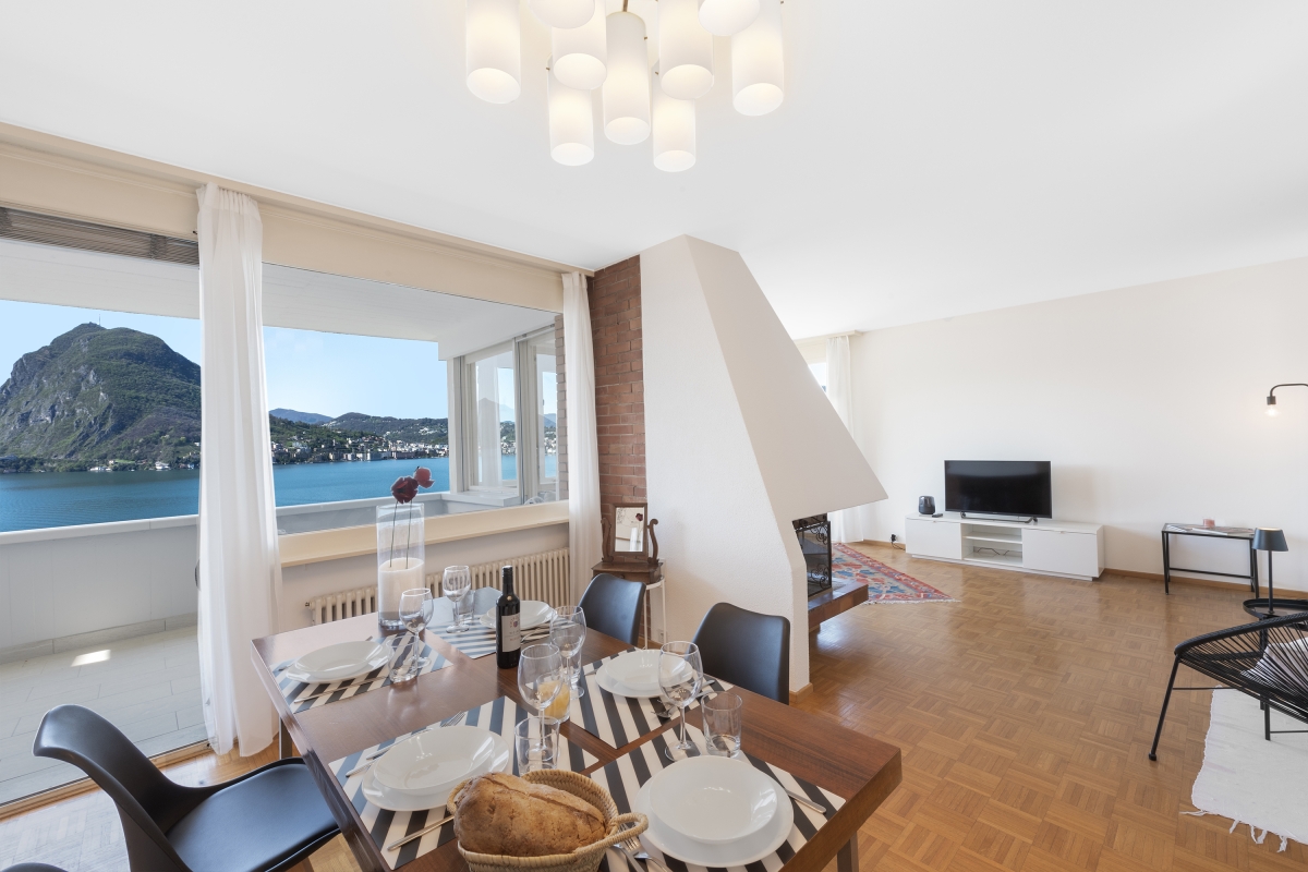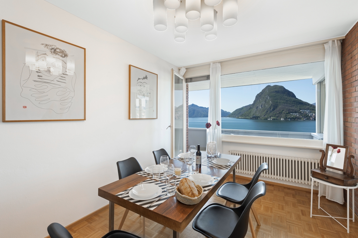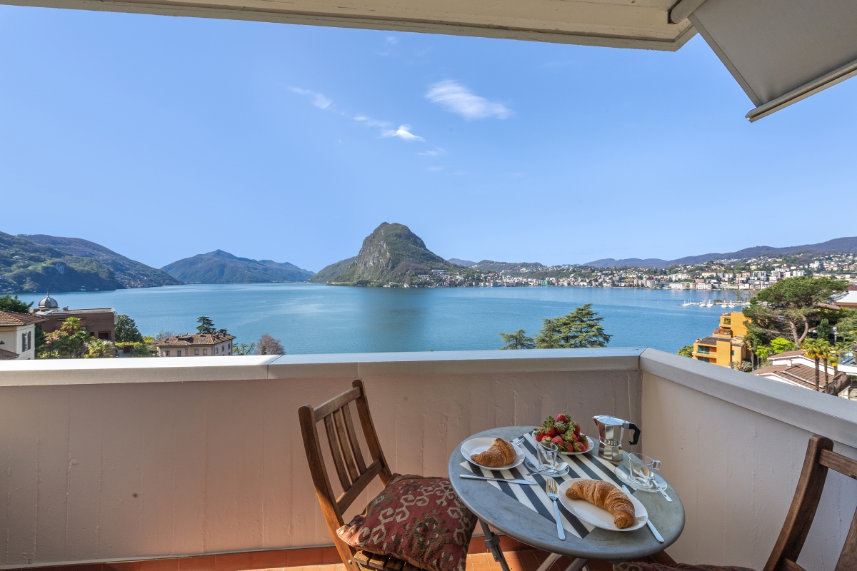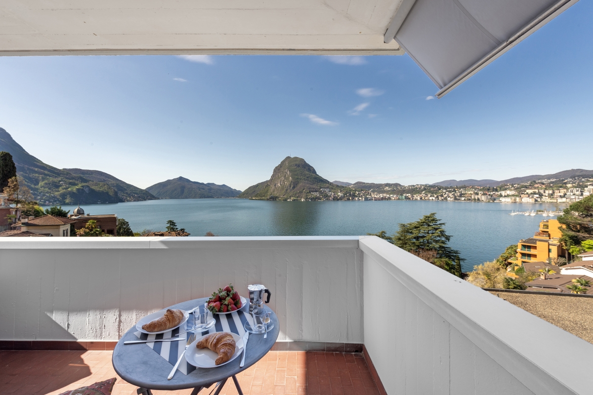 This stylish first-floor apartment with panoramic lake views, sleeps 5 people in comfort. Nestling on the hillside above Lake Lugano, and just 5 minutes from the centre of the city, the apartment is the perfect base for a fabulous holiday in this beautiful region. The spacious contemporary living/dining room has large windows overlooking the lake and the mountains beyond. The décor is chic and modern, with two glass doors leading out onto a private balcony, where guests can enjoy sundowners. Back inside, there is a cosy corner sofa next to a modern brick fireplace and a flat-screen TV. On the other side of the room there is an elegant dining table for 5 people. The separate kitchen is full of light and just off the dining area. is beautifully-equipped with everything you might need. There is a cooker hob, oven, microwave, dishwasher, fridge, freezer and a coffee machine. Sleeping Bedroom 1: The spectacular master bedroom is furnished with a modern double bed, combined with an antique wardrobe, an elegant sofa, a large framed mirror and a balcony shared with the 2nd bedroom which looks out over the lake. Bedroom 2: This airy bedroom has 2 single beds, a wardrobe and a door onto the balcony. Bedroom 3: Another light-filled bedroom with lake views. This room has a single bed and a lap-top friendly workspace. Bathroom Bathroom: The attractive bathroom is equipped with a full bath with a showerhead, separate shower, bidet, basin and WC Extra: There is an additional WC off the living area. Additional • Wifi device • Balconies • Outside dining area • Smart TV • Fireplace • Central heating • Washing machine • Hair dryer • Extra pet friendly • Child-friendly • Private parking, a car is not necessary - Garage Location The apartment is in an excellent location. Just a few hundred metres from the lake shore and a 15 minute walk from the centre of Lugano. On the border of Switzerland and Italy, the city of Lugano is famous for its stunning location, rich cultural heritage and excellent restaurants and cafés. The city hosts many festivals throughout the year, including the “Luganomusica” festival every summer. For self-catering, the Lugano farmers’ market (Tuesdays and Fridays) in Via Carducci (7-minute drive) is the place to go to pick up the best ingredients. Otherwise, there are a wide range of supermarkets nearby. The lovely town of Gandria (4 minute drive) which is towards the Italian border makes a great day out. Visitors can wander through the village’s winding streets or hike along the Sentiero Dell’Olivo. For more beautiful hiking routes, guests can cross over into Italy and enjoy the unspoiled forests and hills of Valsolda (25 minutes). The closest international airports are in Italy - Milan Malpensa 1 hour, 10 minutes by car, or Milan Linate, a 1 hour and 36-minute journey.