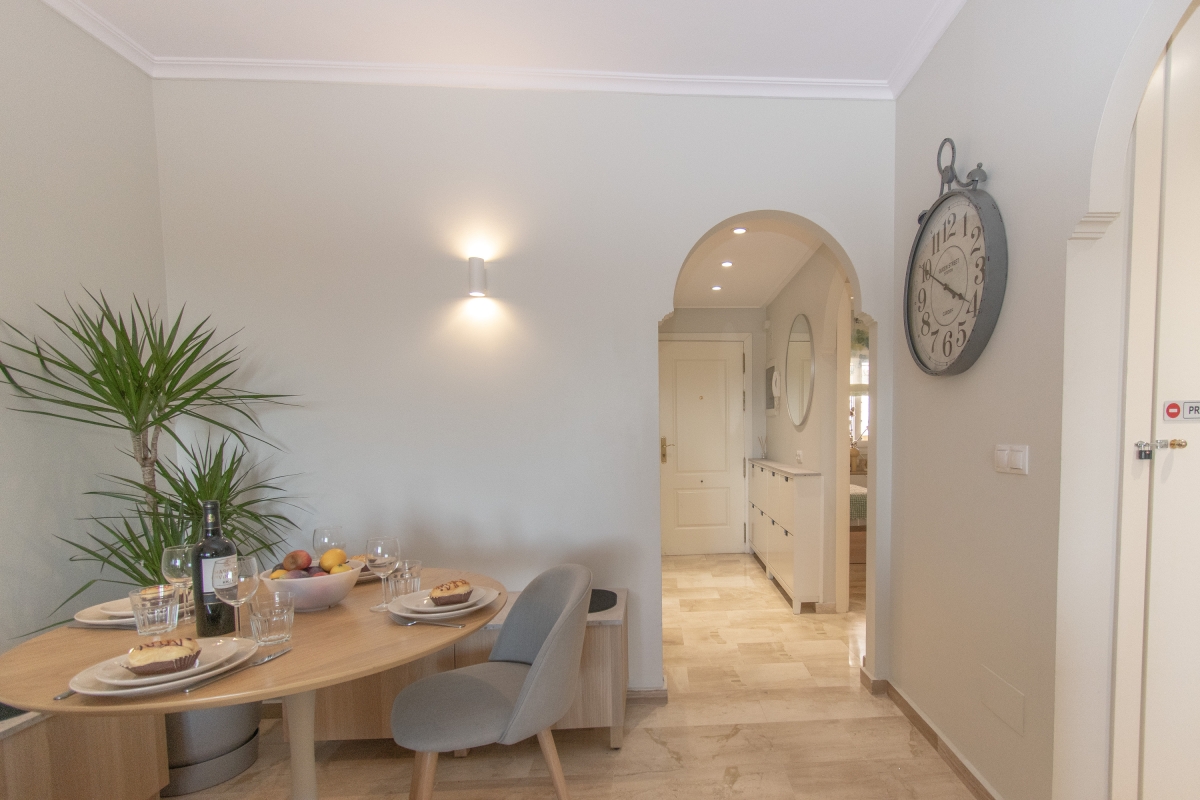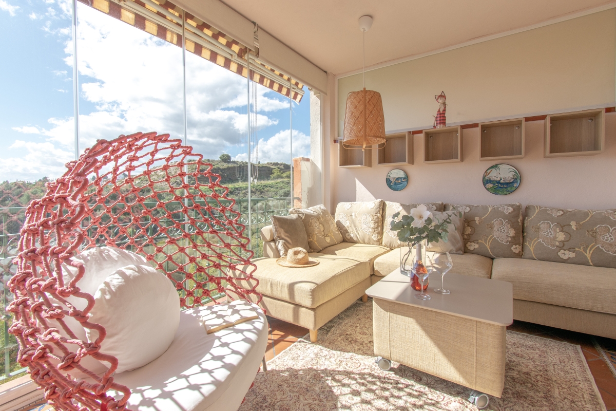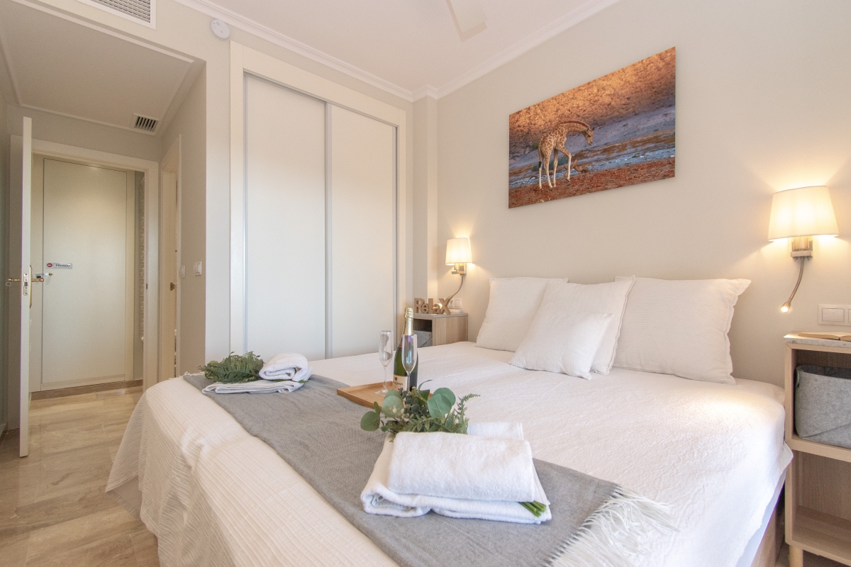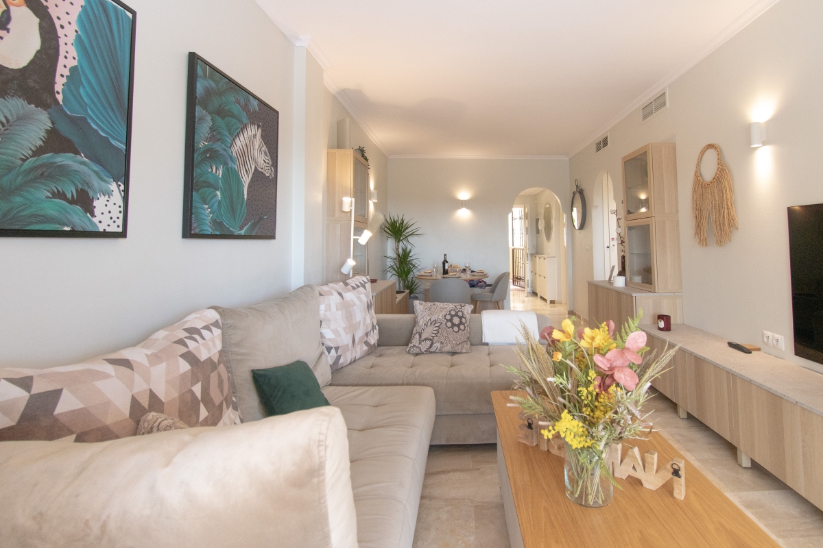Delight in peaceful relaxation with this sea-view pool apartment for 4! Situated perfectly to enjoy the Mediterranean sun and the sea, this air-conditioned retreat is less than a 5-minute drive from the coast of Mijas. The getaway promises total relaxation with its delightful on-site amenities. There is a sun-washed private terrace with alfresco and 2 shared pools for a cool swim, as well as a communal garden for an evening stroll. For active vacationers, the apartment also offers access to the residence gym. The rental is fully air-conditioned, perfect to unwind indoors on sultry days. Its light interiors feature an elegant living room with direct terrace access, a Smart TV and a stylish wooden dining setup for 4. A separate kitchen with a dishwasher, Nespresso machine, induction hob and fridge with freezer make self-catering a breeze here. Additionally, the availability of laundry and ironing facilities, a laptop-friendly workplace and free Wi-Fi make this holiday rental suitable for remote working and year-round stays on Costa del Sol! Sleeping Bedroom 1: An en-suite master bedroom with a double bed, direct terrace access and wardrobe. Bedroom 2: A splendid double bedroom with 2 single beds and a wardrobe. Bathroom Bathroom 1: A modern, en-suite bathroom with a bath with shower and WC. Bathroom 2: A full bathroom with a shower and WC. Additional • Free Wi-Fi • Private Parking Spaces (no.5 ) • Ironing Facilities • Hairdryer • Lift • Shared Outdoor Pool (unheated) • Shared Garden • Sun Loungers • Private Terrace • Pets allowed on request • Washing Machine • Suitable for Elderly • Gym • EV charger available on request and added charges Location The holiday home away is located less than a 10-minute drive from the best of Mijas Costa: from Senda Litoral of Mijas to golfing adventures at Miraflores Golf, the historic Torre de Calahonda, coastal restaurants and bars and Playa de Calahonda and Butibamba. The closest bus stop, Golf Miraflores, is 15 minutes on foot from here. Apart from this, guests can also visit inland Mijas and soak up peaceful strolls in Mijas's characteristic white-washed historical centre. If you are a history or an art buff, then don’t miss out on the plenty of museums located here and dedicated to miniatures, Picasso, traditional flour mills etc as well as historic buildings like the oval Bullring (13-minute drive) and the parish church of Inmaculada Concepcion. For further exploration, Fuengirola, the typically Andalusian city of Marbella with party clubs and the eye-catching Castillo Colomares are within a 30-minute drive. The nearest international airport is Malaga-Costa del Sol, a 25-minute drive from the holiday rental.