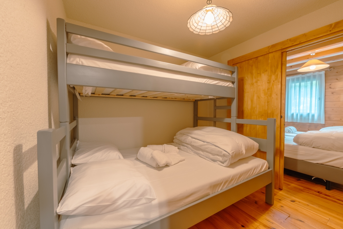 Bedroom 2: The second bedroom has a bunk bed with a double bed, an upper single bed and a wardrobe.