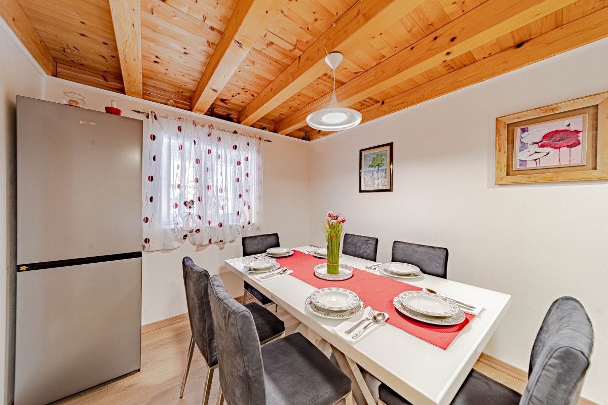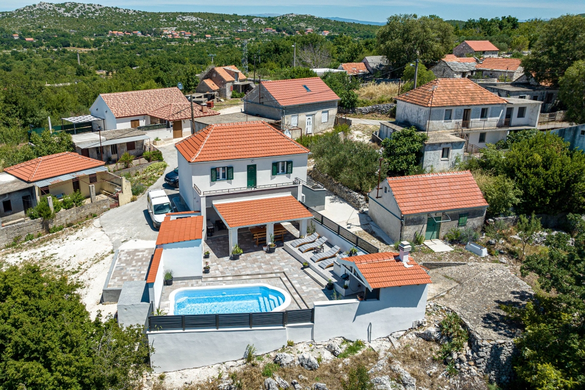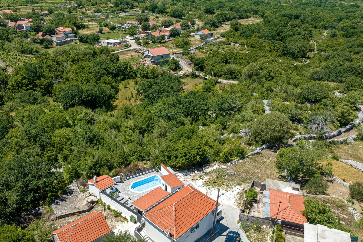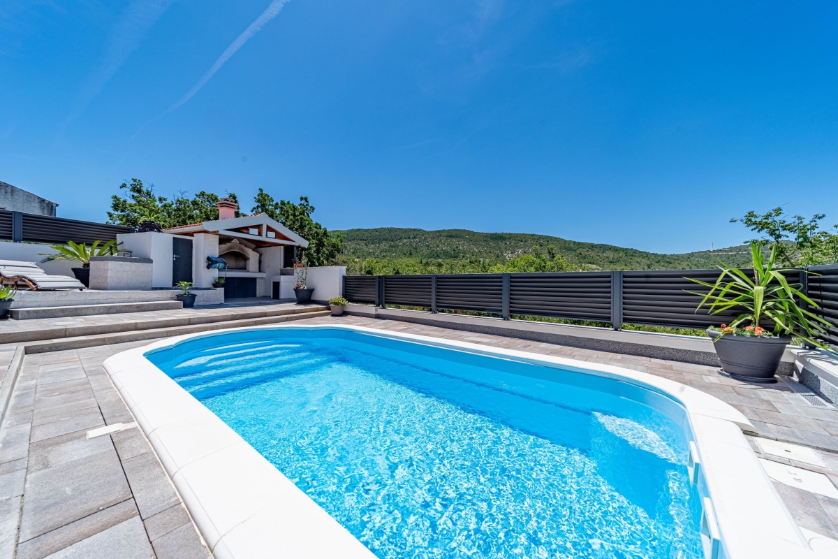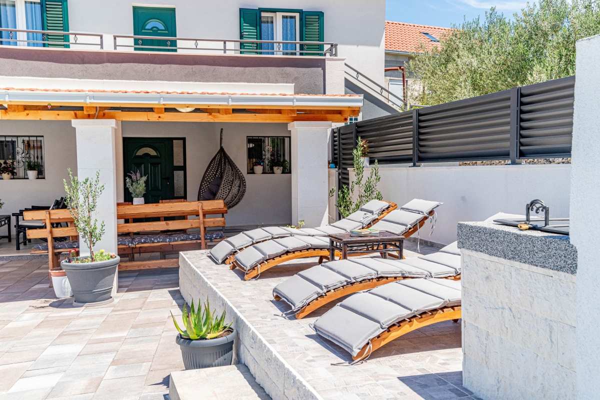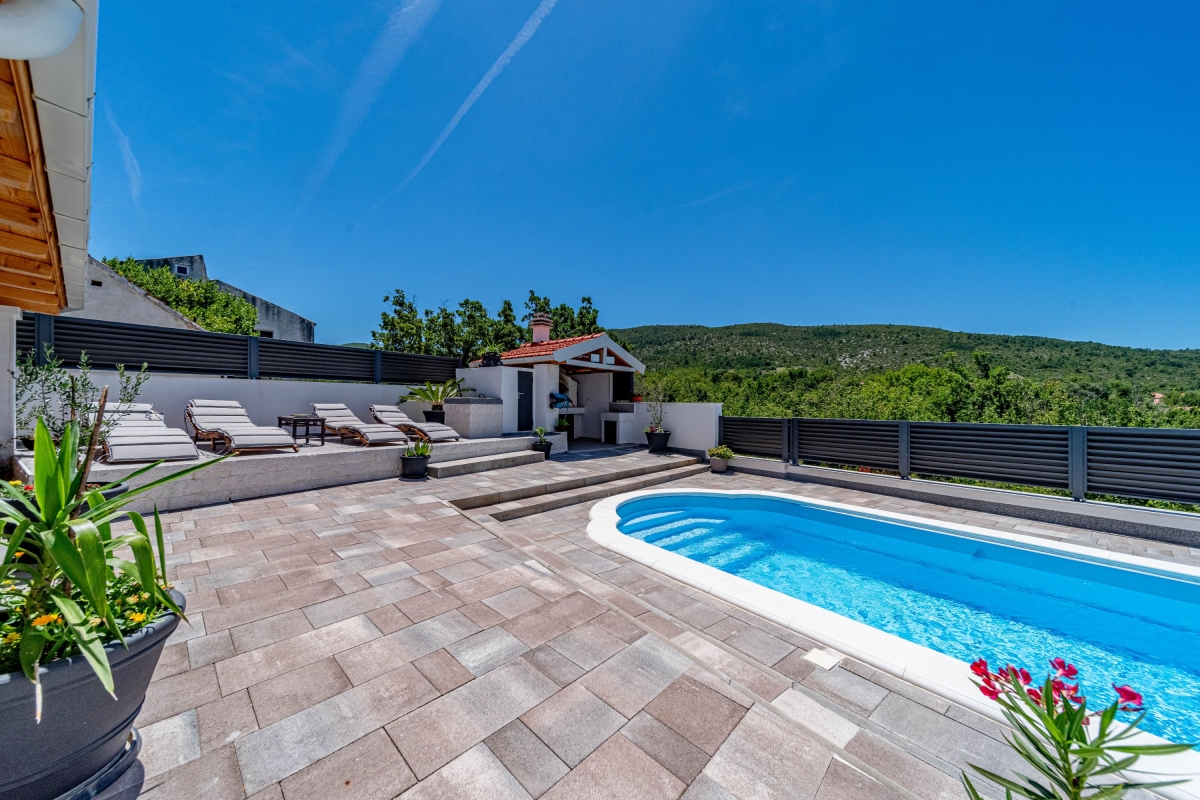 Wake up to the stunning mountain views at this magnificent apartment with a private pool and garden. Experience tranquility in this exquisite detached apartment, nestled in a lush green setting with breathtaking mountain views in Dalmatia. This air-conditioned modern villa has two bedrooms and a spacious living area across two elegantly designed floors, ideal for a group of 6. The contemporary architecture of this striking rental features warm wooden roofs that seamlessly blend with natural surroundings. As you enter, the well-arranged living room offers relaxation with its comfortable sofa, a table, a credenza and a flat-screen TV. A corridor leads you to the dining area with an open kitchen equipped with all the essentials, like a cooker hob, a coffee machine, an electric kettle, a dishwasher, a toaster, an oven, and a fridge with a freezer. Outside, guests can unwind on the sun loungers by the poolside or dip in the pool with sparkling water. The retreat also offers outside dining with a barbeque in the garden, making it perfect for a peaceful family holiday. Sleeping Bedroom 1: This bedroom enjoys outside views from the windows. It has a double bed and a single bed, a table, a chair, and a wardrobe. Bedroom 2: This bedroom is furnished with a double bed, single bed, and a wardrobe. Bathrooms Bathroom 1: The bathroom has modern fixtures and is equipped with a shower, a basin and a WC. Bathroom 2: This modern bathroom has a shower, a basin and a WC. Additional • Free WiFi • Private Parking (Car recommended) • Washing Machine • Pets not Allowed • Hair Dryer • Child-Friendly • Smoking not Allowed Please Note: Parking is in open space. Location Situated in the picturesque region of Dalmatia, Holiday Home Luce is surrounded by stunning natural beauty and rich cultural heritage. For local delicacies, restaurants are just a 5-minute drive away. Nature lovers will enjoy the Labrinska Draga hiking area, a short 12-minute drive from the apartment. For those keen to explore local attractions, Vilaja-Crni Vrh, Lokve na Blizni, Mujina Pecina, the natural history museum and Trogir Old Town are all within a 15-20-minute drive, offering a range of sights. If you’re in the mood for seaside fun, the marina and various beachside restaurants and bars are just 20 minutes away by car. The supermarket is a 20-minute drive from here, providing options for self-catering. You can also explore the local Belvedere Market, a 30-minute drive. Split International Airport is the closest, approximately 30 minutes away by car.