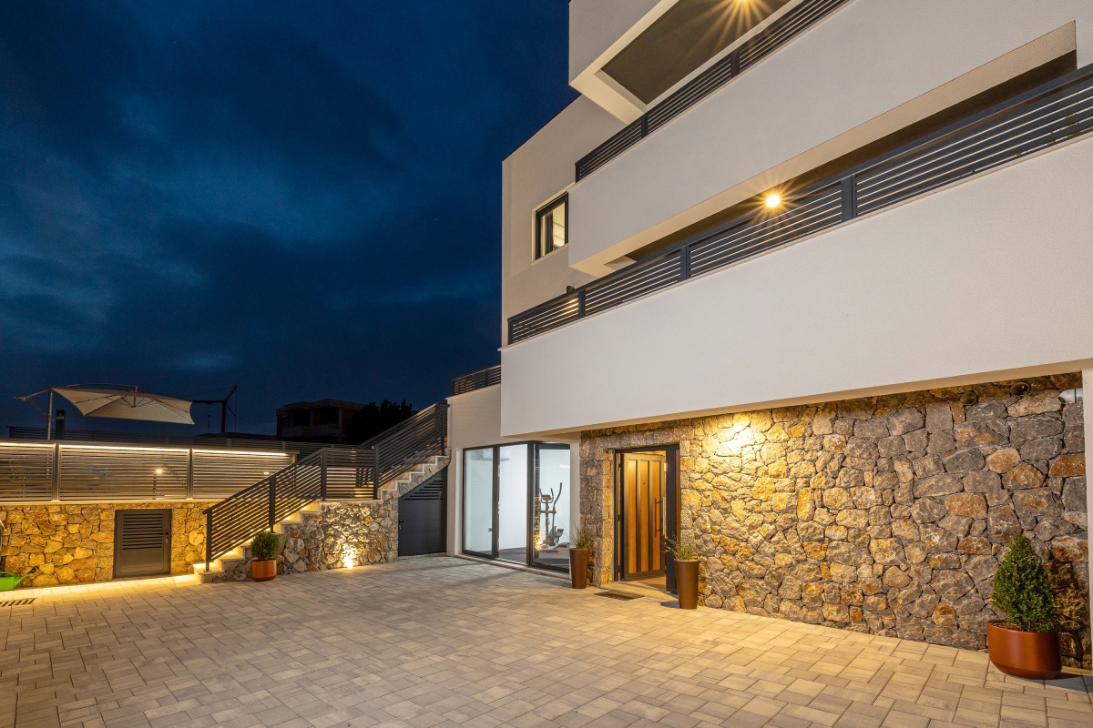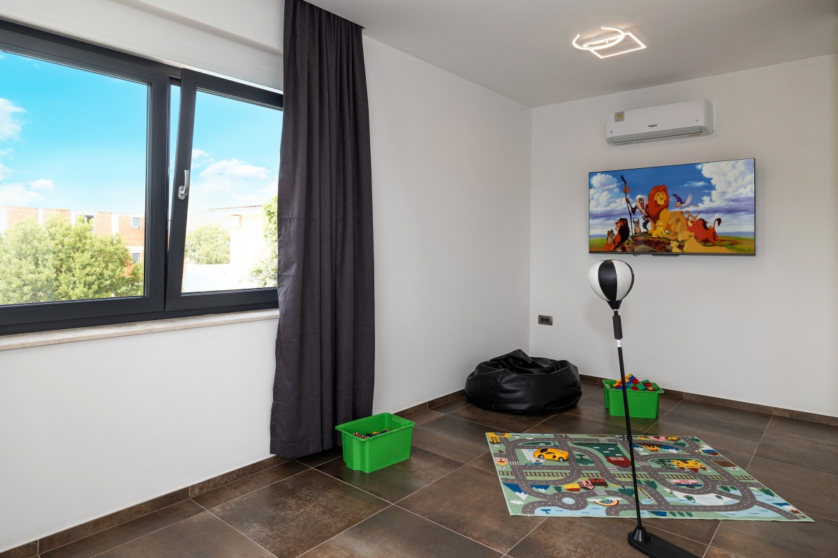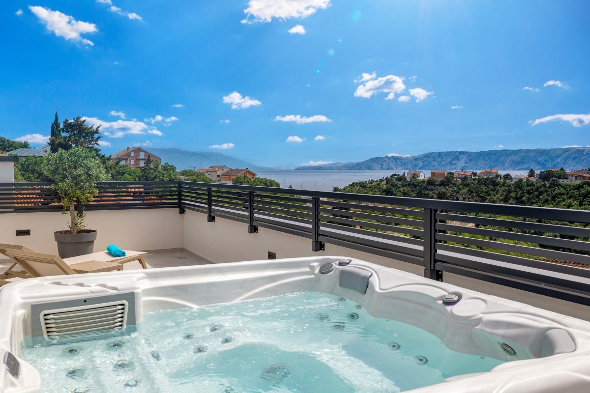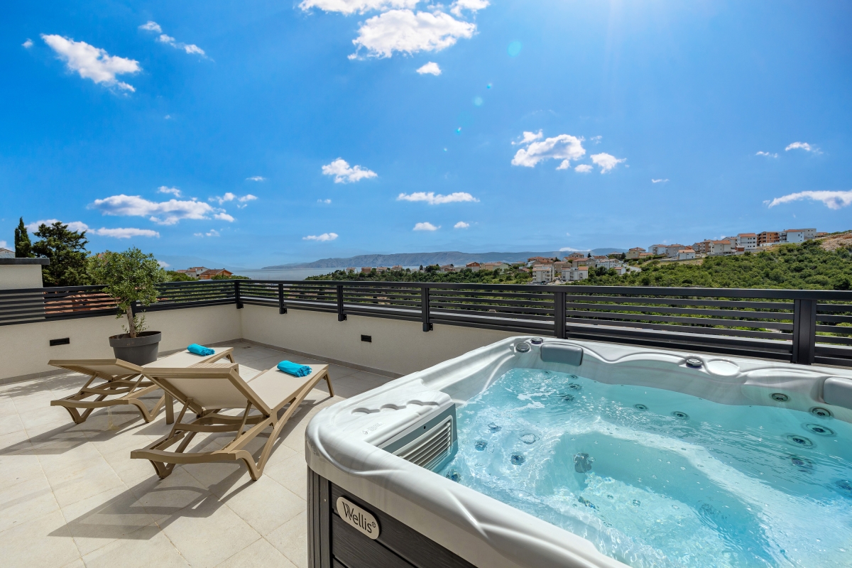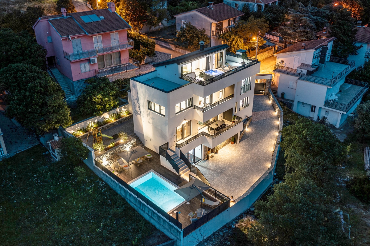 Discover unparalleled luxury just 5 minutes from the Adriatic coast at this 4-bedroom villa in Novi Vinodolski. Designed for relaxation and entertainment, this villa has it all. Relax in the private swimming pool, sauna, or jacuzzi. Enjoy the traditional konoba, a cosy spot to savour local wines and delicacies. Soak in the beautiful sea views from the private garden or terrace while sipping your morning coffee or watching the sunset. Step inside to find a seamless blend of comfort and elegance. The living area has a sofa, TV, and dining space. The kitchen features modern appliances to make meal preparation a breeze. Four bathrooms ensure privacy for all guests, while the second-floor playroom doubles as a fourth bedroom. Additionally, a gym and a children’s playground add to the luxury. With three dedicated parking spots and proximity to restaurants, shops, and beaches, this villa offers the perfect blend of luxury and convenience for a memorable vacation. Sleeping Bedroom 1: A bedroom with a king-size double bed and wardrobe. Bedroom 2: A bedroom with a king-size double bed, balcony, and wardrobe. Bedroom 3: A bedroom with a king-size double bed and wardrobe. Bedroom 4: A bedroom with 2 single beds Bathroom All 4 bathrooms feature a shower and WC. Additional• Private pool (open from 1st May to 15th October) • Jacuzzi • Gym • Private garden • Balcony • Terrace • Outside dining area • BBQ • Free Wi-Fi • Air conditioning • Fireplace • Private parking space • Garage • Smart TV • Washing machine • Full kitchen • Sea view • Pets allowed on request • Child-friendly Self-check-in: from 16:00 onwards Self-checkout: by 10:00 a.m. Please note that only one pet is allowed per booking, and an additional fee of €90 applies. Location This villa offers a prime location for exploring the stunning Adriatic coast. Guests can enjoy sunbathing and swimming in crystal-clear waters at the nearby beaches like Lopar Beach, Strand am Yachthafen, Island of St. Mark, and Cave Beach, just a 5-minute drive away. Dining out is a breeze, with several restaurants, bars, and cafes within a 5-minute drive. The lively city centre is just a 10-minute walk, where guests can explore shops, boutiques, and other local attractions. For an adventurous day out, guests can head to Adrenalin Park, just a 17-minute drive away. Head to Crikvenica Eye (a 16-minute drive) in the evening to spectate a picturesque view of Crikvenica Riveria. Nehaj Fortress, built in 1558, now converted into a museum and hosts an annual mediaeval festival, is just a 30-minute drive. The nearest airport is Rijeka International Airport, a 30-minute drive away.