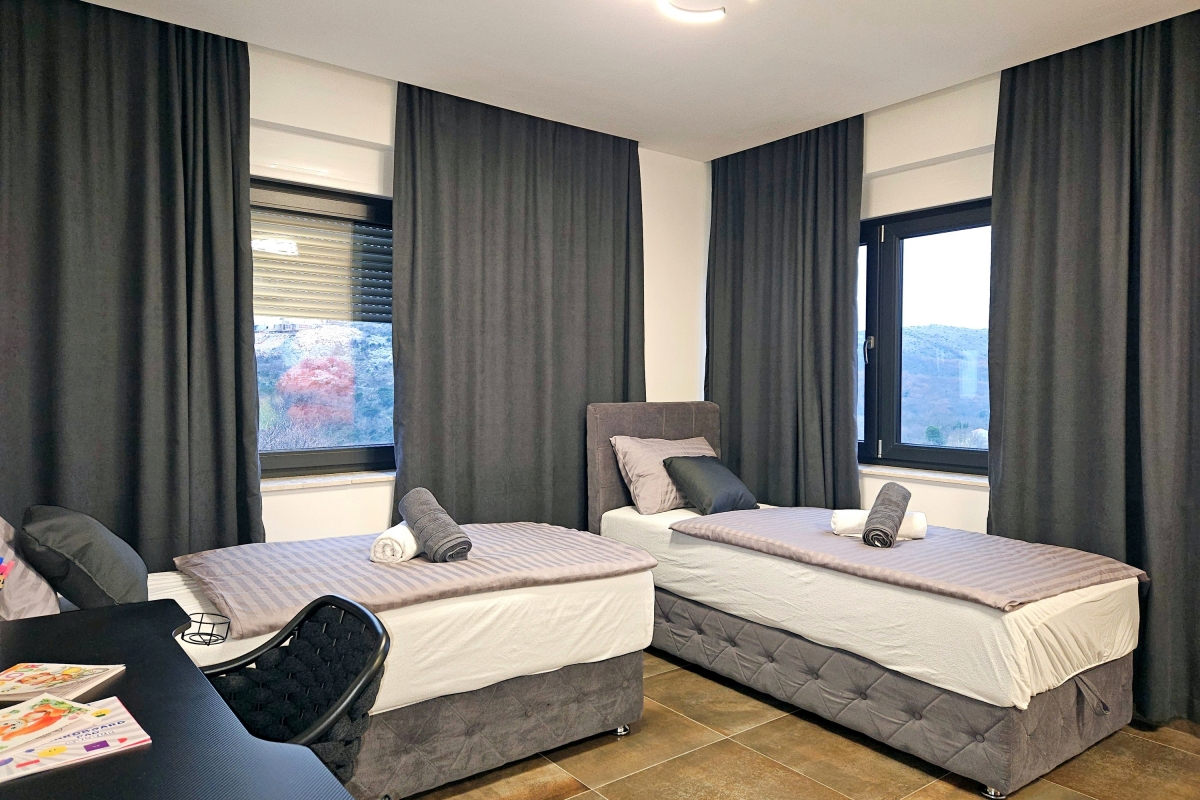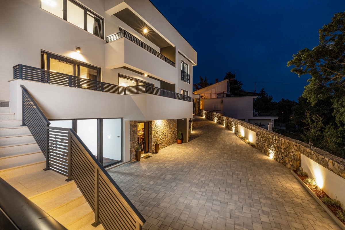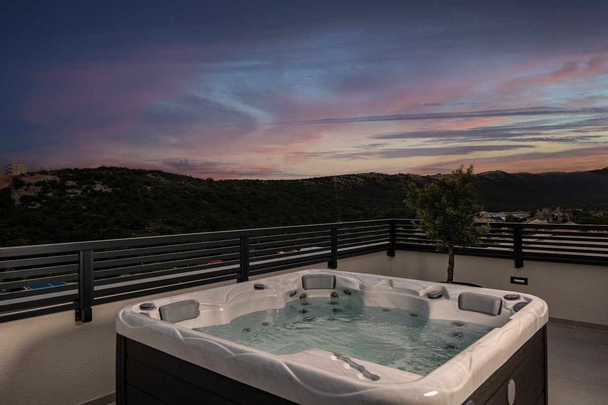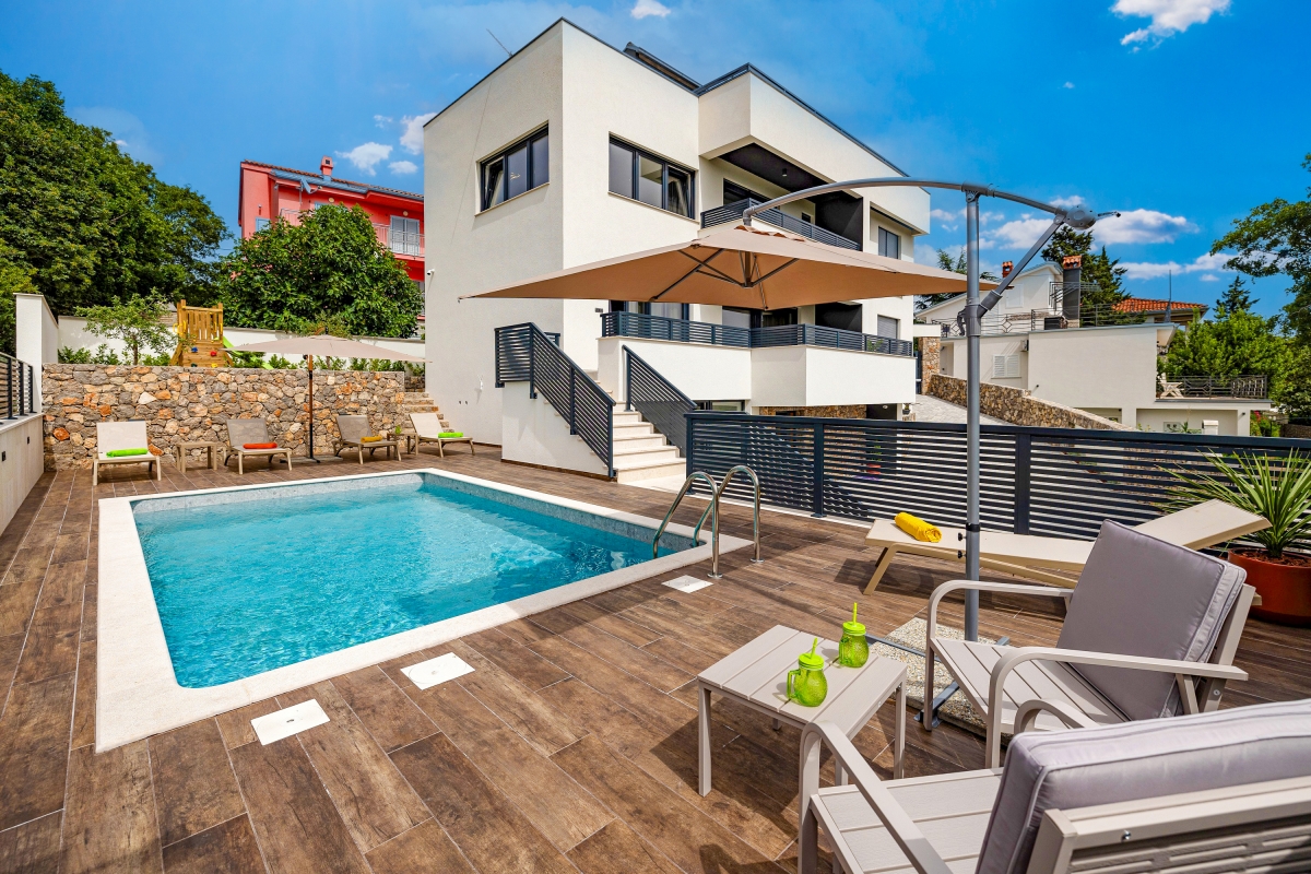 Discover unparalleled luxury just 5 minutes from the Adriatic coast at this 4-bedroom villa in Novi Vinodolski. Designed for relaxation and entertainment, this villa has it all. Relax in the private swimming pool, sauna, or jacuzzi. Enjoy the traditional konoba, a cosy spot to savour local wines and delicacies. Soak in the beautiful sea views from the private garden or terrace while sipping your morning coffee or watching the sunset. Step inside to find a seamless blend of comfort and elegance. The living area has a sofa, TV, and dining space. The kitchen features modern appliances to make meal preparation a breeze. Four bathrooms ensure privacy for all guests, while the second-floor playroom doubles as a fourth bedroom. Additionally, a gym and a children’s playground add to the luxury. With three dedicated parking spots and proximity to restaurants, shops, and beaches, this villa offers the perfect blend of luxury and convenience for a memorable vacation. Sleeping Bedroom 1: A bedroom with a king-size double bed and wardrobe. Bedroom 2: A bedroom with a king-size double bed, balcony, and wardrobe. Bedroom 3: A bedroom with a king-size double bed and wardrobe. Bedroom 4: A bedroom with 2 single beds Bathroom All 4 bathrooms feature a shower and WC. Additional• Private pool (open from 1st May to 15th October) • Jacuzzi • Gym • Private garden • Balcony • Terrace • Outside dining area • BBQ • Free Wi-Fi • Air conditioning • Fireplace • Private parking space • Garage • Smart TV • Washing machine • Full kitchen • Sea view • Pets allowed on request • Child-friendly Self-check-in: from 16:00 onwards Self-checkout: by 10:00 a.m. Please note that only one pet is allowed per booking, and an additional fee of €90 applies. Location This villa offers a prime location for exploring the stunning Adriatic coast. Guests can enjoy sunbathing and swimming in crystal-clear waters at the nearby beaches like Lopar Beach, Strand am Yachthafen, Island of St. Mark, and Cave Beach, just a 5-minute drive away. Dining out is a breeze, with several restaurants, bars, and cafes within a 5-minute drive. The lively city centre is just a 10-minute walk, where guests can explore shops, boutiques, and other local attractions. For an adventurous day out, guests can head to Adrenalin Park, just a 17-minute drive away. Head to Crikvenica Eye (a 16-minute drive) in the evening to spectate a picturesque view of Crikvenica Riveria. Nehaj Fortress, built in 1558, now converted into a museum and hosts an annual mediaeval festival, is just a 30-minute drive. The nearest airport is Rijeka International Airport, a 30-minute drive away.