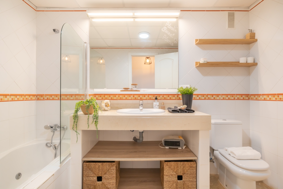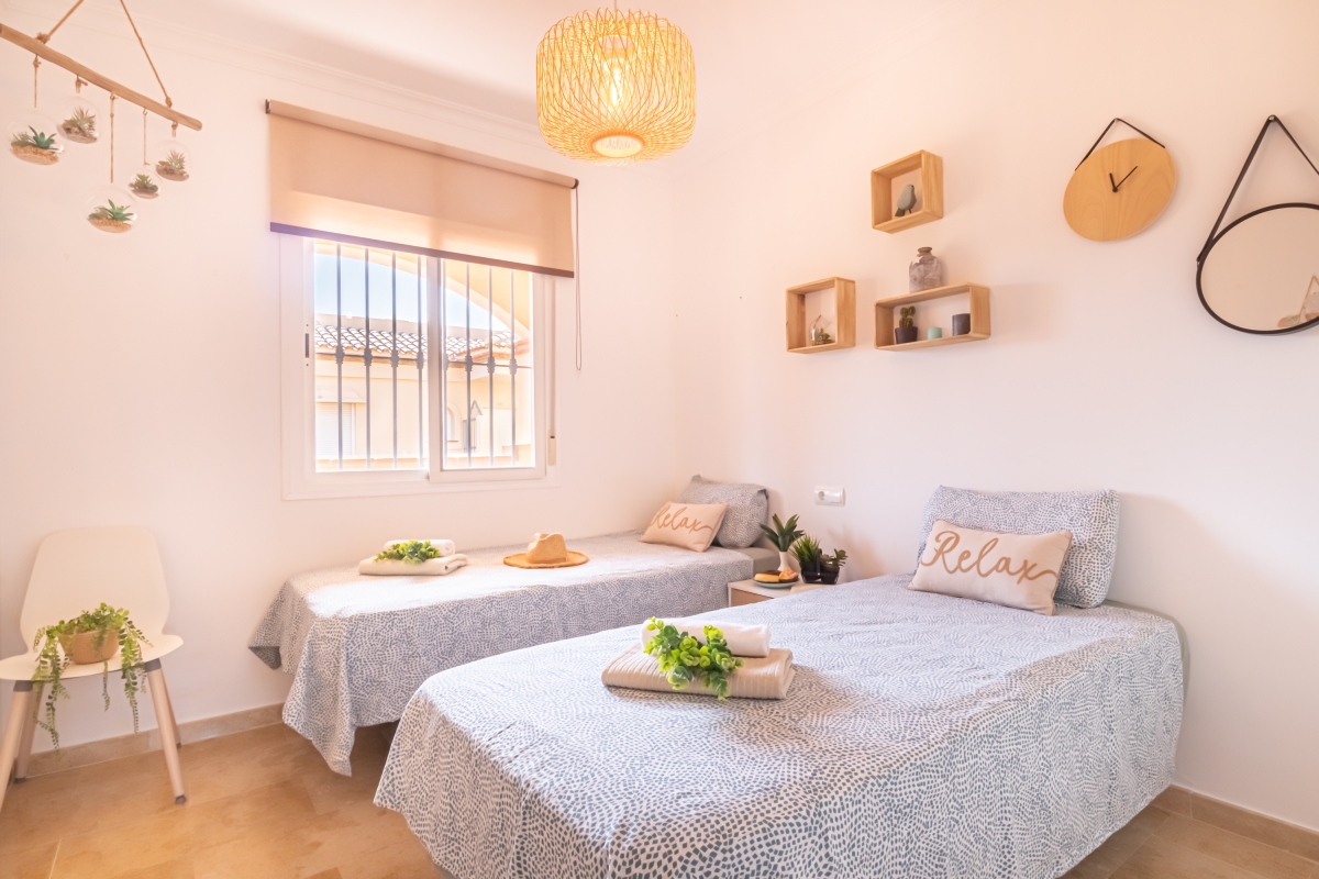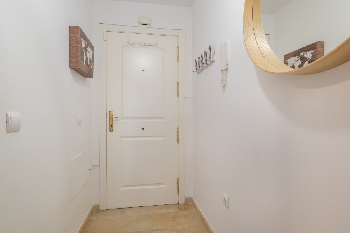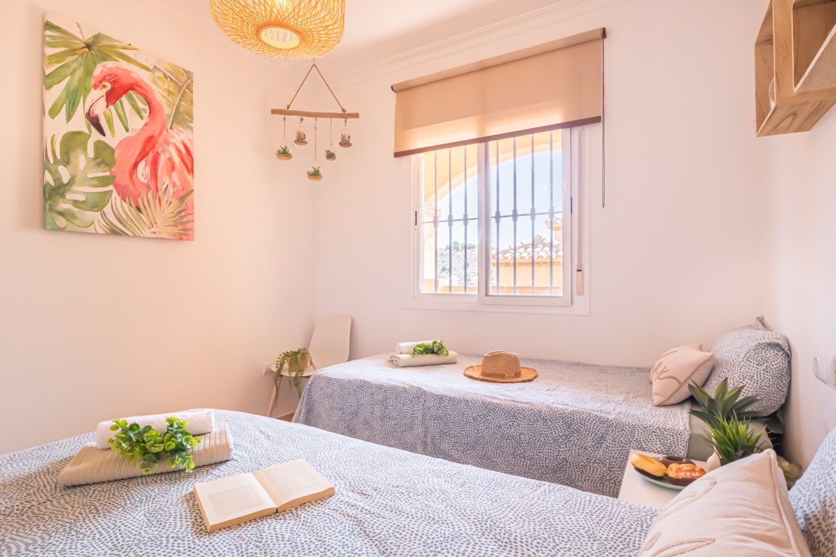 Escape to luxury and modern comfort with this fabulous apartment in the tranquil Mijas Golf area! With air-conditioned interiors, this exquisite second-floor property features a chic and modern design with a cosy lounge diner with a Smart TV connected to skyTV and comfortable seating, perfect for unwinding after a day of exploration. The separate kitchen is fully equipped with an induction hob, oven, coffee machine, and more, ensuring a seamless culinary experience. The interiors are further equipped for every taste and preference, featuring a laptop-friendly workplace, free Wi-Fi and a book library. Outside, step out onto the breezy private terrace, furnished with an outdoor dining area and chairs, and comfy sun loungers to sunbathe and relax in the peaceful, mountain-view surroundings. The apartment offers two elegant, air-conditioned bedrooms and two modern bathrooms, providing a comfortable stay for up to four guests. Enjoy access to a shared pool and garden, ideal for relaxing under the Spanish sun. Sleeping Bedroom 1: An en-suite bedroom with twin joinable beds and ample wardrobe space. Bedroom 2: A comfortable double bedroom with 2 single beds Bathroom Bathroom 1: The en-suite bathroom has a Jacuzzi and WC. Bathroom 2: A common family bathroom fitted with a shower and WC. Additional • Free WiFi • Central heating • Air conditioning • Washing machine • Shared garden • Private parking space • Smoke detector • Carbon monoxide detector • Books library • Terrace • Lift/elevator • Shared pool (unheated) • Iron facilities • Garage • Outside dining area • Smart TV • Sky TV • Fenced garden • Laptop-friendly workspace • Pets allowed • Child-friendly • Suitable for the elderly • Smoking not permitted Location The holiday home offers a peaceful escape while being conveniently close to essential amenities. Local grocery stores and charming dining options are within a 10-minute drive. Also within 10 minutes are golf courses La Santana and Mijas Golf International, Mijas Buggy Tours and ATV Adventures Costa del Sol. For those exploring by car, the bustling town of Fuengirola, with its vibrant beach Playa de los Boliches and nightlife, is only a 15-minute drive. Nature and wildlife enthusiasts will enjoy nearby hikes such as the Sierra de Mijas, reachable within 20 minutes by car or a visit to the Fuengirola Bioparc. The charming squares and towns like the white-washed Mijas Pueblo are just 25 minutes away by car, meanwhile, the bustling city of Málaga is a 30-minute drive. The closest international airport is Málaga-Costa del Sol Airport, approximately 25 minutes by car, making this an accessible and ideal location for a memorable holiday.