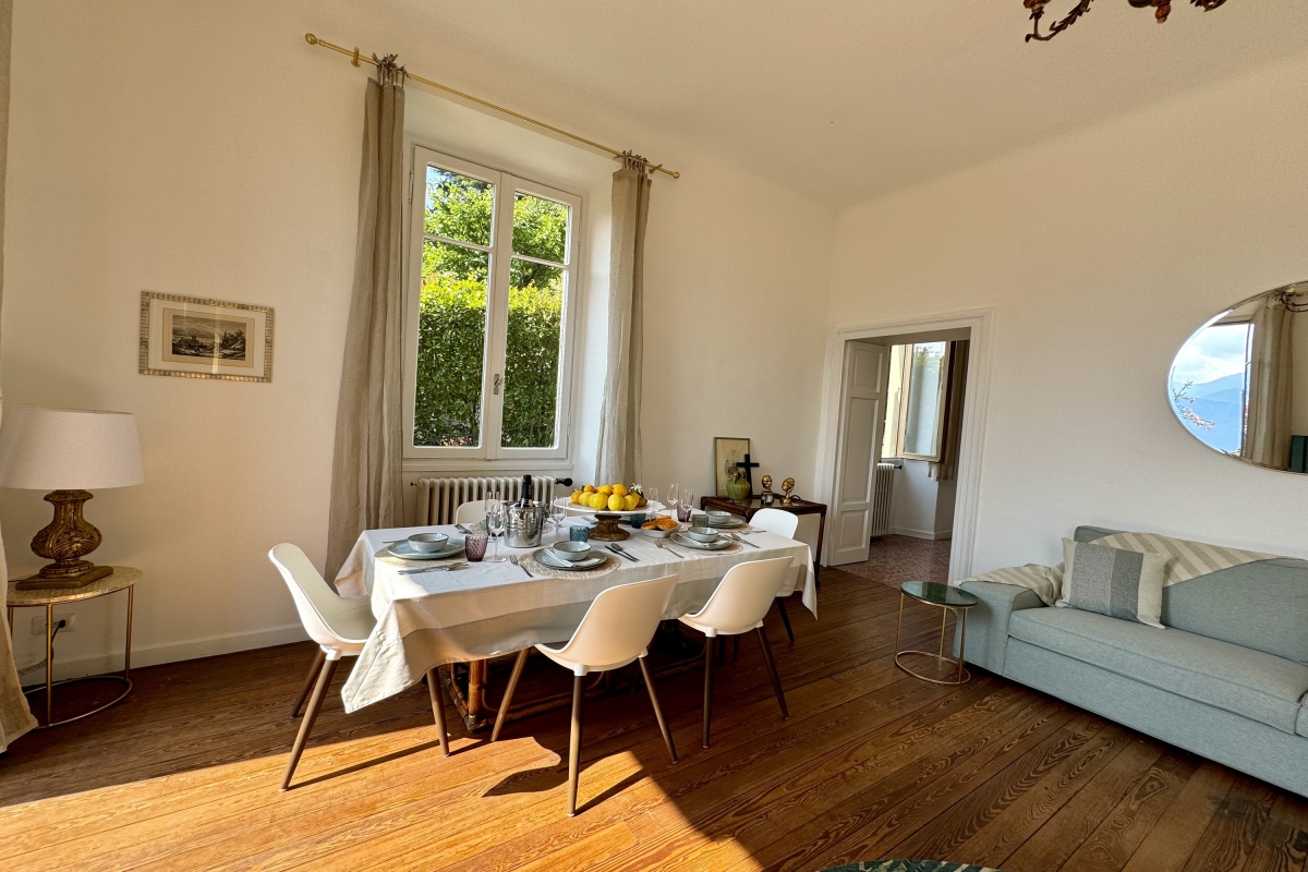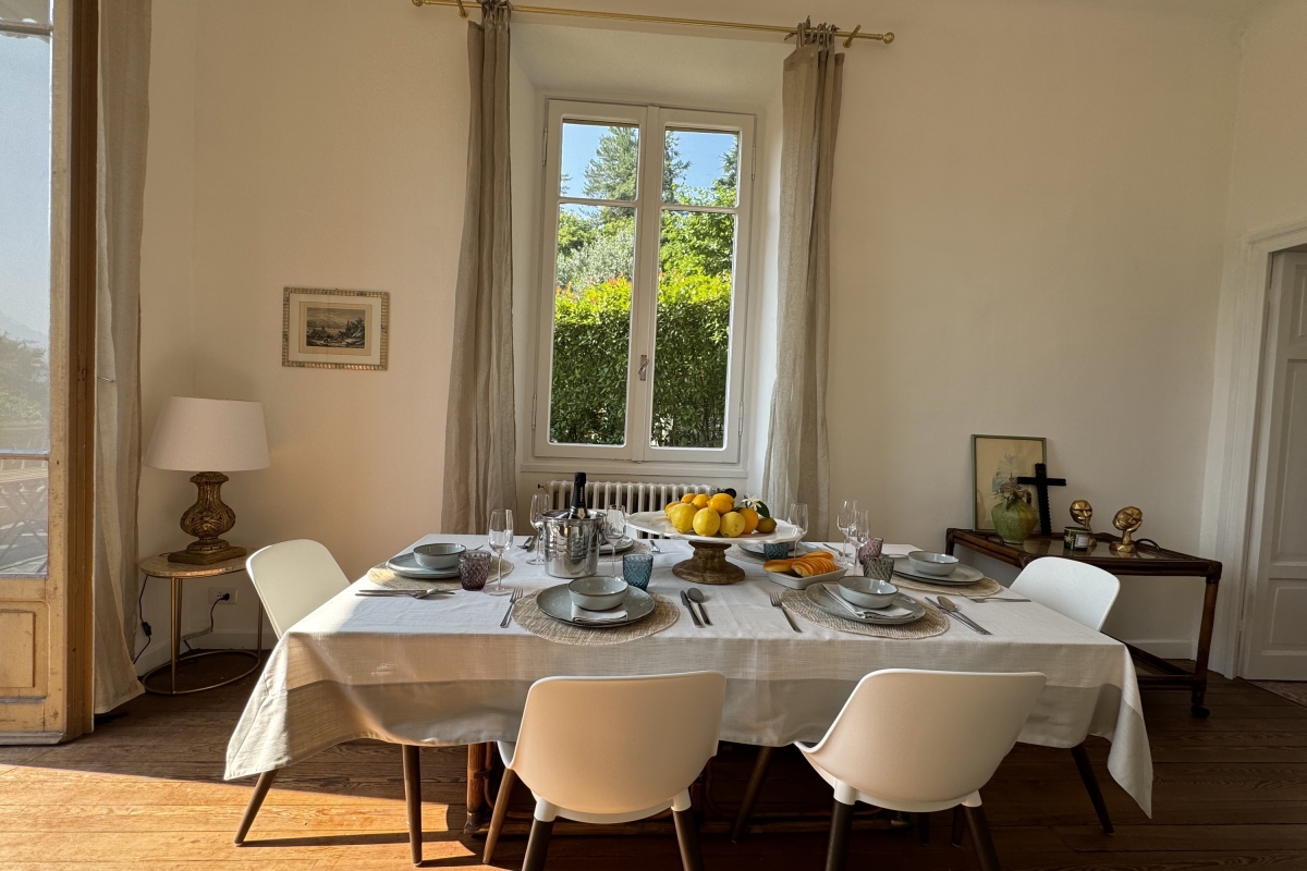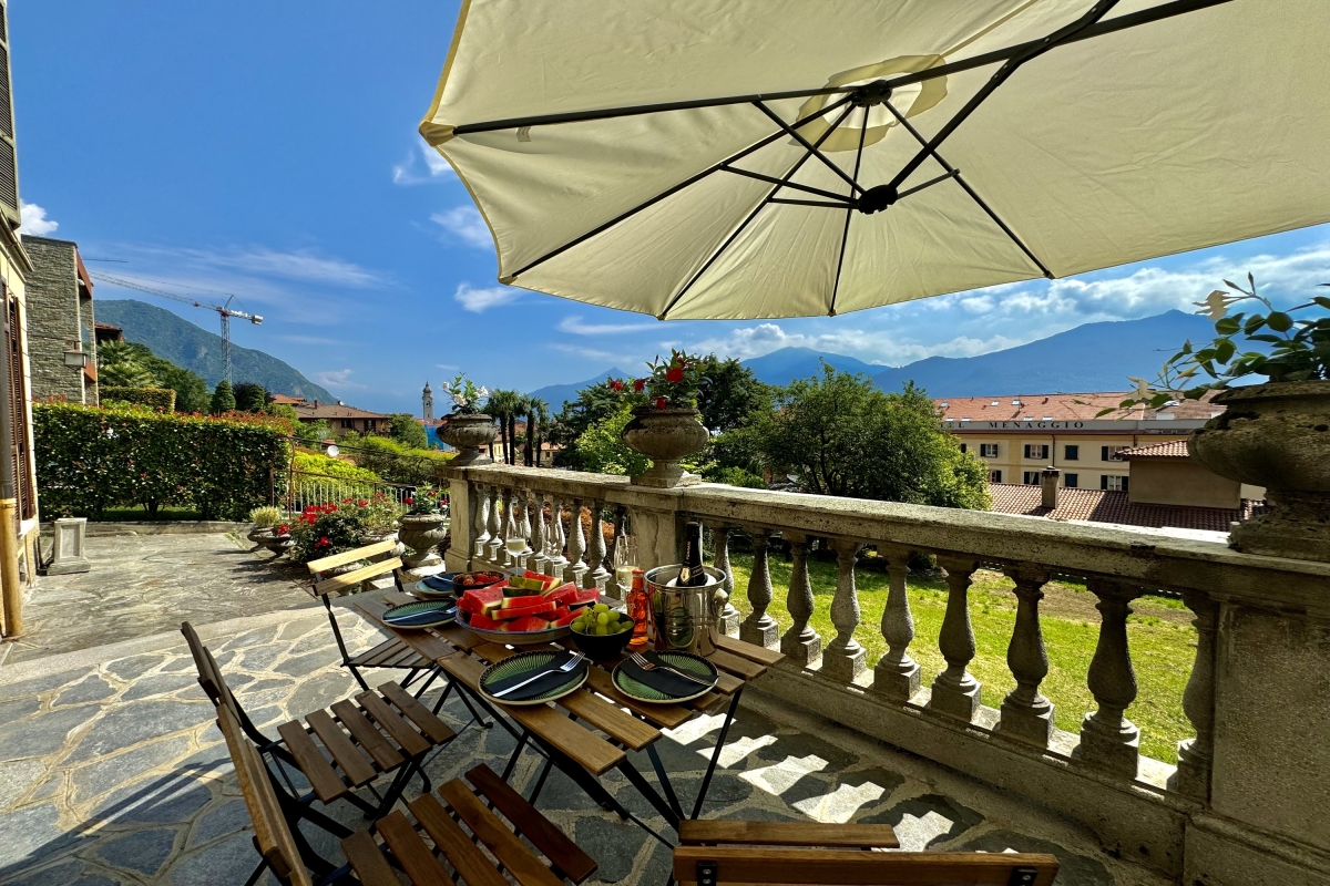 Enjoy “la dolce vita” in this stunning apartment just 3 minutes from the shores of Lake Como. On the ground floor of a charming condominium, with wonderful lake views, this is an apartment for 8 and makes the perfect holiday home from home for families or friends. The interiors are elegantly contemporary, with stylish furniture throughout. The living/dining room has beautiful high ceilings and two French windows that open directly onto the large terrace. The room is furnished with 2 sofas, a flat-screen TV and a dining table and chairs. The spacious modern kitchen, which is across the hallway from the dining area, is very well-equipped with a cooker hob, oven, microwave, dishwasher, fridge, freezer and coffee machine. There is also a small table and stools for quick snacks on the go. Outside the living room is the private terrace with the original stone balustrade and stunning across Lake Como to the mountains beyond. The terrace is furnished with a café-style table and chairs shaded by a large parasol. An elegant flight of stone stairs leads from the terrace down to the well-tended shared garden. Sleeping The villa has 4 stylish bedrooms in total. Two of these are furnished with double beds and have storage for guests’ clothes and belongings. These rooms both overlook the lake. The other 2 bedrooms have 2 single beds in each. Bathrooms The spacious modern bathroom has a full bath with shower, basin, bidet and WC There is a 2nd bathroom with a WC and basin. Additional • Terrace • Outside seating • BBQ • Shared garden • Free wifi • Air conditioning • Central heating • Hair dryer • Washing machine • Smoke & Co detectors • Fire extinguisher • Child friendly • Garage parking – car not necessary - Pets not allowed Location The apartment is tucked away up 80 steps in a quiet part of Menaggio. It is within walking distance from several good restaurants as well as shops and the town’s beaches. Guests can take a ferry from Menaggio’s port (3-minute walk) to Varenna or on to Bellagio and spend a day in these famously beautiful towns. For visitors who are looking for more excitement, there is Lake Como Adventures (40-minute drive), for a wide range of activities including climbing, canyoning, hiking and skiing in the winter months. In addition, guests can try sailing at Nobiallo (6-minute drive) or golf at Golf Club Menaggio Cadenabbia (10-minute drive) If the delicious local restaurants and cafés inspire you to try your hand in the kitchen, the local farmers market in Via Stoppani (7-minute walk) takes place in the morning on the 2nd and 4th Friday of the month. Here you will find an abundance of local fresh fruit and vegetables, cold cuts and artisanal cheeses. Alternatively there is a supermarket 3 minutes away. Milan’s international Linate airport is a 1 hour 40-minute drive from the apartment and Milan Malpensa airport 1 hour and 25 minutes away.