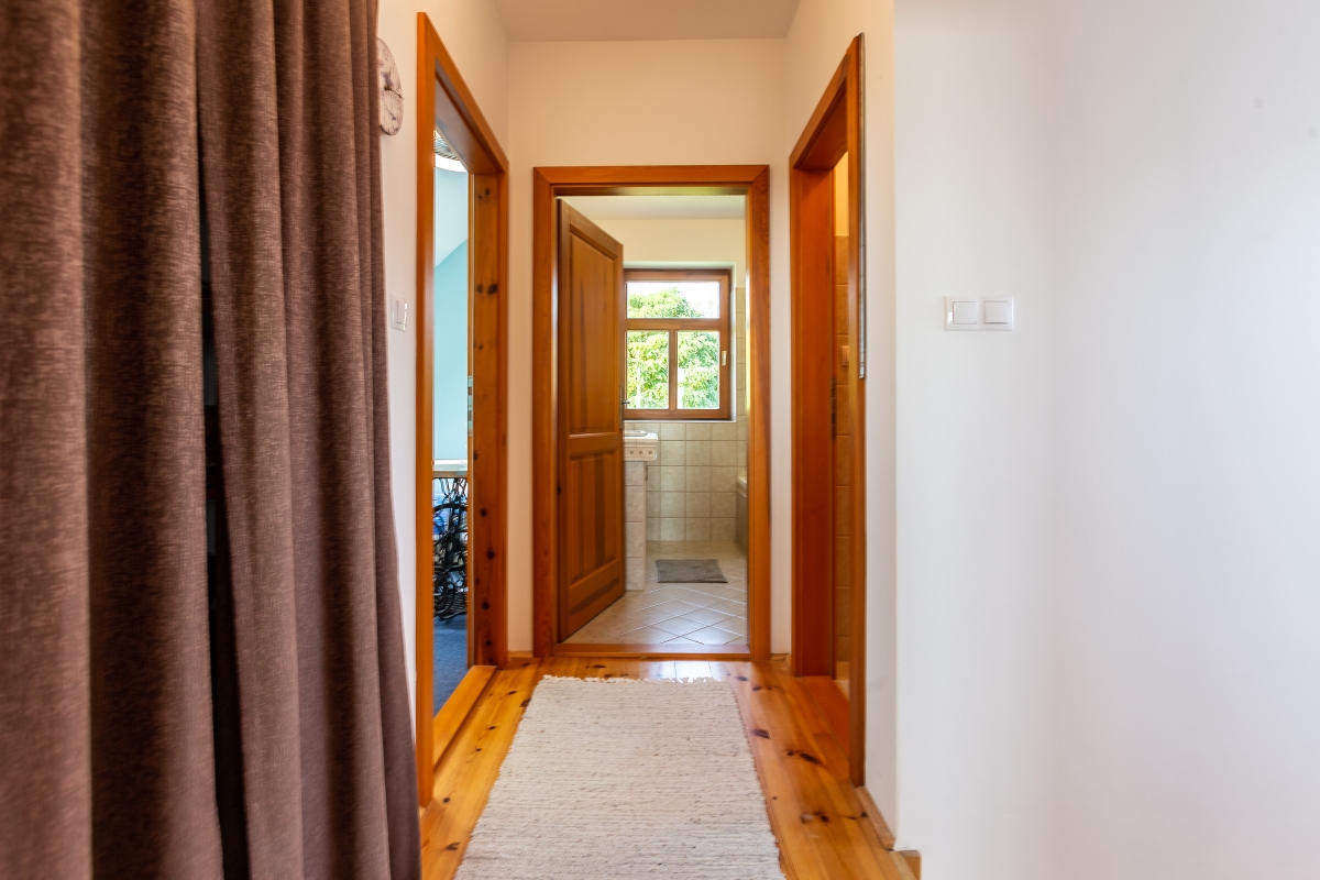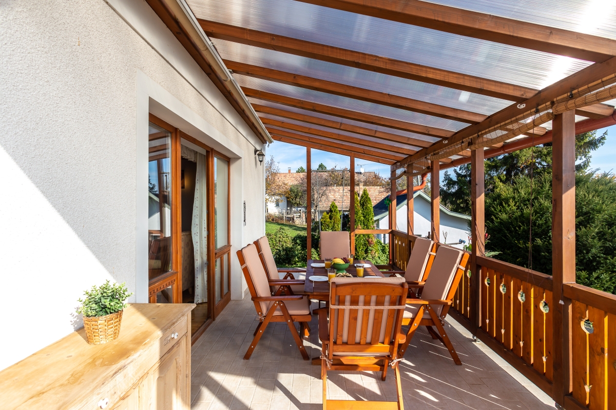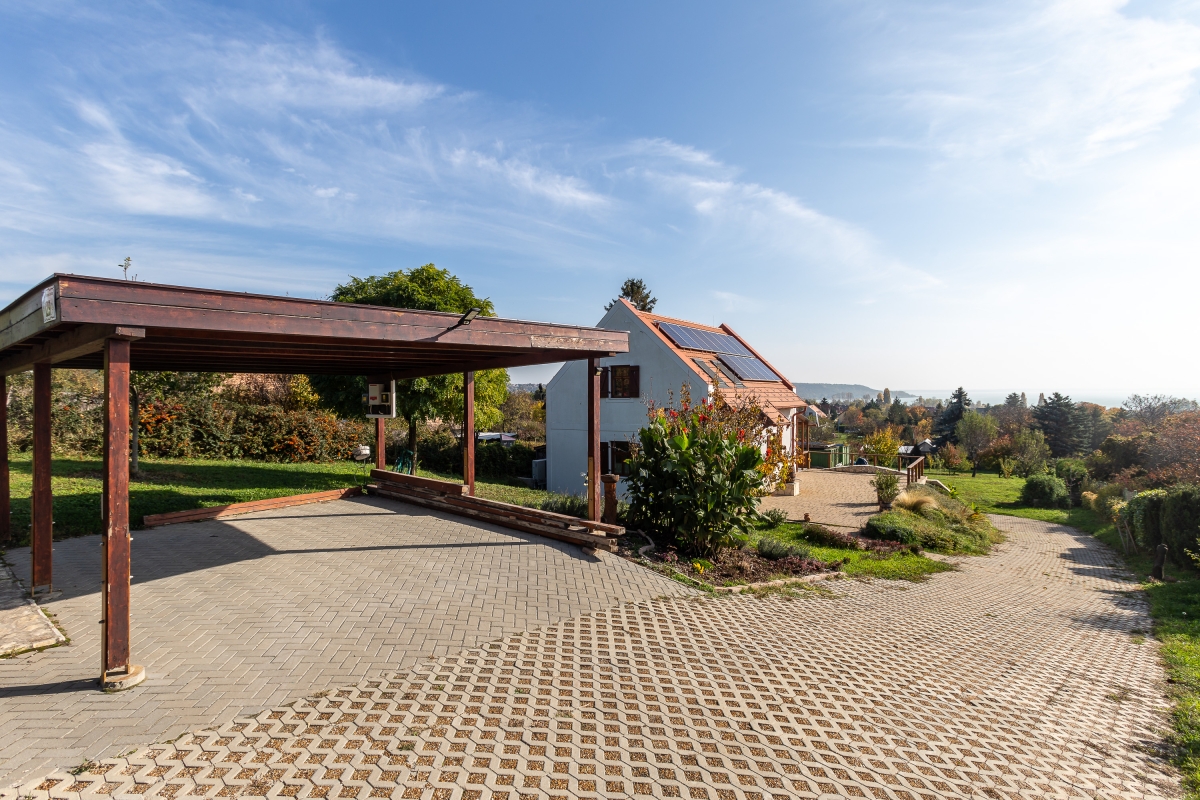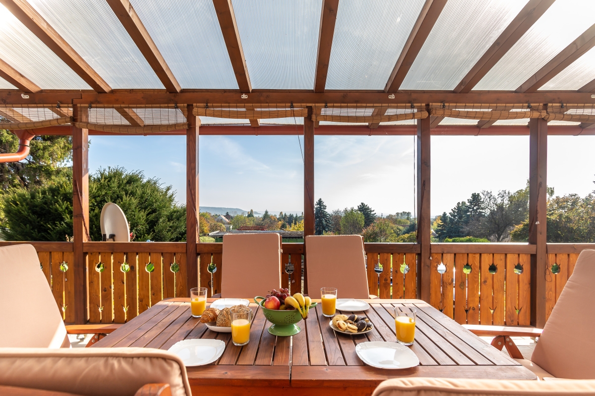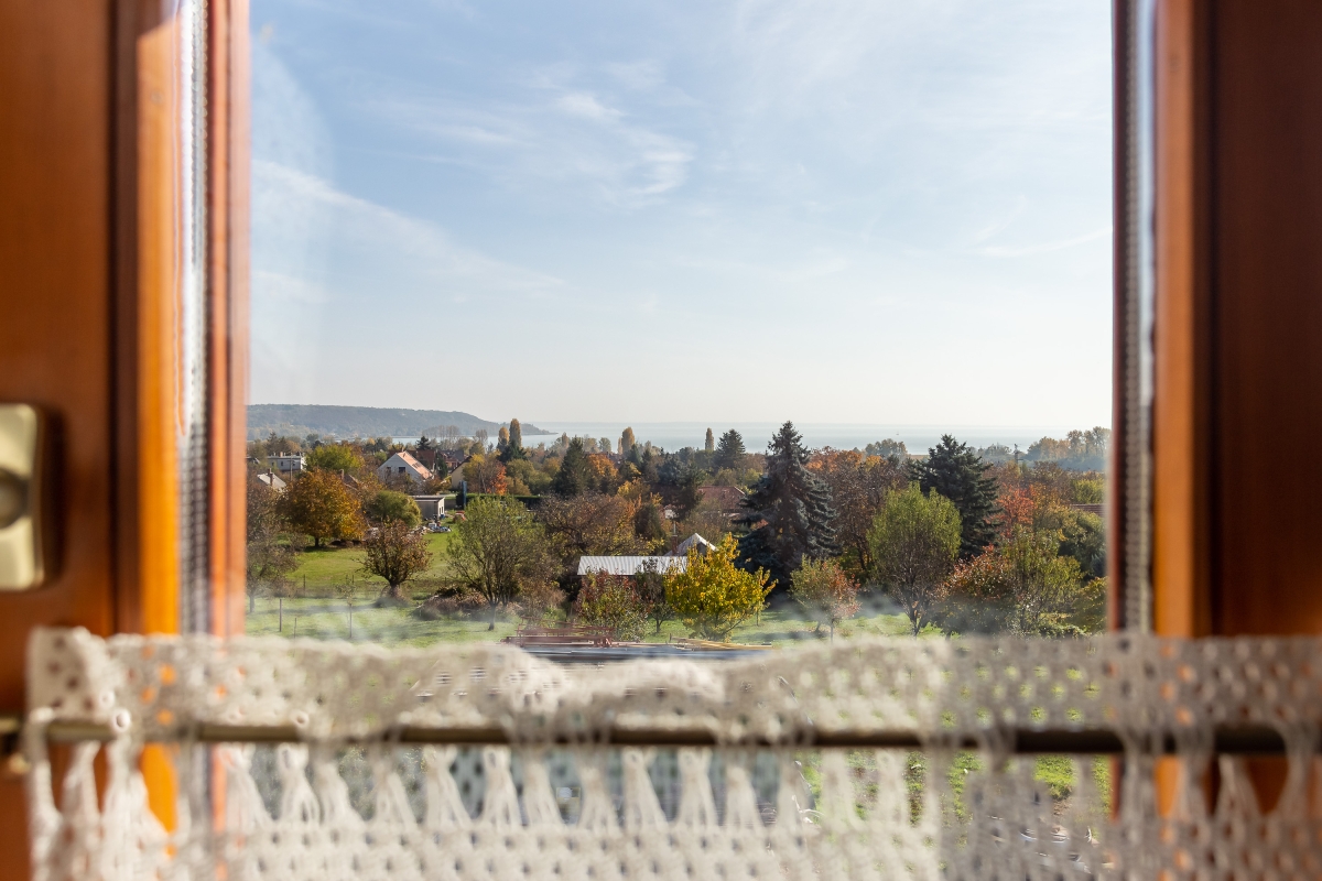 Escape to one of the most beautiful areas of Hungary, in this charming holiday home for 6. The house is a stunning mix of contemporary and traditional architecture, set in private gardens with panoramic views of Lake Balaton. It is the ideal base for an action-packed vacation for all ages. On the ground floor, there is a spacious, open-plan living/dining and kitchen area, with wooden floors throughout and rustic open brickwork. The seating area includes two comfortable sofas, an armchair and a coffee table. The wooden dining table seats 6 people and is next to the French windows which open onto a shaded balcony with stunning vistas of the lake. On the balcony, there is another dining table for meals al fresco and a fun swing chair. Back inside, the wooden, fitted kitchen is well-equipped with an induction hob, oven, microwave, dishwasher, Dolcegusto coffee machine and fridge/freezer. The fenced garden, with its extensive lawns and shrubs, is ideal for children and pets. Sleeping Bedroom 1: The airy master bedroom is furnished with a double bed, wardrobe and lovely view of the lake. Bedroom 2: The second bedroom has 2 single beds which can be joined, a wardrobe and lake views. Bedroom 3: This cosy bedroom has a double sofa bed which suits an adult or 2 children. Bathroom The spacious bathroom is fitted out with a full bath with a separate shower, basin and washing machine. The WC is separate. There is a second WC off the entrance hall. Additional • Free WiFI • Outside dining area • Private, fenced garden • Terrace • Air conditioning • Washing machine • Hair dryer • Smoke detector • Private parking for 2 cars - car recommended • Pets allowed (medium-sized dogs) • Child-friendly • Suitable for elderly guests • Smoking permitted in outside spaces • Access to the house is via 350-400metres of gravel road • The owner has access to the holiday property to reach a separate plot Location The house is in a quiet part of Balatonalmadi, just a 4-minute drive from Tobruk Beach on Lake Balaton. The lake is a centre for watersports including sailing, paddleboarding, windsurfing and kayaking. On land, the famous cycle route around the whole of Lake Balaton means that many places can be explored by bike. Away from the lake is the town of Veszprem (20 minutes), which was the European Cultural Capital in 2023. It makes a great day trip with plenty to see including the castle and zoo. The town hosts many different festivals throughout the year. For more excitement try the Balatoni Bob leisure park (4 minutes). Here visitors can try climbing, archery and other fun activities. Guests will find a range of restaurants to suit all budgets in the centre of Balatonalmadi (10 minutes). For self-catering there is a supermarket in the town (5 minutes) Balatonalmadi is 1 hour from Budapest city and Budapest International Airport is 1 hour 22 minutes by car.