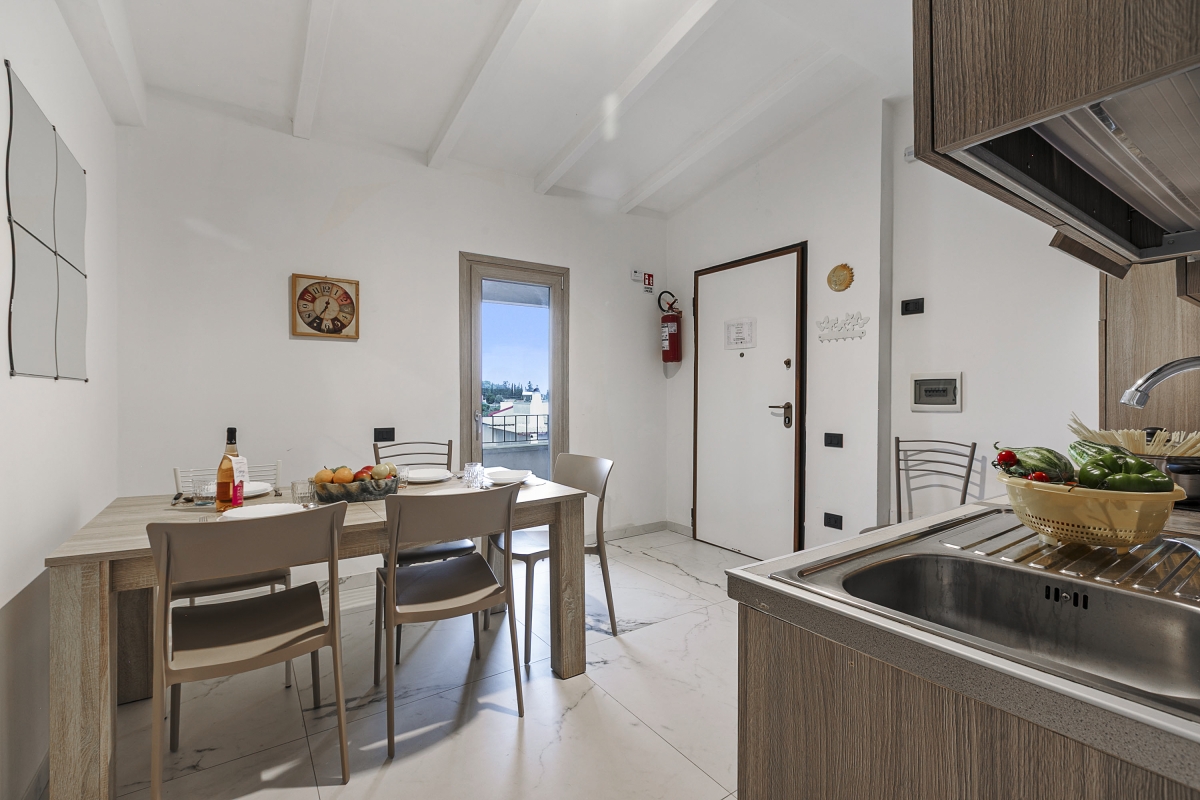 The apartment includes an airy, open-plan kitchen/dining area. It is furnished with a dining table and chairs and a new, fitted kitchen. The kitchen is equipped with a cooker hob, fridge/freezer and a Mokka coffee machine. A glass door leads from the dining area out to a shaded balcony which serves as an outdoor dining room so guests can enjoy meals al fresco.