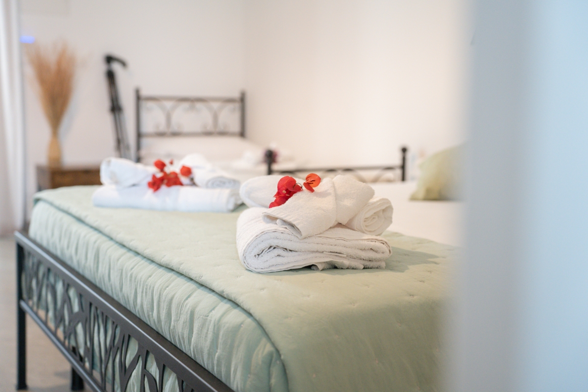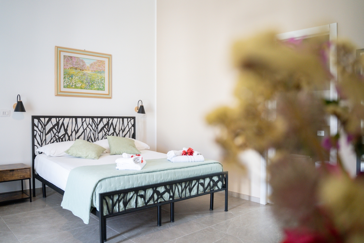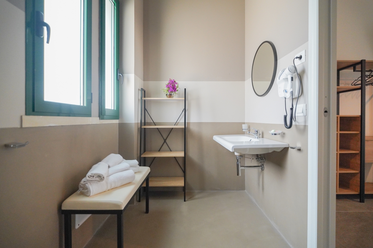 If you are looking to relax in peaceful surrounding, then this Superior Room at Masseria San Biagio is the perfect option. This stylish modern bedroom can sleep 2 - 3 people. In the heart of Salento, set in beautiful grounds with a large swimming pool, it is the ideal base for visitors who want to explore this scenic part of Puglia. On the first floor, with direct access to the extensive terrace and shaded seating areas, the spacious room is furnished with a double bed, wardrobe, writing desk, mini-fridge and flat-screen TV. An additional single bed can be added for a third guest. Masseria San Biagio’s gardens and outside spaces have been created with as much care and attention as the interiors. Guests can enjoy breakfast outside, with honey from the bees on the estate and homemade marmalade. The owners have laid out different paths around the grounds, which range from the scents path through aromatic herbs and flowers; to the historical path which leads to the chapel of San Biagio which is over 1000 years old and the fitness path for more energetic guests. The large swimming pool is surrounded by an extensive terrace, furnished with sun loungers, umbrellas and seating areas. It makes the ideal spot to relax in the sun after a refreshing dip.There is also a massage and well-being centre on site where guests can have a soothing massage or other treatments. Sleeping The living room has a double bed. Bathroom The separate bathroom is appointed with a shower, basin, bidet and WC. Additional • Free Wifi • Shared outdoor swimming pool (open 1st June to 1st September) • Shared gardens • Outside dining - breakfast is included • Air conditioning • Flatscreen TV • Mini bar • Smoke & CO detectors • Fire extinguisher • Hair dryer • Private parking - car essential Location If you can tear yourself away from the tranquil gardens then the historic centre of Calimera is just a 5-minute drive. The town is known for its traditional white houses as well as palaces and beautiful churches. Calimera’s weekly market takes place on Thursday and is the best place to pick up the freshest local delicacies and experience authentic Puglian life. Salento’s most beautiful beaches are all within easy reach. The beaches at Otranto (25 minutes), Porto Cesareo (45 minutes) and Gallipoli (45 minutes) are known for their pristine sea and shallow waters, ideal for younger children and snorkelling. Golfers will enjoy the two courses near the town of Acaya (20 minutes) or for more exercise and a hike through unspoilt Mediterranean countryside, there is the WWF nature reserve of Le Cesine (25 minutes). The closest airport is at Brindisi - just 55 minutes away by car.