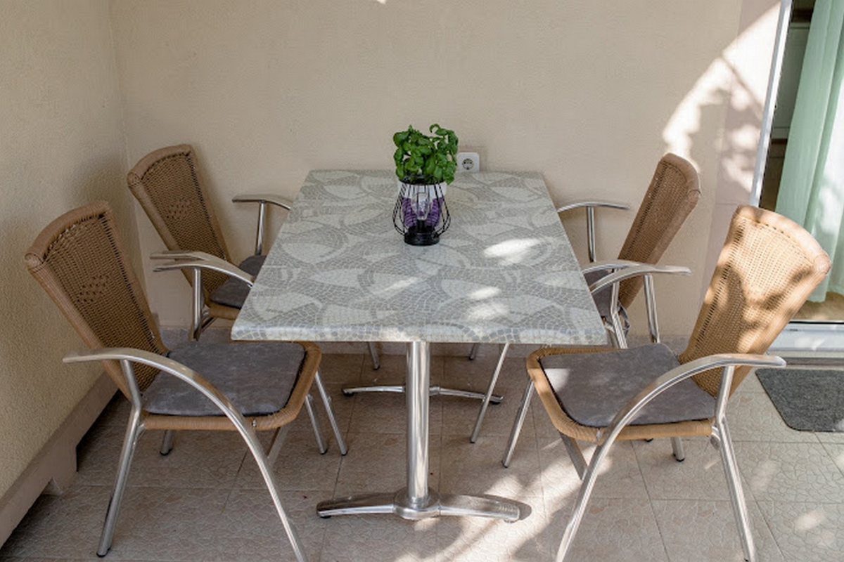 We stayed next to the owner on the ground floor, the terrace was a dream, filled with runner plants that were providing cool and shade from the heat, giving the terrace a very private feeling and there was no need for any other shade. It looked just lovely and we loved having our meals there. The owner is the cutest most generous lady, she would surprise us every day with some fresh vegetables or fruit, I ate the best huge tomatoes ever there. The apartment was very clean, I loved the very well equiped kitchen and especially the dishwasher. We will be back.