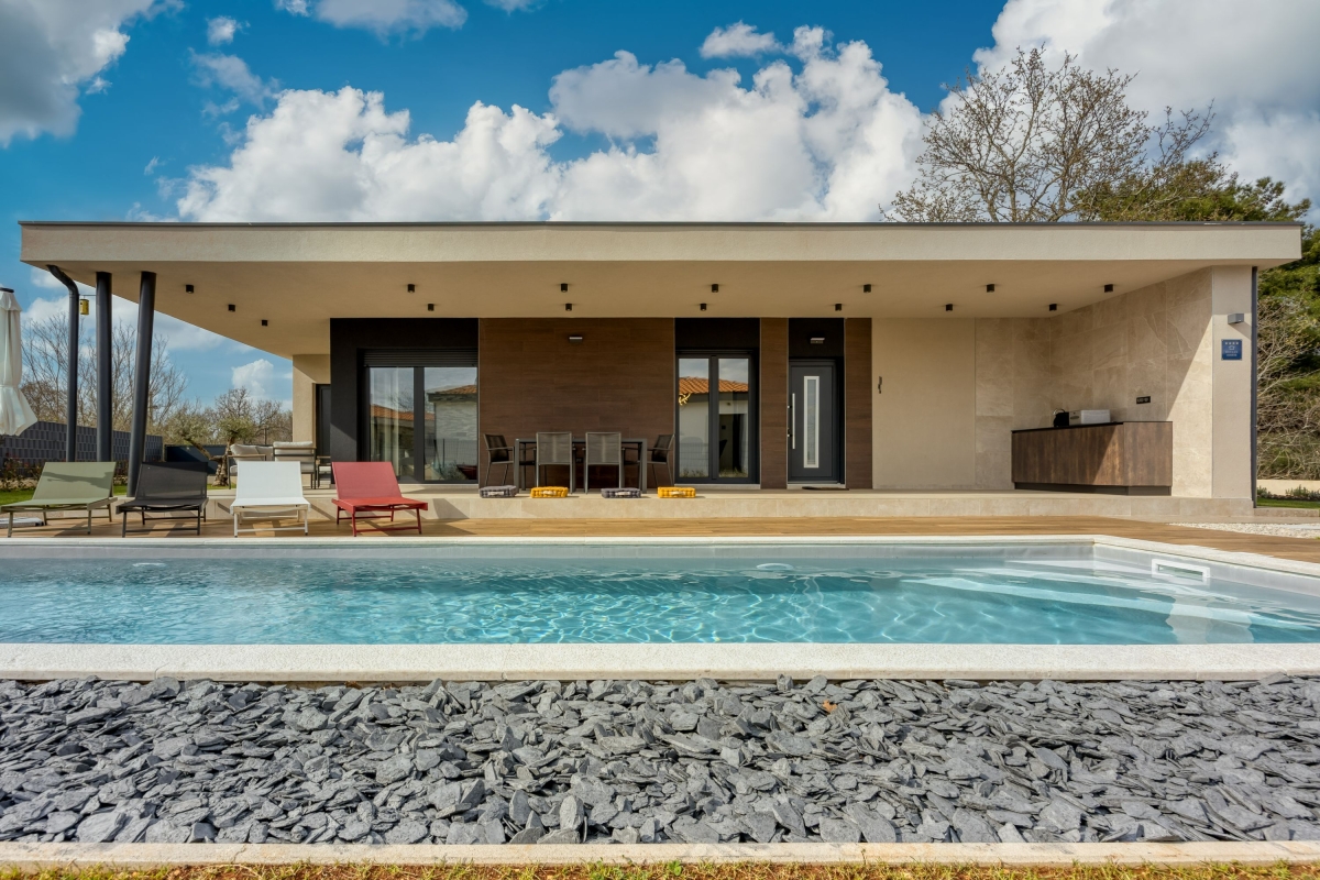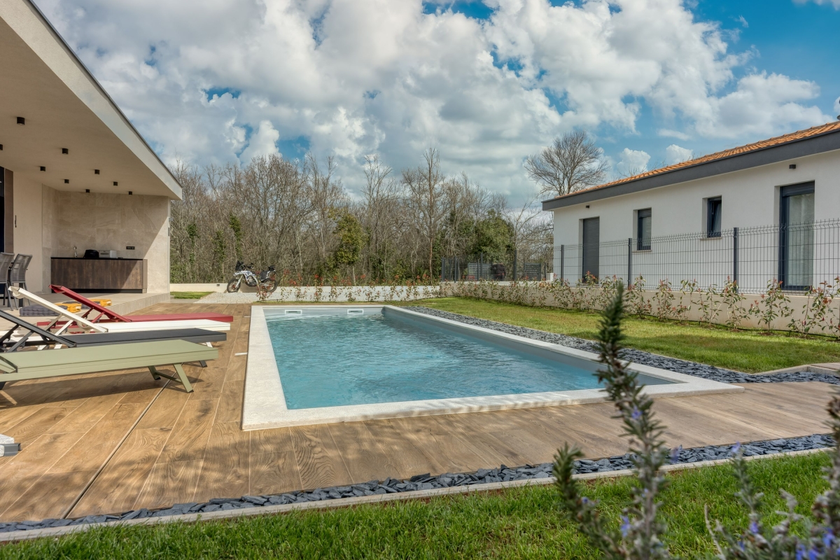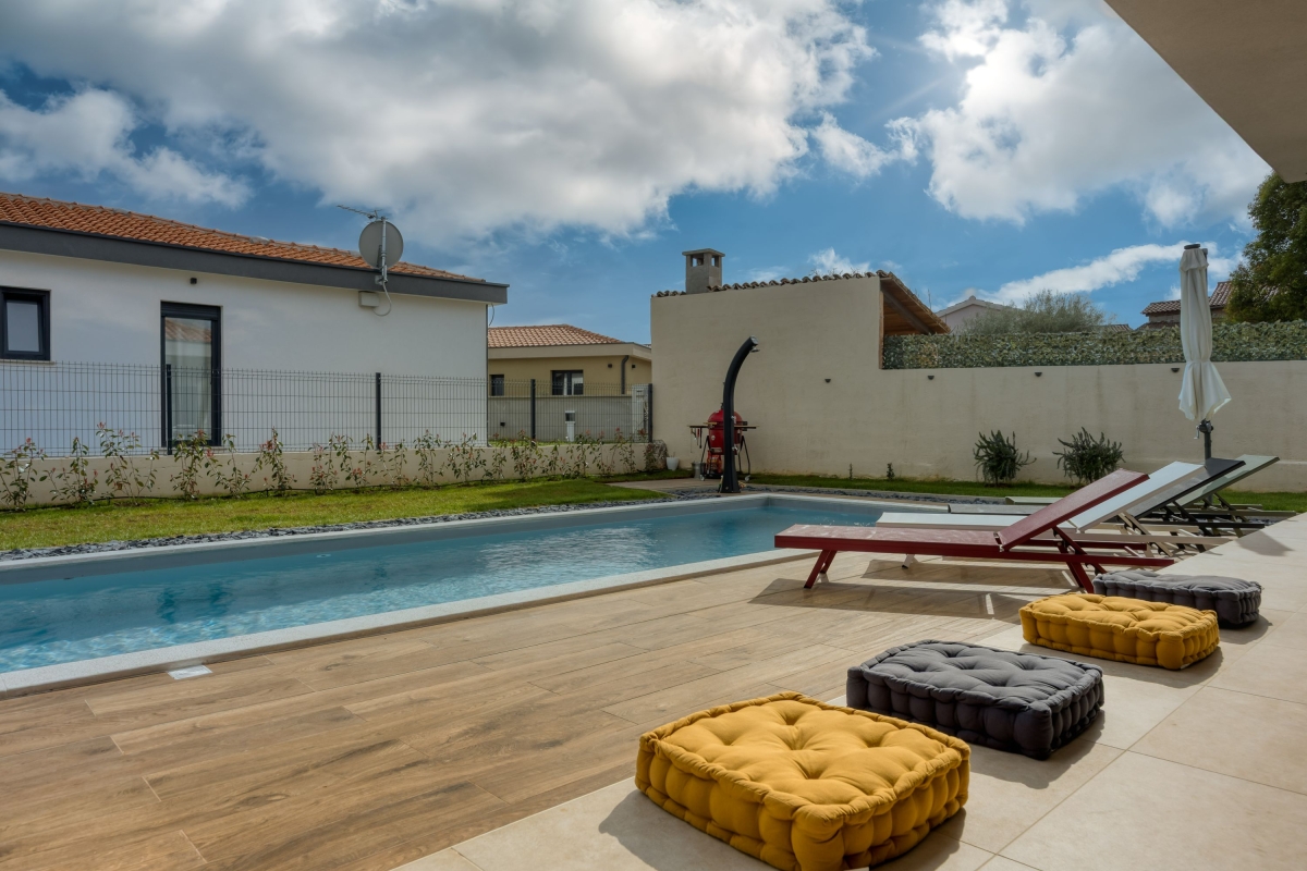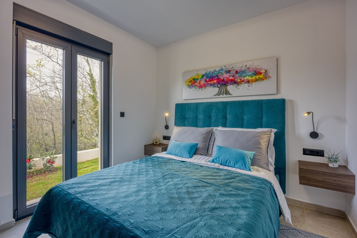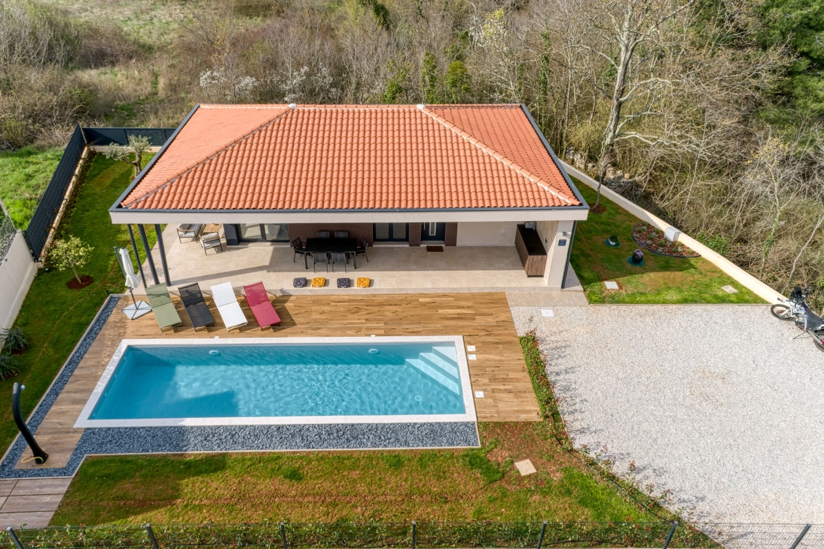 Relax in this charming holiday home in the heart of Istria in western Croatia. Set in a fenced garden, with a private swimming pool, this is the ideal base for a family or friends seeking to explore this beautiful region. This contemporary villa sleeps 5 people. The light-filled open-plan living space features French windows that open onto the terrace by the pool, and is divided into a seating area and a kitchen/diner. The seating area is comfortably furnished with an L-shaped sofa, coffee table and flat-screen TV. The newly fitted kitchen is well-equipped with a breakfast bar, cooker hob, oven, microwave, dishwasher, fridge/freezer and a Dolcegusto coffee machine. Separating the kitchen and the seating area is a dining table with 5 chairs. The shaded veranda allows guests to enjoy life al fresco. It includes an attractive seating area and a separate dining area, with a small kitchen, for memorable meals, overlooking the swimming pool. The poolside sun loungers allow guests to relax in the sun after a refreshing swim. Sleeping Bedroom 1: The master bedroom is furnished with a double bed, a flat-screen TV, a wardrobe and French windows opening onto the garden. Bedroom 2: Another airy bedroom is furnished with a comfortable double bed, a wardrobe, a flat-screen TV and glass doors leading to the garden. Extra: The sofa converts into a comfortable single bed. Bathroom The independent bathroom has a shower, basin, bidet, washing machine and WC Extras: In addition to the second separate WC, there is an outdoor shower by the swimming pool. Additional • Free wifi • Private swimming pool (open 1st May – 1st October) • Outside dining area & BBQ • Air conditioning (both bedrooms) • Flat-screen HD TV • Washing machine • Private, fenced garden • Pets possible, maximum of 2 pets (€70/stay for the second pet) • Child friendly • Baby’s cot & highchair available • Suitable for elderly guests • Security safe • Hair dryer • Private parking - car essential • Check-in from 4.00pm, Check out before 10.00am Location Set in the quiet village of Cvitani, the villa is only 20 minutes from Porec and the coast. Porec is packed with history, with a 6th-century basilica, a fascinating Old Town and a harbour. There are many excellent restaurants and cafés. The beaches and bays along the coastline are some of the finest in Croatia. If you can tear yourself away from the villa’s pool or one of the many stunning beaches, then a trip to Pazin is well worth it. Pazin (23 minutes) is dominated by its medieval fortress in the middle of the town. It also hosts the largest outdoor market in the area, on the first Tuesday of each month. For self-catering, there are supermarkets in Baderna (6 minutes) and Zbandaj (10 minutes). To enjoy some of the area’s excellent wines, head to the Saints Hills Cantina (4 minutes) to sample various wines and buy some to drink at home. Further afield, the city of Pula (40 minutes) makes an unmissable day trip. It has very well-preserved Roman ruins, as well as many cafés, restaurants and a large harbour. Pula International Airport is just 40 minutes away.