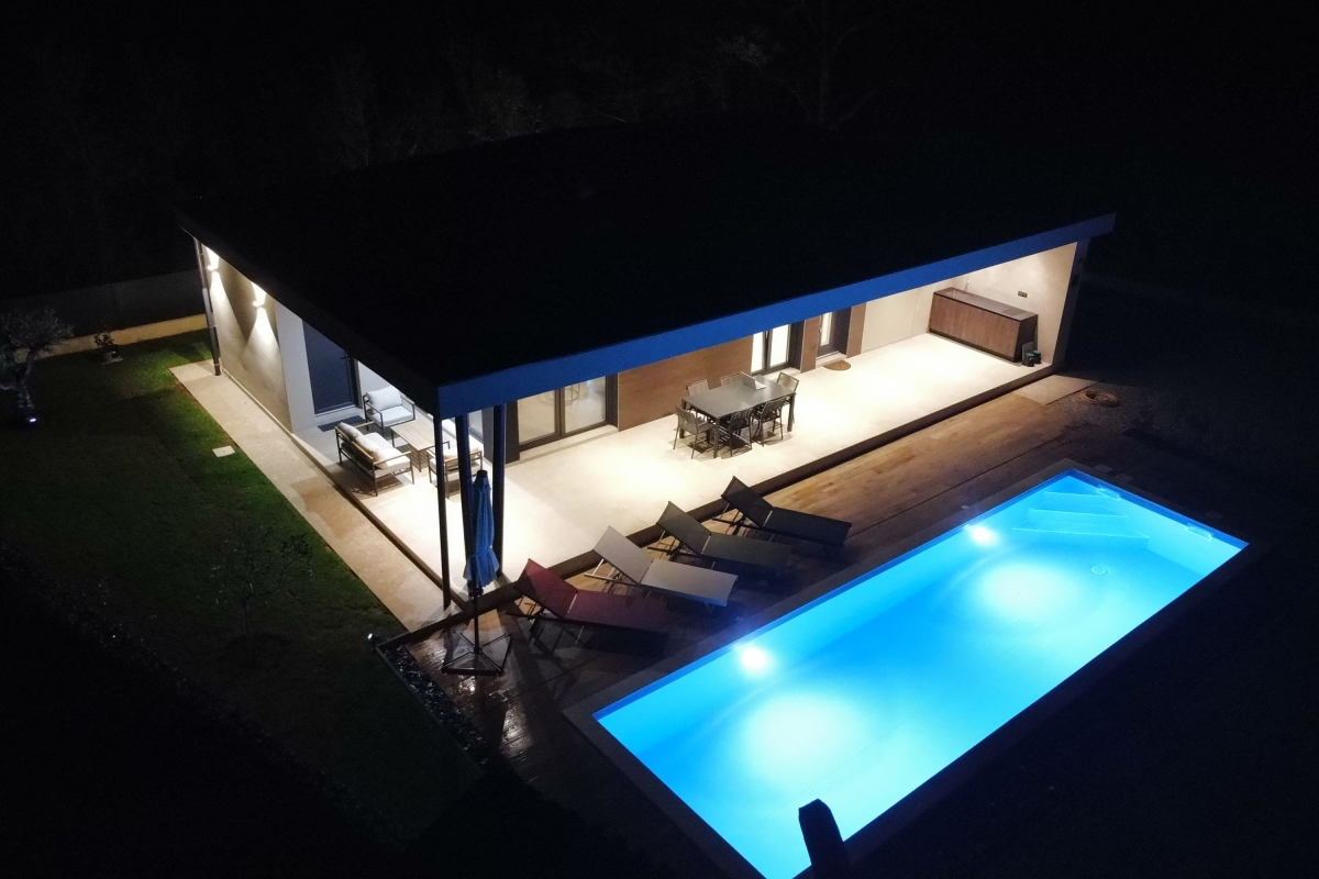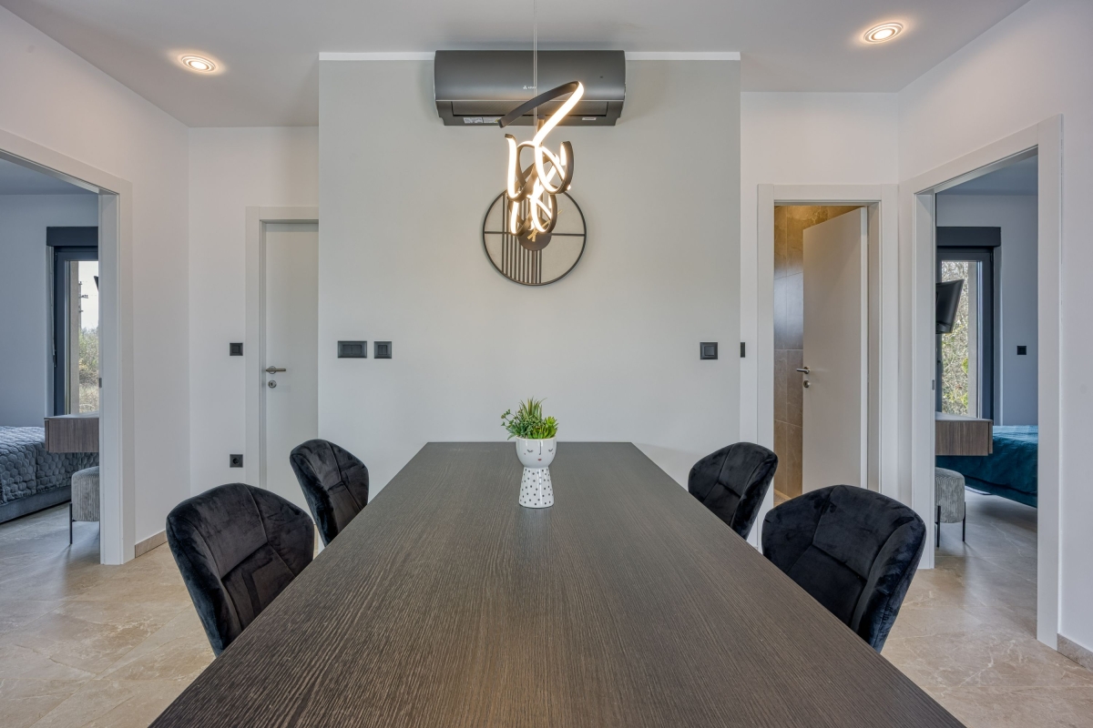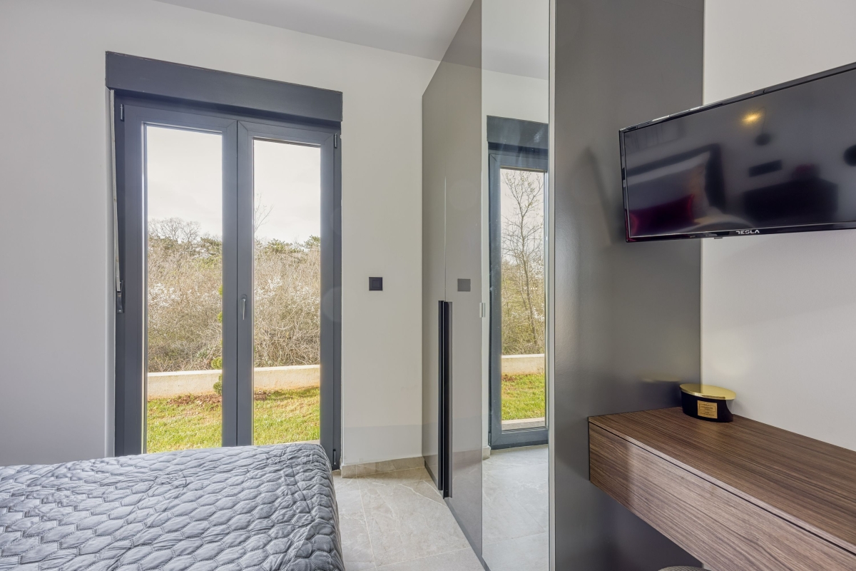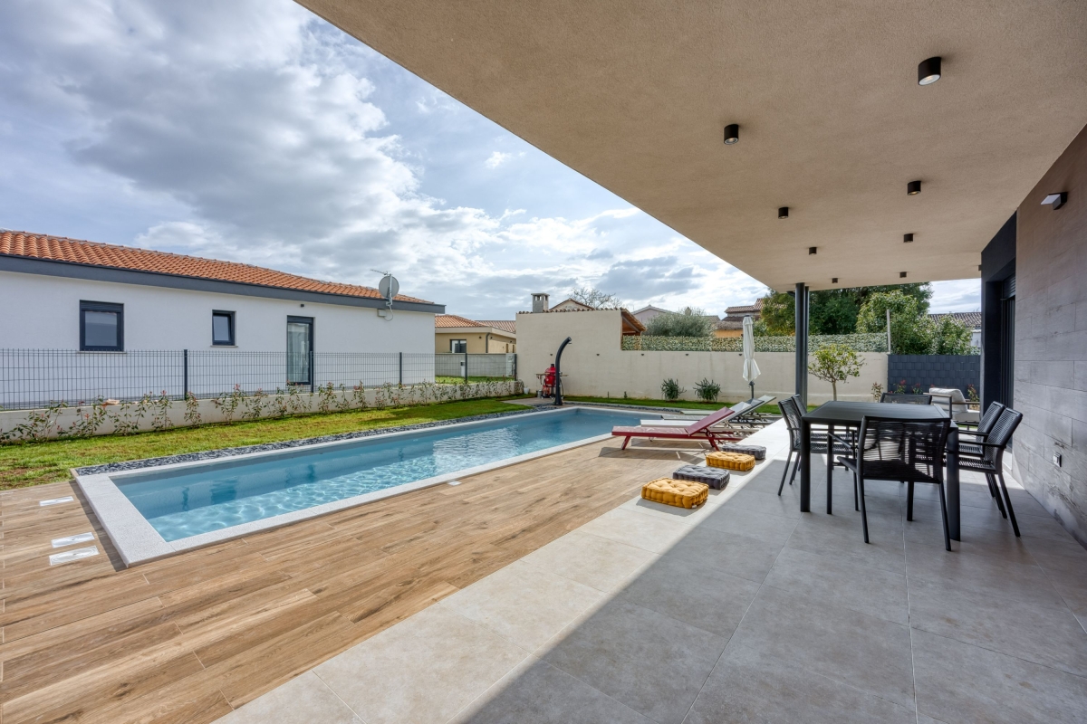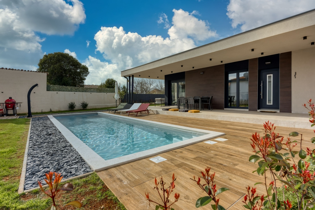 Relax in this charming holiday home in the heart of Istria in western Croatia. Set in a fenced garden, with a private swimming pool, this is the ideal base for a family or friends seeking to explore this beautiful region. This contemporary villa sleeps 5 people. The light-filled open-plan living space features French windows that open onto the terrace by the pool, and is divided into a seating area and a kitchen/diner. The seating area is comfortably furnished with an L-shaped sofa, coffee table and flat-screen TV. The newly fitted kitchen is well-equipped with a breakfast bar, cooker hob, oven, microwave, dishwasher, fridge/freezer and a Dolcegusto coffee machine. Separating the kitchen and the seating area is a dining table with 5 chairs. The shaded veranda allows guests to enjoy life al fresco. It includes an attractive seating area and a separate dining area, with a small kitchen, for memorable meals, overlooking the swimming pool. The poolside sun loungers allow guests to relax in the sun after a refreshing swim. Sleeping Bedroom 1: The master bedroom is furnished with a double bed, a flat-screen TV, a wardrobe and French windows opening onto the garden. Bedroom 2: Another airy bedroom is furnished with a comfortable double bed, a wardrobe, a flat-screen TV and glass doors leading to the garden. Extra: The sofa converts into a comfortable single bed. Bathroom The independent bathroom has a shower, basin, bidet, washing machine and WC Extras: In addition to the second separate WC, there is an outdoor shower by the swimming pool. Additional • Free wifi • Private swimming pool (open 1st May – 1st October) • Outside dining area & BBQ • Air conditioning (both bedrooms) • Flat-screen HD TV • Washing machine • Private, fenced garden • Pets possible, maximum of 2 pets (€70/stay for the second pet) • Child friendly • Baby’s cot & highchair available • Suitable for elderly guests • Security safe • Hair dryer • Private parking - car essential • Check-in from 4.00pm, Check out before 10.00am Location Set in the quiet village of Cvitani, the villa is only 20 minutes from Porec and the coast. Porec is packed with history, with a 6th-century basilica, a fascinating Old Town and a harbour. There are many excellent restaurants and cafés. The beaches and bays along the coastline are some of the finest in Croatia. If you can tear yourself away from the villa’s pool or one of the many stunning beaches, then a trip to Pazin is well worth it. Pazin (23 minutes) is dominated by its medieval fortress in the middle of the town. It also hosts the largest outdoor market in the area, on the first Tuesday of each month. For self-catering, there are supermarkets in Baderna (6 minutes) and Zbandaj (10 minutes). To enjoy some of the area’s excellent wines, head to the Saints Hills Cantina (4 minutes) to sample various wines and buy some to drink at home. Further afield, the city of Pula (40 minutes) makes an unmissable day trip. It has very well-preserved Roman ruins, as well as many cafés, restaurants and a large harbour. Pula International Airport is just 40 minutes away.