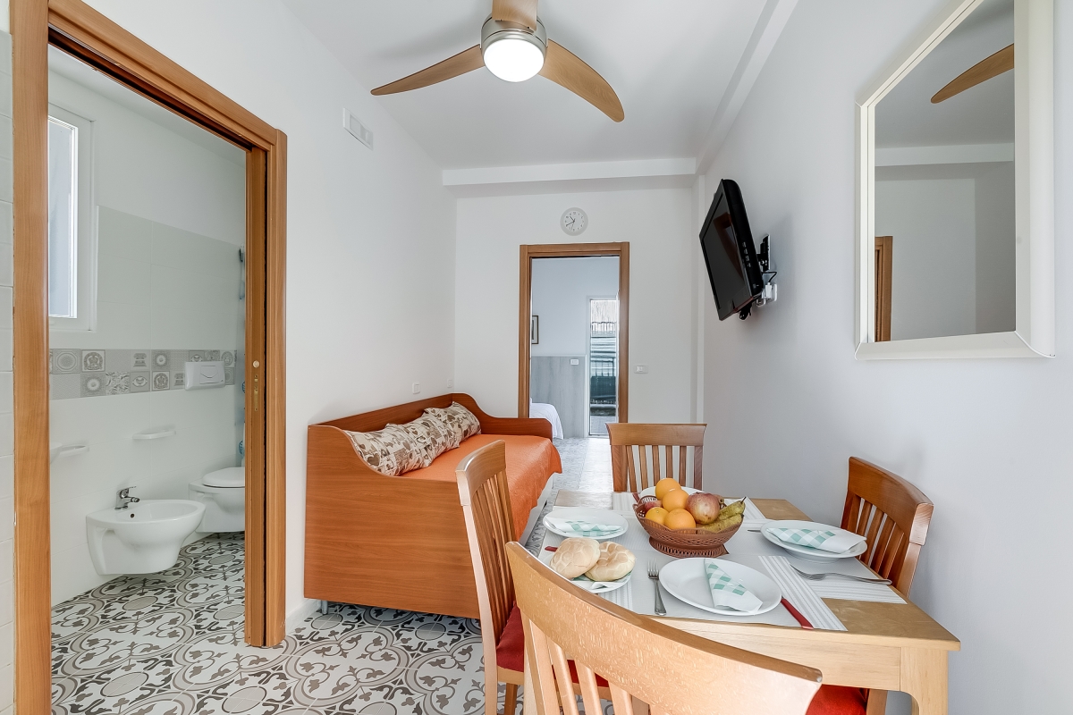 Escape to Stella Marina a charming residence with panoramic views of the Adriatic Sea. One of 8 apartments, apartment 4 can sleep up to 4 people. Stella Marina has a shared swimming pool and lovely gardens. It is in a peaceful setting, ideal for friends and family looking to relax and discover this beautiful region. The apartment has a private terrace, furnished with a sofa and a dining table for meals al fresco. The front door leads into the open-plan living space. This is decorated with a sofa, flat-screen TV and a dining table for 4 people. The kitchen is equipped with a cooker hob, coffee machine and fridge/freezer. The attractive swimming pool is fenced for parents’ peace of mind. There are sun loungers where you can relax after a refreshing swim. The residence’s garden is shaded by olive trees and has a small children’s play area. Sleeping Bedroom: The master bedroom has a contemporary double bed and a wardrobe. Extra: The sofa in the living room converts into a bunk bed. Bathroom The modern bathroom is equipped with a shower, bidet, basin and WC. Additional • Free Wifi in common areas (portable device) • Shared, protected swimming pool (Open 17th May to 25th October) • Shared garden • Terrace • Outside dining & BBQ • Air conditioning • Hair dryer • CO detector • Fire extinguisher • Private parking - car recommended • Very child-friendly • Outdoor games for children • Pets allowed • Check-in from 4.00pm to 8.00pm, Check out before 10.00am Note: For larger groups, please ask our bookings teams about the other apartments at Stella Marina - ID’s 12121, 12123, 12125 and 12126. Location Stella Marina is 100m from Baia dei Colombi Beach and 150m from San Lorenzo Beach. The Gargano National Park stretches from high peaks to the coast and ensures that the region is well protected. There are many magnificent hiking routes within the park. The beautiful town of Vieste is 5 minutes away and has all the local amenities guests might need, including a popular food market (Mondays) selling local produce. There are also many good restaurants serving local seafood. For something a bit different visitors can take a ferry to the Tremiti Islands. These two small islands are part of the Gargano National Park. They are both wildlife sanctuaries and home to stunning beaches, which are ideal for snorkeling. The closest airport is at Bari 2 hours and 25 minutes away.