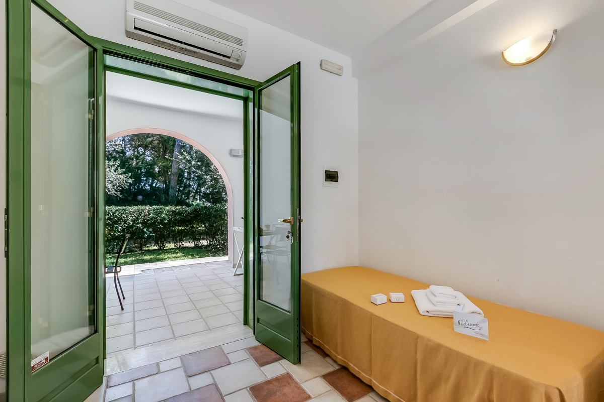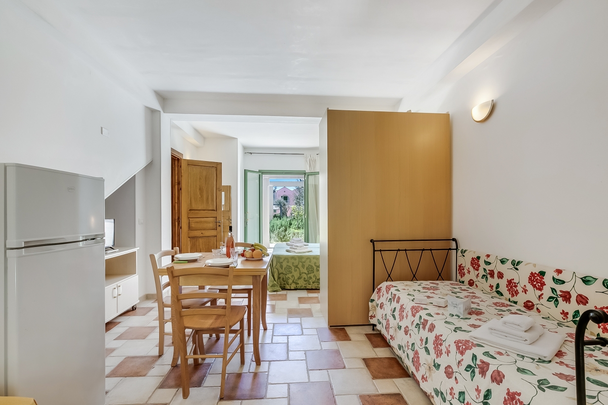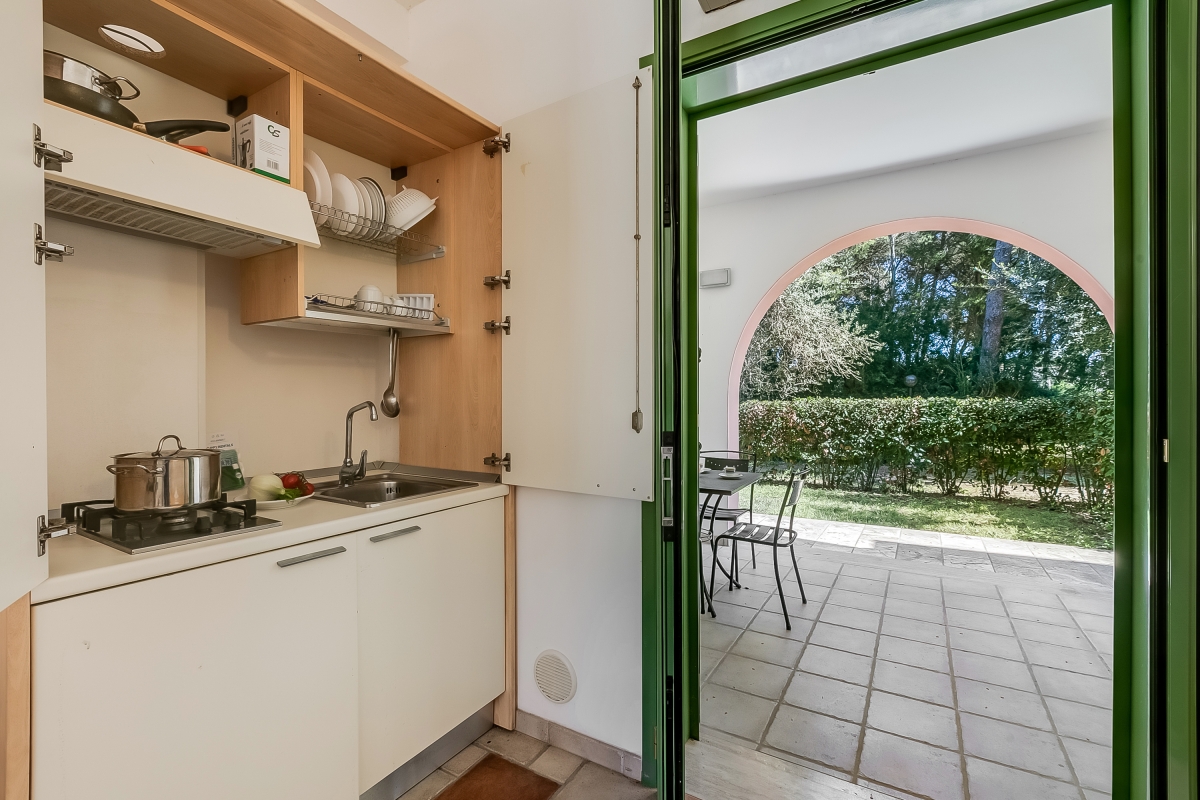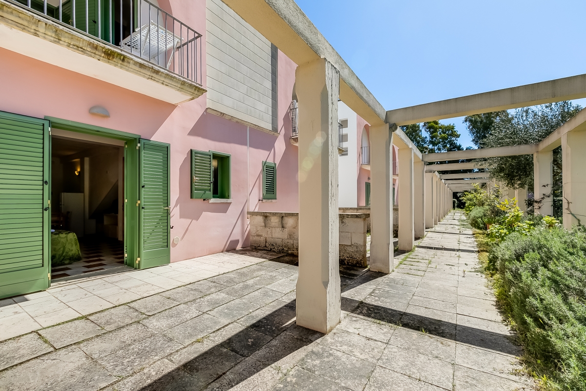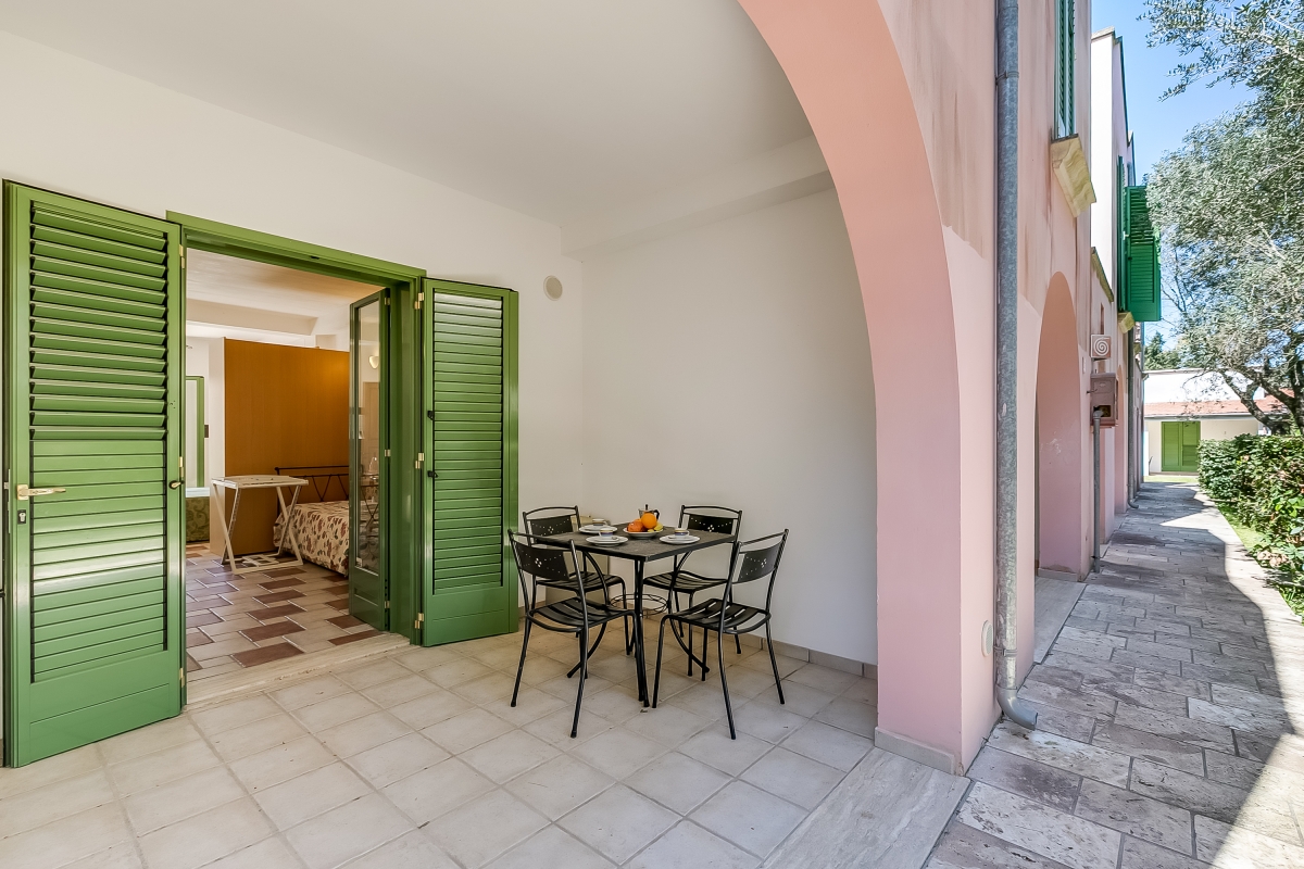 Stay about as close to the sea as you can get without getting your feet wet! Family Village M1 is surrounded by lush gardens. It is the ideal getaway for family and friends. The ground-floor apartment sleeps 4. Family Village is a 4-star resort with 64 units, bedrooms and apartments, built in the traditional Puglian style. The open-plan studio is reached via a charming arched veranda, which acts as an outdoor dining room, for meals al fresco. This opens onto the seating area, with a sofa, a sofa bed and storage. Next to this is the kitchenette-dining area with a table for 4 and a tiled, fitted kitchen equipped with a cooker hob, Moka coffee maker and a fridge/freezer. Beyond this is a double bed with further storage and a door leading out to a 2nd terrace. The resort offers a wide range of facilities, including a shared pool, entertainment for all ages, a safe children’s play area, a supermarket, a newsagent, a restaurant and bar, a boutique, an ATM and a full-time reception to help with any queries. Sleeping The living room has a double bed, 2 single beds, a wardrobe and an air conditioner. Bathroom The modern bathroom is divided into 2 rooms, one equipped with a box shower and basin. The other has a bidet and WC. Additional • Free Wifi • Private garden • Outside dining • Outside seating • Air conditioning • Children’s cot €20 and high chair €15 on request, depending on availability • Football pitch • Pets not allowed • Child-friendly • Free public parking car recommended Umbrellas and loungers on the beach are available on request for an additional fee, with shuttle service payable on-site. A €100 deposit is required upon arrival and will be refunded at check-out. A €50 cleaning fee will be withheld from the deposit if the kitchen is left dirty with unwashed dishes. Location The resort is on the Adriatic coast between Torre dell’Orso and Otranto. It is close to some of the most stunning beaches in Salento, including Baia dei Turchi (13 minutes) and the Faraglioni di Sant’Andrea bathing rocks (10 minutes). Guests have direct access to their own sandy beach, which is blessed with crystal-clear sea. Away from the coast, the famous Alimini lakes are a haven for bird watchers. Alimini Grande is just a 4-minute drive from the resort. Here visitors can enjoy hiking, picnicking and swimming or they can hire canoes. The peaceful port town of Otranto (18 minutes) makes a lovely day out. Here, visitors can enjoy the castle, a lively port and excellent restaurants. The weekly market (Wednesday morning) is a source of the best local ingredients to cook at home. If you miss the market, there are several supermarkets in the town. The closest airport is at Brindisi - 1 hour and 10 minutes away by car.