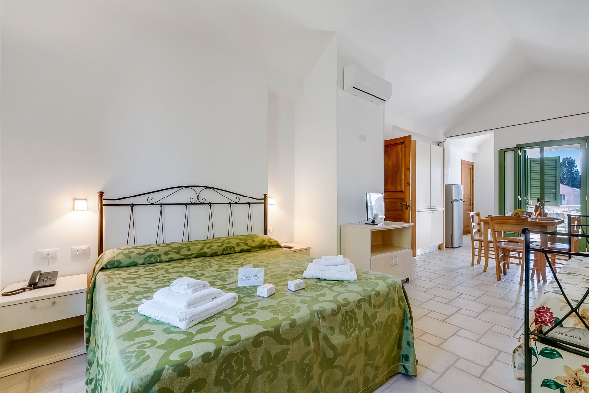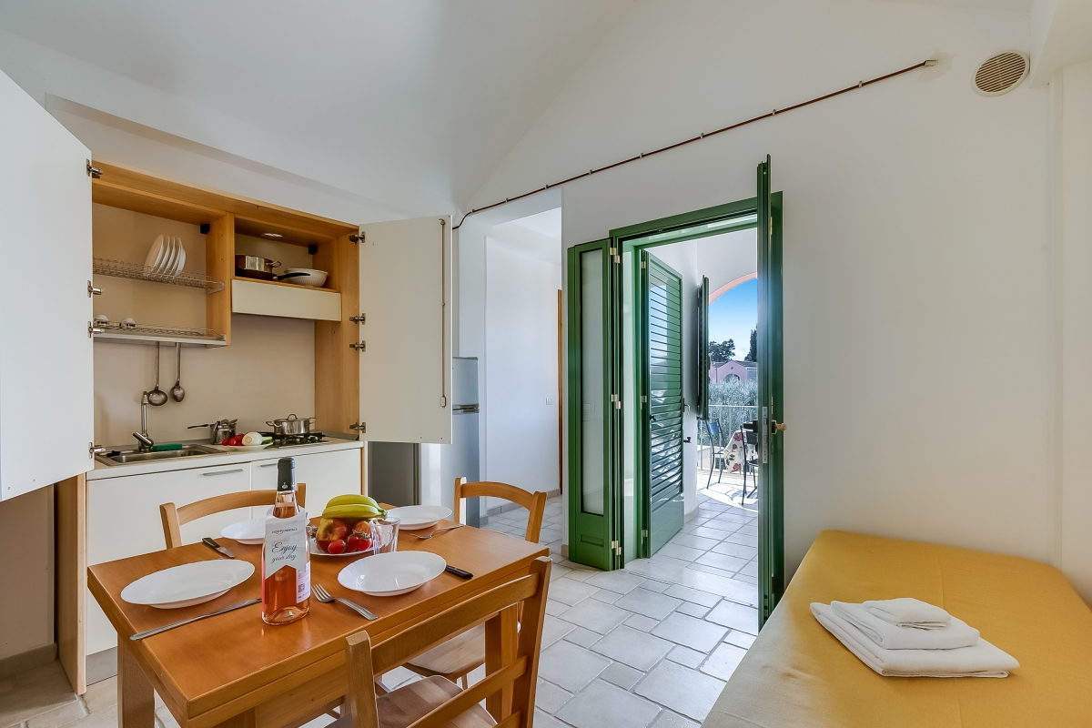 Escape to Family Village, by the pristine Adriatic Sea. This apartment for 4 is part of a 4-star resort with 64 units near Otranto, in the heart of Salento. The family-friendly resort has been created from local stone and reflects some of Puglia’s unique architecture. With a lush gardens and a large shared swimming pool, it is a perfect option for all ages, looking for summer fun. The first-floor apartment has a pretty, arched balcony complete with a table and chairs, for meals al fresco. Inside the airy open-plan living space is furnished with a divan/sofa, flat-screen TV, dining table for 4 and a kitchenette. The kitchenette is equipped with a cooker hob, Moka coffee maker and a fridge/freezer. The resort offers a wide range of facilities including a shared pool (with a lifeguard); entertainment for all ages; a safe children’s play area; a supermarket; a newsagent; a restaurant and bar; boutique; ATM and a full-time reception to help with any queries. Sleeping The living room has a double bed, 2 single beds, a wardrobe and an air conditioner. Bathroom The modern bathroom is divided into 2 rooms, one equipped with a box shower and basin. The other has a bidet and WC. Additional • Free Wifi • Shared swimming pool (open 1st June to 30th September) • Private garden • Outside dining • Outside seating • Air conditioning • Children’s cot €20 and high chair €15 on request, depending on availability • Football pitch • Pets not allowed • Child-friendly • Free public parking, car recommended Umbrellas and loungers on the beach are available on request for an additional fee, with shuttle service payable on-site. A €100 deposit is required upon arrival and will be refunded at check-out. A €50 cleaning fee will be withheld from the deposit if the kitchen is left dirty with unwashed dishes. Location Close to some of Salento’s most beautiful beaches, between Torre dell’Orso and Otranto, Family Village is well-located for guests who want to explore Puglia’s ancient past and relax in the sun. If you can tear yourself away for the resort’s beach then a trip to Baia dei Turchi (13 minutes) and the Faraglioni di Sant’Andrea bathing rocks (10 minutes) will make an excellent day out. Away from the coast, the famous Alimini lakes are a haven for bird watchers. Alimini Grande is just a 4-minute drive from the resort. Here visitors can enjoy hiking, picnicking and swimming or they can hire canoes. The peaceful port town of Otranto (18 minutes) makes a lovely day out. Here visitors can enjoy the castle, a lively port and excellent restaurants. The weekly market (Wednesday morning) is a source of the best local ingredients to cook at home. If you miss the market there are several supermarkets in the town. The closest airport is at Brindisi - 1 hour and 10 minutes away by car.