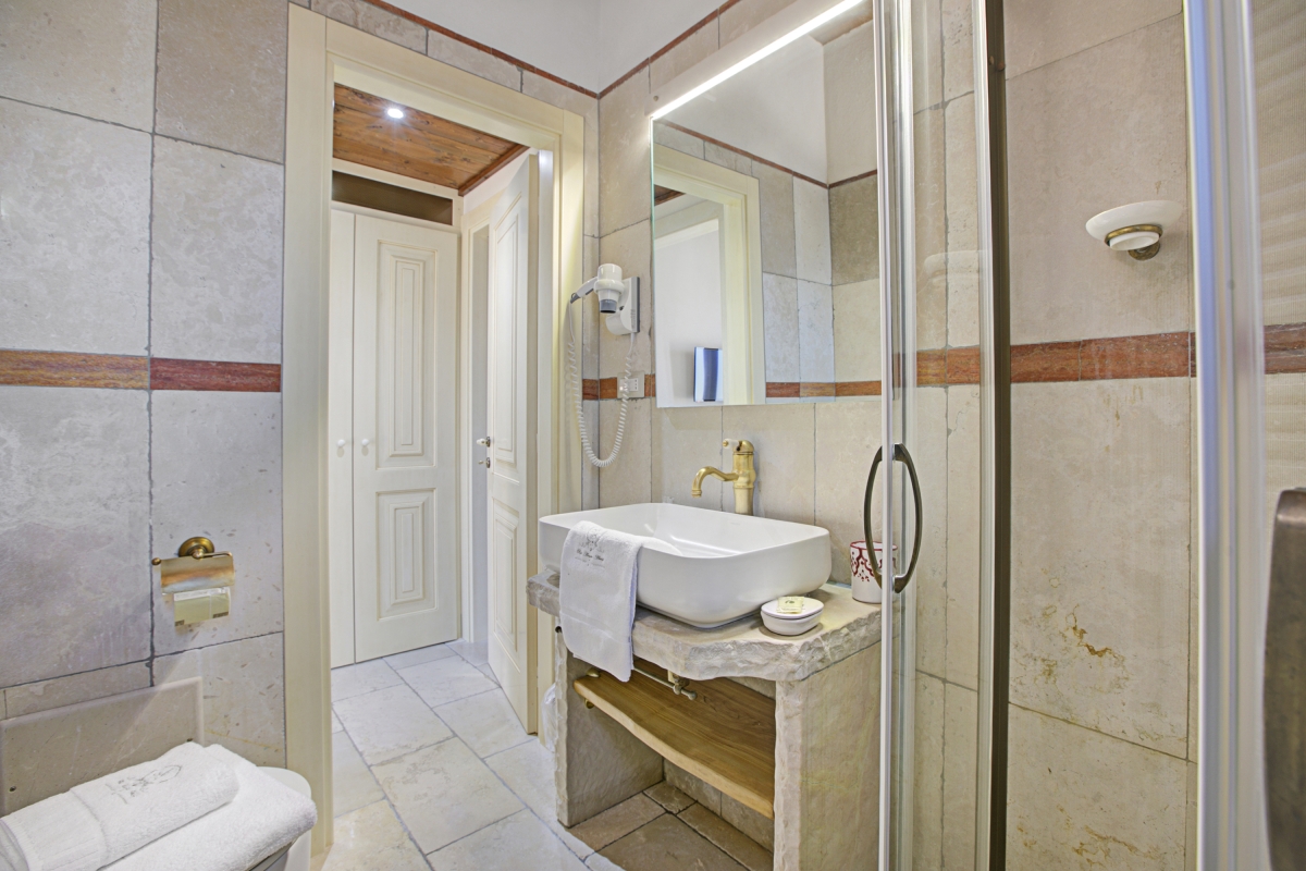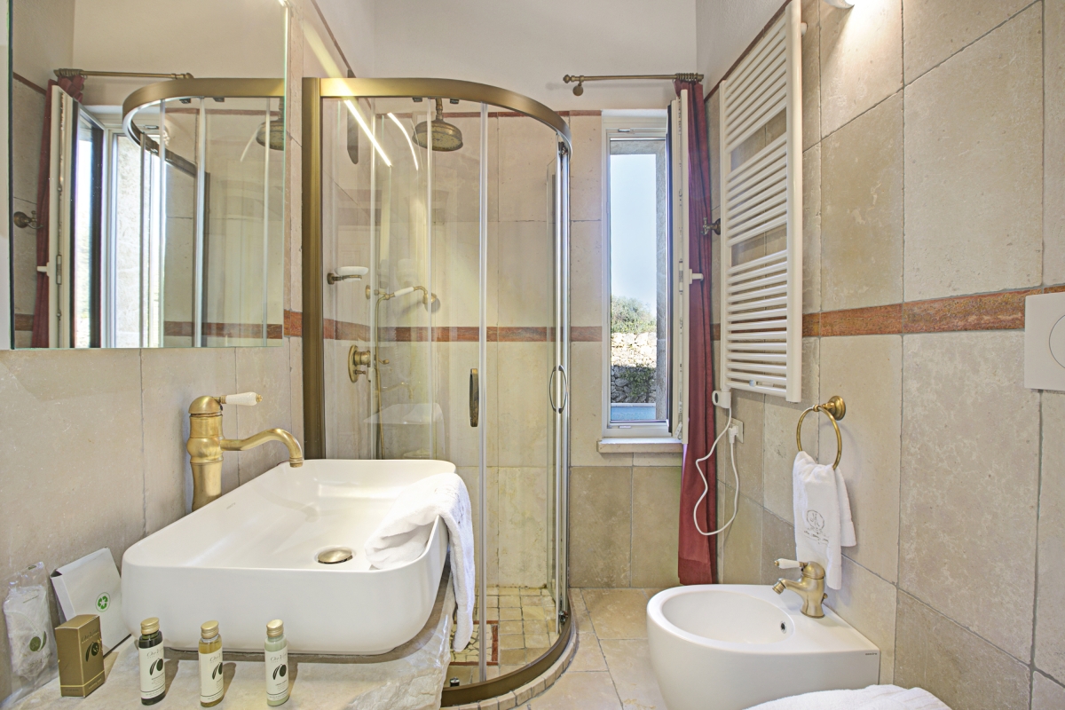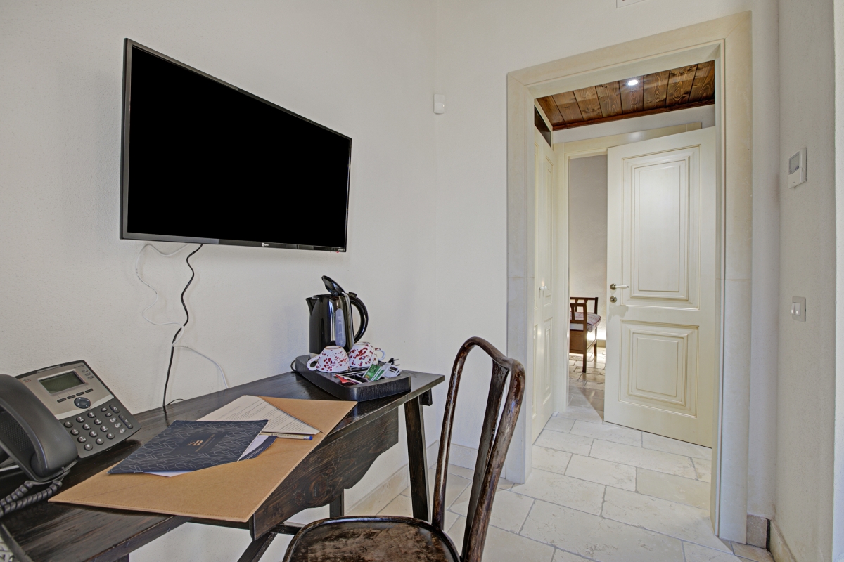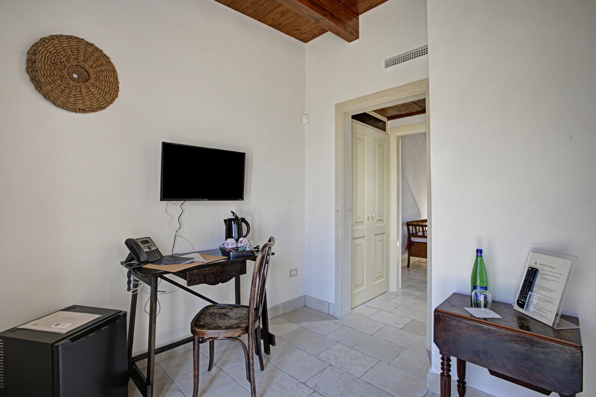 Unwind in the tranquillity of Masseria Antoglia, a beautifully restored 14th-century fortified estate in Villa Castelli, Puglia. The Ciliegio Classic Room is a cosy ground-floor accommodation steps from the swimming pool, accommodating up to 3 guests. Set outside the main estate building, it features a lounge area with a sofa bed for a third guest and opens onto a lush garden filled with orange and lemon trees. The separate sleeping area features a queen-size wrought-iron bed beneath a warm wooden ceiling. The Trani stone-clad bathroom includes a spacious shower with antique brass fittings for a touch of elegance. The Ciliegio Classic Room at Masseria Antoglia offers a unique blend of historic charm and modern luxury with free Wi-Fi, a smart TV, and a shared swimming pool. Enjoy quietude and relax in the shared garden with an outdoor dining area perfect for al fresco meals while soaking in the sun or under the stars. Sleeping The room features a double bed, a single sofa bed, wardrobe, and air conditioning. Bathroom The bathroom features a bidet, a shower, and a WC. Additional • Shared Pool • Child Friendly • Luxurious • Private Parking Space • Satellite TV • Shared Garden • Security Safe • Hair Dryer • Wifi Free • Outside Dining Area • Digital TV • Outside Table-Chairs • Outdoor Pool • Breakfast included • Fire extinguisher Location Tucked between the charm of Apulia’s countryside and the allure of the Adriatic coast, this location offers the best of both worlds—tranquil rural beauty with easy access to Italy’s most picturesque destinations. Visit famous historic sites like Castello Ducale and Castello Episcopio within 10 minutes. Art lovers would love exploring Quartiere delle ceramiche (10 minutes), a street filled with shops featuring handcrafted artisanal goods. Within walking distance, you’ll find cosy local cafés, family-run trattorias, and essential shops. The Adriatic coast is a 30-minute drive away and is home to stunning beaches like Camerini, Pantanagianni Grande and Torre Pozzelle. Just a short drive opens up a world of adventure. The dazzling white towns of Ostuni and Cisternino are under 30 minutes away, while the baroque streets of Martina Franca offer cultural gems and boutique shopping. Nature lovers can explore local hiking trails or cycle through the Valle d'Itria’s rolling landscapes. The nearest airport is approximately 45 minutes away.