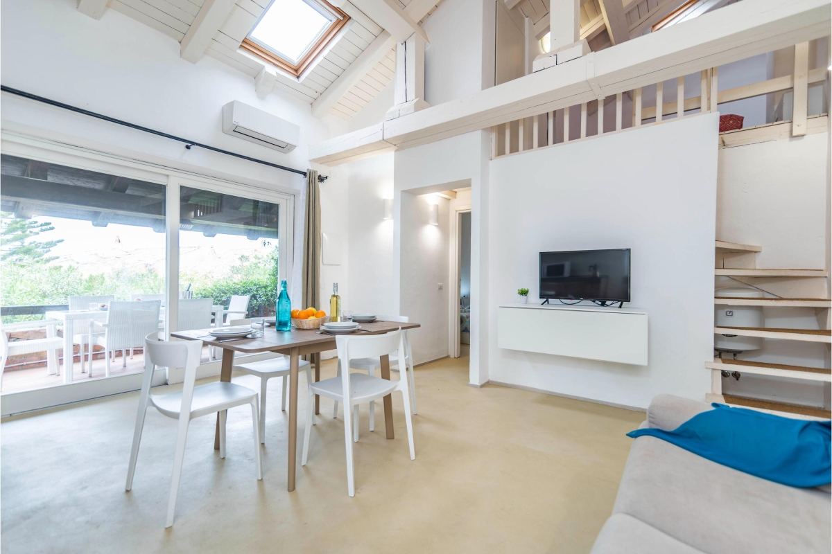 Explore the glamorous Costa Smeralda from this stylish apartment for 6. On the first-floor of a contemporary residence, this apartment makes an ideal base for friends and family. A short walk from the centre of Porto Rotondo and 4 minutes from the beach, the residence is very well situated for an exciting holiday. The apartment is light and airy with high ceilings and a spacious open-plan living area, complete with sliding glass doors leading out to a rustic, shaded balcony. Guests can enjoy meals al fresco on the balcony thanks to the dining table for 6. Back indoors there is a sofa, a flat-screen TV, another dining table and a sleek kitchen. The kitchen is equipped with an induction hob, microwave, dishwasher, a Moka coffee maker and fridge/freezer. An attractive staircase leads up to the mezzanine bedroom. The shared pool is set in picturesque countryside. There are many sun loungers where guests can relax after a refreshing swim. The pool is open from 9.00 to 13.00 and from 15.30 to 19.00. Swimming caps are mandatory. Sleeping Bedroom 1: The mezzanine bedroom has a double bed and a wardrobe. Bedroom 2: Off the living area, this bedroom has a double bed and a wardrobe. Extra: The sofa in the living room converts to a comfortable double bed. Bathroom A tiled bathroom with a shower, bidet, basin, washing machine and WC. Additional • Free WiFi • Shared swimming pool (open 1st June to 30th September) • Terrace • Outdoor seating and dining area • Satellite TV • Air conditioning • Washing machine • Private Parking - car recommended • Child-friendly • Pets possible • Check-in from 4.00pm, Check out by 10.00am Location The apartment is just a 10-minute walk from the centre of the resort of Porto Rotondo which is blessed with some of Sardinia’s finest beaches. The beaches at Punta Volpe (8 minutes), Marinella (9 minutes) and Ira (7 minutes) are famously lovely. After a day by the sea visitors are spoiled for choice with the many excellent restaurants and bars in the town. In the summer months, Porto Rotondo’s marina (6 minutes) is home to some of the most expensive yachts in the world. An evening stroll around the port offers a glimpse of the international jet set. From June to August the town hosts “Porto Rotondo in Fiera” a delightful street market that takes place every Wednesday morning. For self-catering there are supermarkets and smaller shops close by. Alternatively, in Olbia, you can explore vibrant farmers' markets held three times a week. The Saturday market in Via Sangallo is particularly recommended. (20 minutes) Olbia airport is just a 20-minute drive.