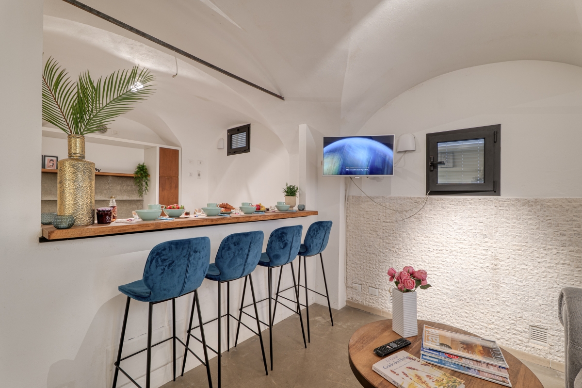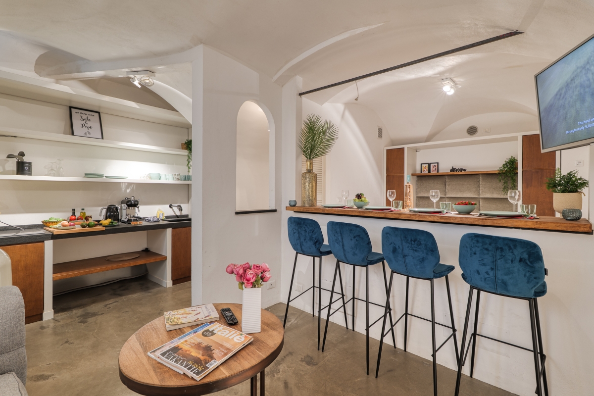 The apartment features a warm and inviting open-plan living room that flows seamlessly into a compact yet fully equipped kitchenette. Here, guests will find an induction hob, a coffee machine, an electric kettle, and a fridge, everything needed for a comfortable stay. A beautifully crafted wooden island table with chairs adds to the charm, serving as both a dining area and a perfect spot to enjoy a quiet breakfast or evening meal.