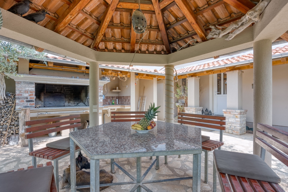 Discover the essence of relaxation in this charming holiday home nestled in the heart of a beautiful olive grove in sunny southern Istria. A Peaceful Retreat – Casa Oliva Kim Marie offers the perfect blend of nature, tranquility, and comfort in the picturesque town of Medulin. Nestled amidst olive groves, this charming ground-floor home features 1 bedroom and comfortably accommodates up to 4 guests. The open-plan kitchen and living area create a cosy space for relaxed evenings, complete with a cooker hob, an electric kettle, a coffee machine, an oven, a toaster, a microwave, and a fridge with freezer. Wake up to birdsong, breathe in the fresh air, and enjoy the peaceful surroundings just minutes away from the lively coastal attractions of Medulin. Step outside and immerse yourself in natural beauty. Dine al fresco in the shaded pavilion, cook meals on the traditional stone barbecue, or unwind in the garden on a sun lounger. The spacious outdoor area offers both sunshine and shade, ideal for reading or relaxing. A nearby chicken coop adds rustic charm to this authentic Istrian experience. Sleeping Bedroom 1: This bedroom has a double bed and a wardrobe. Extra: A double sofa bed is available for 2 in the living room. Bathroom Bathroom 1: This bathroom has a shower, a wash basin and a WC. There is also a service toilet outside for guests’ use. Additional • Free Wi-Fi Device • Private Parking (Car not Necessary) • Fireplace • Pets Allowed • Fenced garden • Smoking not Allowed • Washing Machine • Child-Friendly Location Casa Oliva Kim Marie offers a serene escape just minutes from everyday conveniences. The Plodine supermarket lies only 5 minutes away, and Lidl is within a 10-minute walk. Restaurants, cosy cafés, shops, and local events can all be reached on foot, making it easy to immerse yourself in the town’s charm. A 20-minute walk (approx. 1,900 m) brings you to the sandy shores of Medulin Beach for sun-soaked relaxation. Those seeking quiet reflection will appreciate the peaceful presence of the nearby St. Agnes Church, where mass schedules are posted at the entrance. Just a short drive away, explore the historic town of Pula and its Roman amphitheater. Continue south to Cape Kamenjak Nature Park for hiking and snorkeling. Discover Rovinj’s romantic harbor or take a boat trip to Brijuni National Park. End your day along Medulin’s lively promenade—ideal for a sunset stroll or dining by the sea. Pula Airport is only a convenient 15-minute drive from here.