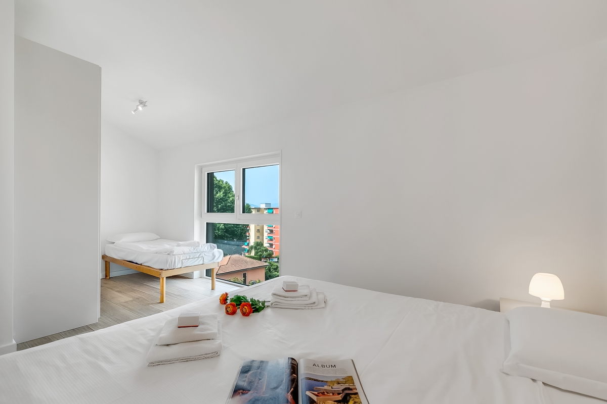 Discover Lugano’s wonderful blend of Swiss efficiency and Mediterranean charm. This contemporary, 4th-floor (with a lift) duplex escape for 6 is the ideal base for a lakeside getaway with groups of family or friends. The property is arranged over two floors (with internal stairs) of a modern apartment building and features a light-filled living space furnished with a double sofa bed and a smart flatscreen TV. This space leads out to a balcony that provides the ideal space for alfresco dining whilst enjoying the tranquil mountain views. The separate kitchen/dining room is equipped with a dining table, a Nespresso coffee machine, an induction hob, an oven, a microwave, a dishwasher and a fridge freezer. Sleeping Bedrooms 1 & 2: Both spacious bedrooms are furnished with a double bed and fitted wardrobes Extra: There is a double sofa bed in the living room Bathrooms Bathroom 1: The modern bathroom is fitted with a large shower, two washbasins and a WC Additional • Mountain View • Balcony • Outside Dining Area • Outside Table-Chairs • Free Wi-Fi • Central Heating • Underfloor Heating • Car not Necessary • Allocated Private Parking Space (Garage) • EV Charger • Pets Possible (small dogs) • Smoking Prohibited Location The property is situated in a quiet residential neighbourhood of Lugano, a 20-minute walk from Lido di Lugano, Lugano’s ferry terminal and Parco San Michele. Guests can reach the centre of Lugano with its beautiful Piazza della Riforma, Parco Ciani and the luxury shopping street Via Nassa in just 25 minutes on foot/ 5-minute drive. Those after mountain adventures can head to the Funicolare Cassarate (a 20-minute walk) for Monte Brè. For culture, visitors can head to MASI, the Museum of Art of Italian Switzerland, which hosts regular contemporary art exhibitions and (LAC) Lugano Arte e Cultura, a new centre dedicated to music, visual and performing arts (both a 9-minute drive). Guests can also visit the amazing Swissminiatur (a 15-minute drive), and admirers of the Nobel Prize-winning author Herman Hesse will find a museum dedicated to the novelist in Montagnola (a 15-minute drive). There are several restaurants and a supermarket approximately a 5-minute walk away. For the freshest local produce, guests should head to the farmers market, which takes place every Tuesday and Friday morning in central Lugano on Piazza della Riforma (a 30-minute walk/ 8-minute drive). The closest international airport is in Italy, Milan Malpensa (MXP), which is approximately a 1-hour drive away.