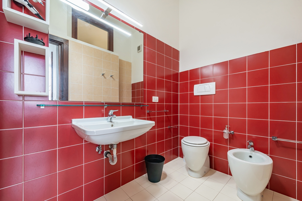 The brightly tiled bathroom has a shower, basin, bidet and WC.