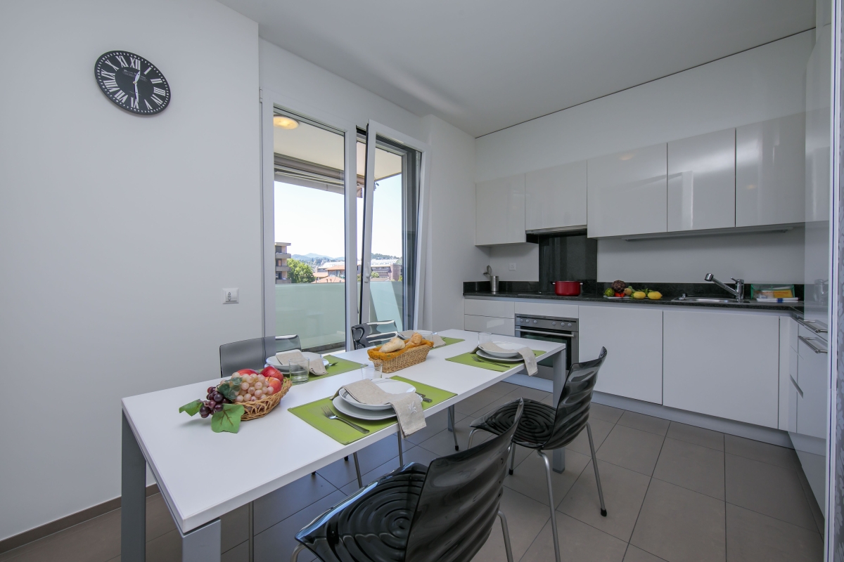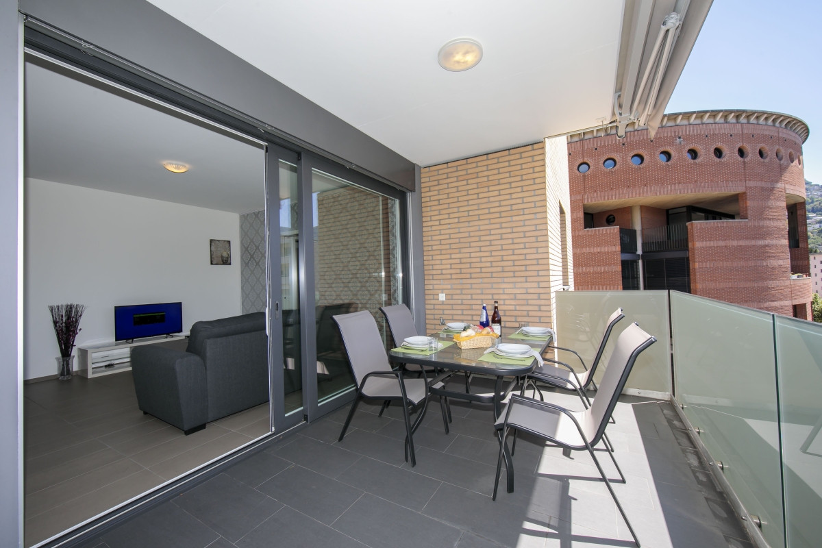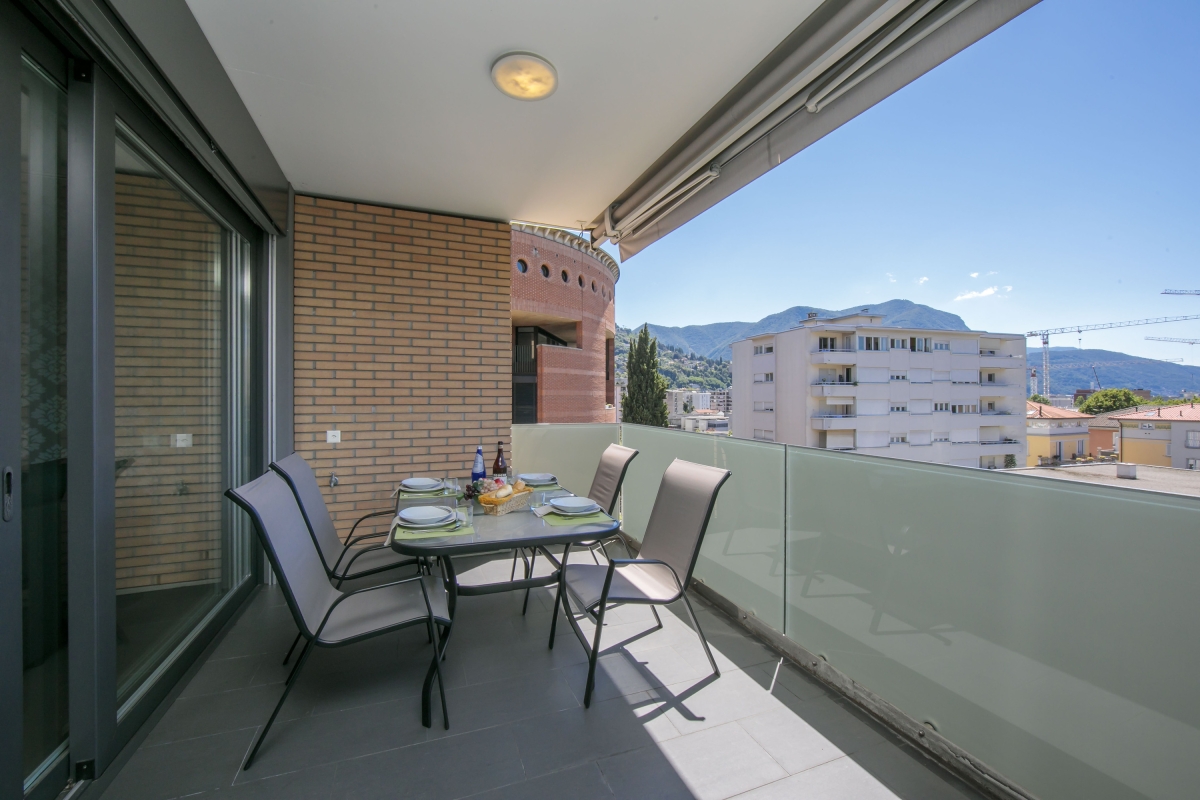 Take on the city sights, from this flexible modern balcony apartment with parking space! Situated within easy reach of the city centre, this modern 1-bedroom apartment is ideal for those looking to relax and explore. Inside, the balcony apartment is equipped with underfloor heating and a stylish modern furniture. A modern living area with sofa and flat screen TV is accompanied by access to a covered private balcony terrace with alfresco dining set. As well as entertaining outside, the apartment is also equipped with a contemporary kitchen diner for 2. A spacious master double bedroom offers a layout for 1 couple or 2 guests. A contemporary fitted shower room and WC complete the layout of this well-presented retreat. A private parking space can be found on-site and the 4th floor apartment is easily reachable by lift. For larger groups, the apartment can be rented alongside the same 4th floor apartment Mola Mimosa (ID 3021) and the 3rd floor apartments Mola Giglio (ID 3022) and Mola Glicine (ID 3023). From the residence, the picturesque lakeside and vibrant centre of Lugano are within a 5 minutes’ drive/ 17 minutes’ walk away. Sleeping- Bedroom 1: A spacious double bedroom with wardrobe Bathrooms- Bathroom 1: A contemporary shower room with wash basin, WC & bidet Bathroom 2: A service WC with washbasin Additional- • Central heating • Underfloor heating • Washing machine • Nespresso coffee machine • Upon request a portable WiFi device can be hired • Terrace with alfresco dining set • Lift access • Private parking space • Pets considered Location: The contemporary 5-storey residence is situated along ‘Via Pier Francesco Mola’ in Lugano, 5 minutes’ drive/ 17 minutes’ walk away from the buzzing café-lined lakeshore, the family-friendly lido, modern casino, Parco Civico and array of cultural attractions for all-weather fun. Lugano central bus and train station are 7 minutes’ taxi ride away, whilst Lugano airport is 15 minutes’ drive away.
