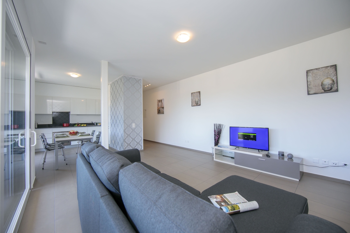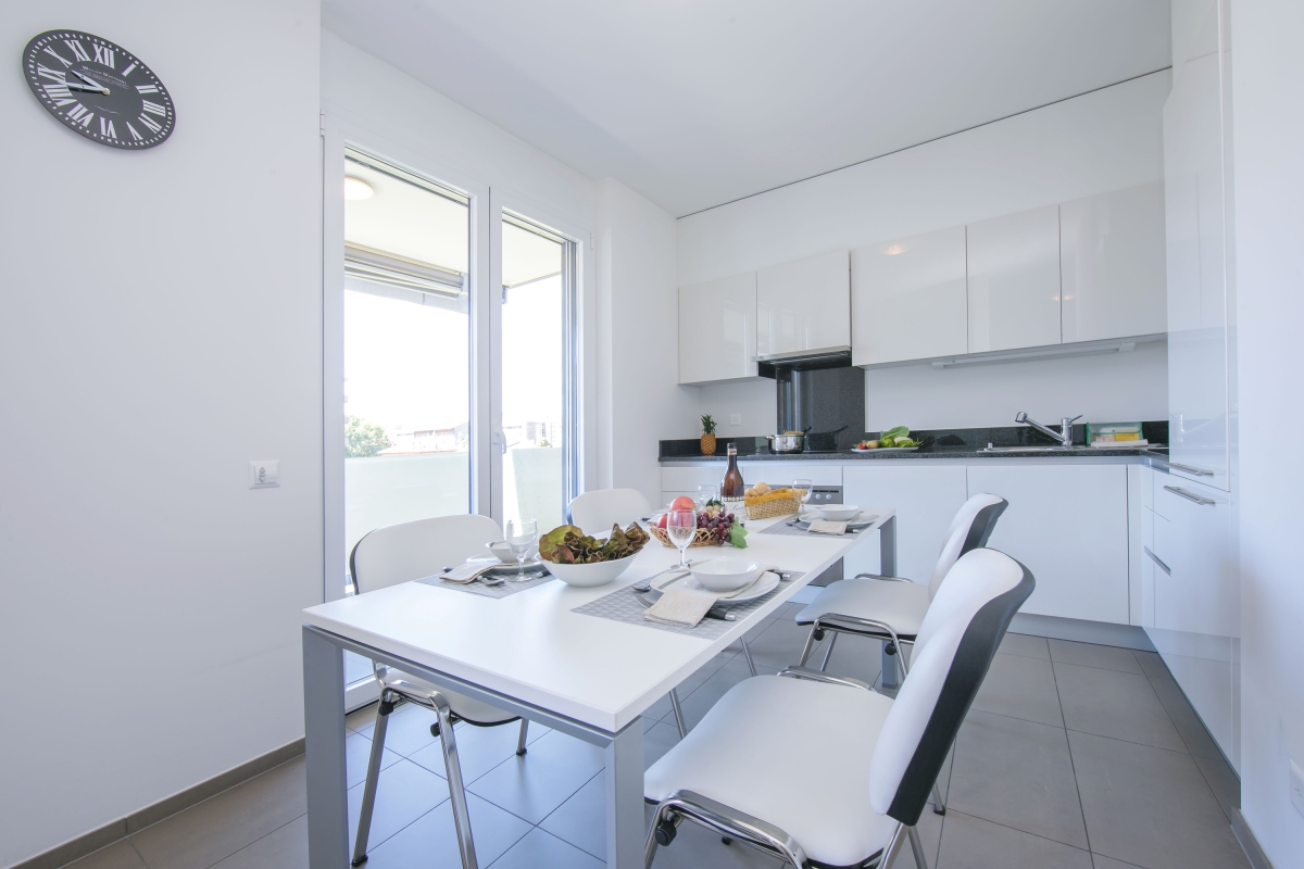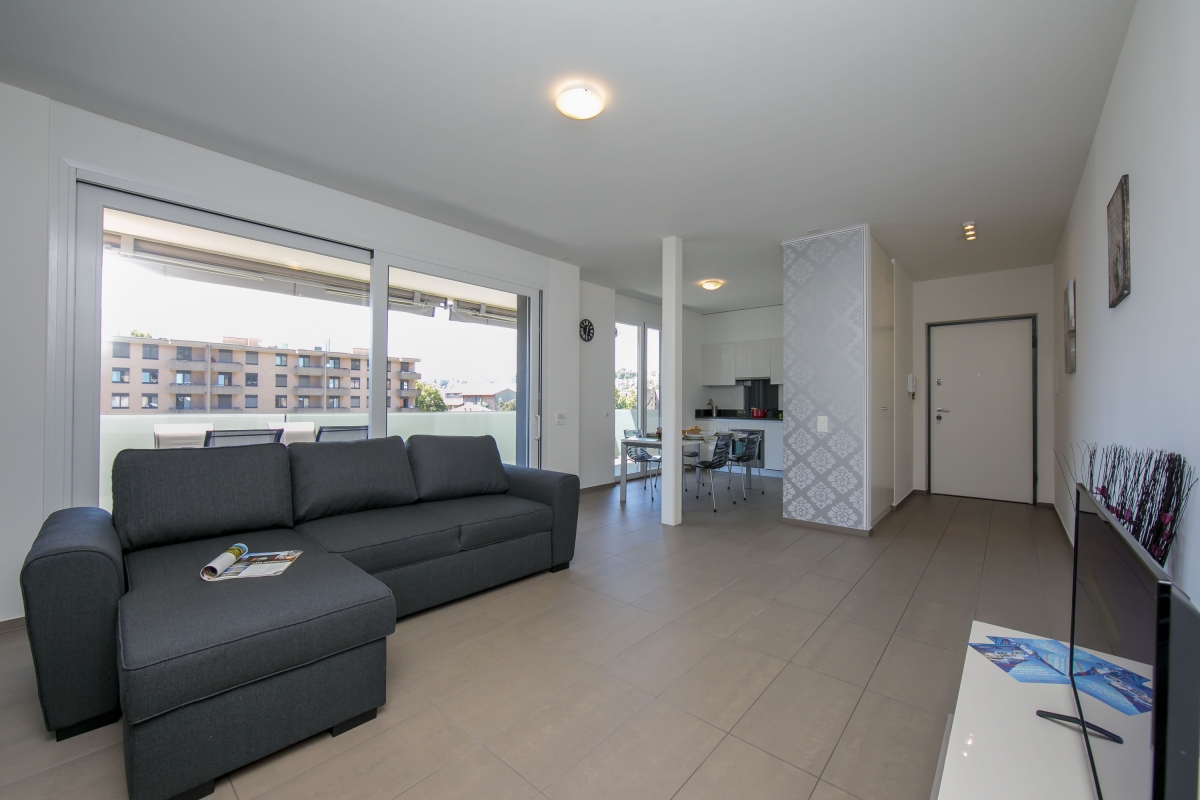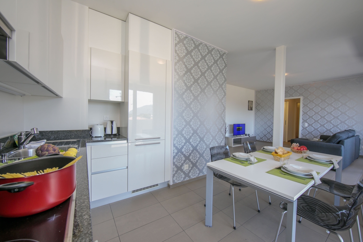 Take on the city sights, from this flexible modern balcony apartment with parking space! Situated within easy reach of the city centre, this modern 1-bedroom apartment is ideal for those looking to relax and explore. Inside, the balcony apartment is equipped with underfloor heating and a stylish modern furniture. A modern living area with sofa and flat screen TV is accompanied by access to a covered private balcony terrace with alfresco dining set. As well as entertaining outside, the apartment is also equipped with a contemporary kitchen diner for 2. A spacious master double bedroom offers a layout for 1 couple or 2 guests. A contemporary fitted shower room and WC complete the layout of this well-presented retreat. A private parking space can be found on-site and the 4th floor apartment is easily reachable by lift. For larger groups, the apartment can be rented alongside the same 4th floor apartment Mola Mimosa (ID 3021) and the 3rd floor apartments Mola Giglio (ID 3022) and Mola Glicine (ID 3023). From the residence, the picturesque lakeside and vibrant centre of Lugano are within a 5 minutes’ drive/ 17 minutes’ walk away. Sleeping- Bedroom 1: A spacious double bedroom with wardrobe Bathrooms- Bathroom 1: A contemporary shower room with wash basin, WC & bidet Bathroom 2: A service WC with washbasin Additional- • Central heating • Underfloor heating • Washing machine • Nespresso coffee machine • Upon request a portable WiFi device can be hired • Terrace with alfresco dining set • Lift access • Private parking space • Pets considered Location: The contemporary 5-storey residence is situated along ‘Via Pier Francesco Mola’ in Lugano, 5 minutes’ drive/ 17 minutes’ walk away from the buzzing café-lined lakeshore, the family-friendly lido, modern casino, Parco Civico and array of cultural attractions for all-weather fun. Lugano central bus and train station are 7 minutes’ taxi ride away, whilst Lugano airport is 15 minutes’ drive away.