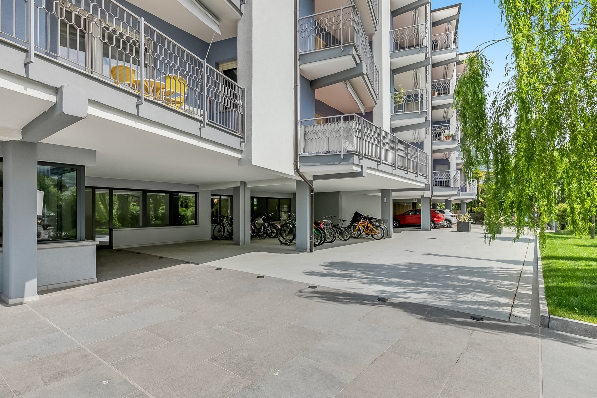 Apartament jest po cichej stronie budynku zdala od drogi i chalasu wieczorem. Jakieś 100 metrów od jeziora i plaży kamienistej - polecam buty do wody. Lokalizacja na ogromny plus. Apartament duży. Na dole miejsce parkingowe na rowery polecam wziasc blokade żeby sie przypiąć. Nie daleko sklep coop i za rogiem pycha kawiarnia z lodami :) parking zadaszony ale wąski nasz golf combi z platforma na 4 rowery ledwo się mieścił.