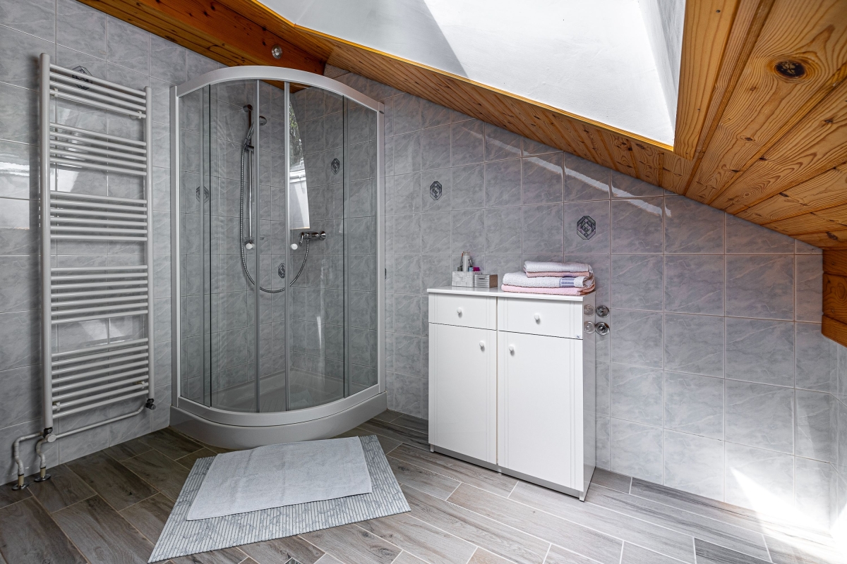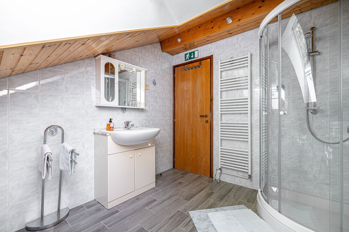Bathroom 1: The spacious bathroom has a shower cubicle, a WC and a washbasin.