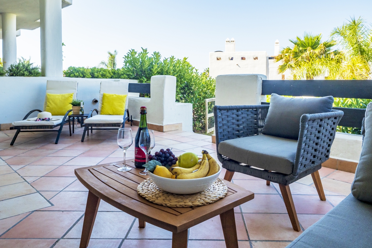 Enjoy a memorable vacation in the enchanting town of Estepona on Costa del Sol from this modern two-bedroom apartment. The ground-floor apartment can host up to 6 guests. It is located within a guarded residential complex with a beautiful winding swimming pool that is shared with all the residents of the complex. The private terrace adjoining a private garden simply delights the guests with its fresh and soothing atmosphere. Guests can relax and dine in the open here. The living room opens into the terrace and has an uplifting ambiance. It is furnished with a large sofa bed , a flat-screen TV and a dining table for 6. The kitchen is separate and equipped with a microwave, a coffee machine and a fridge among other appliances. Sleeping Bedroom 1: The lovely master bedroom has terrace access, a double bed, a wardrobe and an attached bathroom Bedroom 2: The pleasant room with terrace access has a single bed and a single bed with a pull-out single and a wardrobe. Two guests can sleep on the double sofa bed in the living room. Bathrooms Bathroom 1: The modern en-suite bathroom has a bathtub with a shower and a WC. Bathroom 2: The contemporary-style bathroom has a shower cubicle and a WC. Additional • Shared Outdoor Swimming Pool (Unheated) • Air-conditioning • Central Heating • Fenced Garden • Private Parking • Washing Machine • Iron and ironing board • Suitable for elderly • Wheelchair access • Free Internet The pool is open from June until October. Location The hillside apartment is located in a very peaceful neighbourhood about 6 minutes from the nearest beach. To the delight of golfers, the luxurious holiday apartment is within 500 meters of the nearest golf course. There is also a restaurant and a supermarket within walking distance. With a coastline of 21 kilometers, there are plenty of well-kept beaches with chiringuitos and a promenade to enjoy the scenic views with freshly prepared seafood. Once a fishing village, Estepona is a well-developed tourist destination that has preserved its Andalusian roots and is almost a hidden gem compared to its famous neighbours like Marbella and Fuengirola. It is a great destination to enjoy Spanish culture where tourists will find whitewashed houses with decorated balconies, cobbled streets, quaint cafes, souvenir shops and restaurants especially in the old town center (16 minutes). The marina is built on the original fishing harbor and is lined with restaurants and bars serving fresh seafood and paella. There are also shops and popular nightclubs and discos. There are also a few parks and museums worth exploring. For day trips, guests can drive to Marbella (23 minutes), Puerto Banús (15 minutes), Fuengirola (39 minutes) and Mijas Costa (42 minutes). Málaga International Airport is about 70 kilometers away. Located next to Selwo animal park.