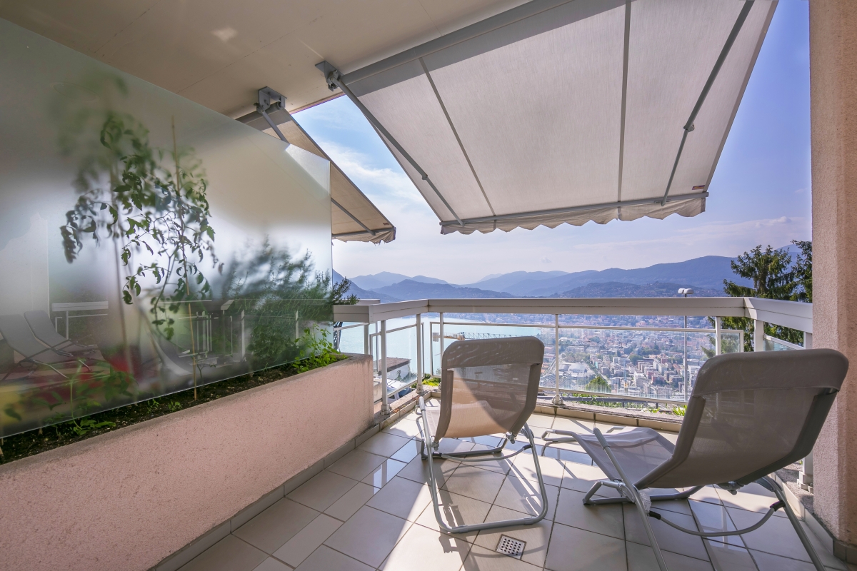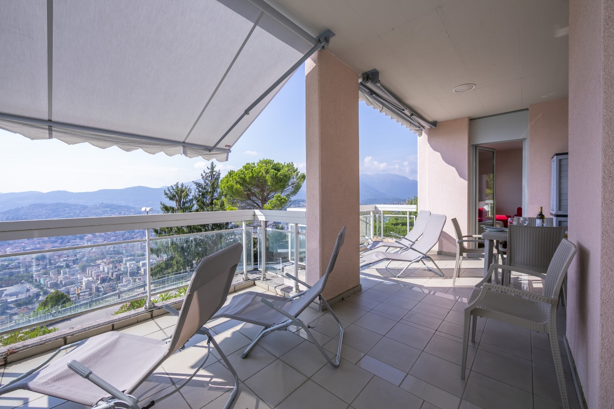 High up on the hillside, with glorious views out over Lago Lugano and the city of Lugano, this apartment really does live up to its name. On the first floor of a stylish modern residence, with a shared swimming pool, gym and sauna, there is everything guests need for a relaxing holiday, exploring Lugano. The three-bedroom apartment sleeps 6 people and is ideal for families. The light-filled corner living/dining room has two glass doors which lead onto the front balcony, where guests can relax on the sun loungers or dine al fresco and the side balcony, with views over the hills. Back indoors in the living room, there are two comfortable sofas, an armchair, a beautiful dark wood coffee table and a side-cupboard plus a widescreen satellite TV. The smart wooden dining table seats 4. The bright kitchen, with fitted units and pretty tiles, also has French windows leading onto the side balcony. It is fully equipped with an induction hob, oven, microwave, dishwasher, fridge-freezer, toaster and a Nespresso coffee machine. The shared swimming pool is on a terrace with wonderful views out over the lake. It is next to the well-equipped gym and sauna. Sleeping Bedroom 1: The bright master bedroom has a large double bed, a chest of drawers and glass doors leading out onto a private balcony, complete with two sun loungers and views over the lake. There is also an en suite bathroom. Bedroom 2: A fresh bedroom with a double bed, a traditional wooden wardrobe and a glass door out onto the balcony with views out over the lake. Bedroom 3: The third bedroom features a double bed. Bathrooms Bathroom 1: An en suite bathroom for bedroom 1. This pretty tiled bathroom has a full bath with a shower, bidet, basin and WC Bathroom 2: A shared bathroom with a glass shower, basin and WC. Additional • Wifi device (Chargeable) • Shared swimming pool, gym & sauna • Central heating • Laptop-friendly workspace • Hair dryer • Private parking, a car is recommended • Child friendly Location In the Italian-speaking Ticino canton of Switzerland, the city of Lugano is well known for its rich cultural heritage and stunning natural setting. The property is a 15-minute drive from Piazza Riforma, the main square that is the heart of the city. The piazza is lined with excellent restaurants and lively cafés, where you can enjoy an aperitif and watch the world go by. The city is home to many museums and galleries. One of the most popular is MASI, The Museum of Art of Italian Switzerland (15-minute drive) which hosts regular contemporary art exhibitions. Guests might enjoy a swim in the lake at the Lido San Domenico (10-minute drive). Nearby is the ferry stop of the Grotta Elvezia, where you can catch a boat to really appreciate the beauty of the lake. Younger guests might also enjoy a funicular ride up to the peak of Mont Brè with stunning views out over the lake and mountains. The station is a 10-minute drive from the apartment. The closest international airports are in Italy - Milan Malpensa 1 hour and 15 minutes away by car, or Milan Linate, a 1 hour and 20-minute journey.