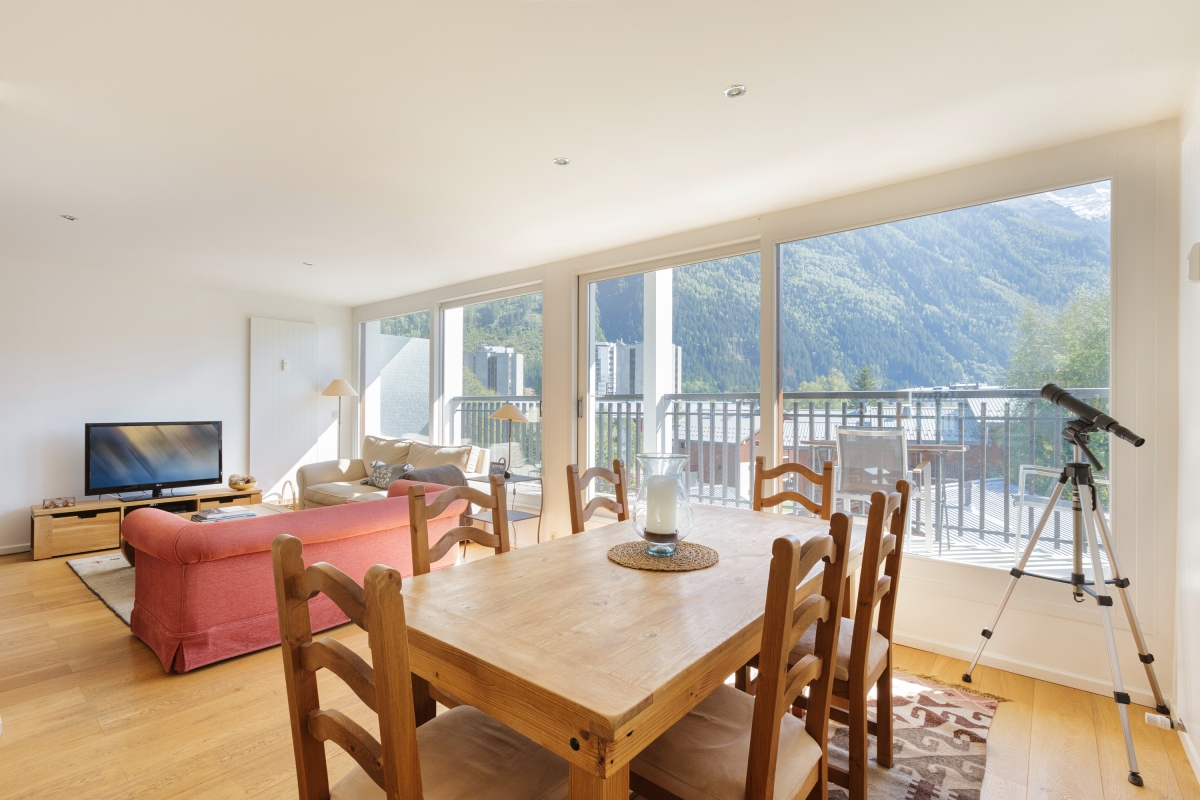 A spacious modern apartment in the heart of Chamonix, with a large balcony with magnificent views of the mountains. On the third floor of a modern residence, set in extensive gardens, this airy apartment sleeps 5 people in comfort. The large living area has a wide window along one wall, including a sliding door that leads out onto a balcony, with spectacular views. There is a table and chairs on the balcony, where guests can sit and relax. The contemporary, comfortable furniture in the living room includes 2 large sofas and a leather armchair, with a glass-fronted, wood-burning stove. The dining table, for 6 people, is set between the windows and an ultra-modern, extensive kitchen. The kitchen is separated from the living area by a wide breakfast bar and is well-equipped with a cooker hob, oven, microwave, dishwasher, fridge, american style coffee machine, extractor fan, raclette and fondue. Sleeping Bedroom 1: The stylish, master bedroom has a double bed, ornate bedside tables with reading lights and an ample, mirrored wardrobe Bedroom 2: The second bedroom has 2 single beds and a third bunk bed, reached via a wooden ladder. Bathroom This independent bathroom includes a spacious, glass shower, with multiple showerheads, double basins and a WC. Additional • Free wifi installed • Fireplace • Lift • Flatscreen TV • Shared garden • Hair dryer • Smoke detector & CO detector • Private parking but car not necessary Location The apartment is in the heart of Chamonix, close to the ski lifts, ski shuttle buses and the slopes. The Chamonix Mont-Blanc railway station, for the Mont-Blanc-Express, is 10 minute walk away. Chamonix has so much to offer all year round. The nearby slopes are popular with skiers and snowboarders alike. For an alternative winter sport, the ice rink is only a 7-minute walk away, across the river Arve. The rink hosts regular ice hockey matches, with the local side, the Chamonix Pioneers competing against teams from across France. In the summer months, visitors can go hiking, mountain biking, white water rafting, mountaineering, rock climbing, playing golf and go horse riding. There is a skateboarding park 10 minutes away on foot and tennis courts are just 5 minutes away. For very fit visitors, there is the Ultra Trail du Mont Blanc, which takes place every August. The event is made up of a series of 5 races, covering 170km, with 10,000m of ascent, passing through 3 countries, so not for the faint-hearted! For something more relaxing, the Chamonix Yoga Festival (July) brings together yoga practitioners from across the world for a series of workshops, both indoors and out in the fresh mountain air. Chamonix has all the amenities visitors need throughout the year, including many bars and restaurants to suit all budgets. Geneva airport is a 1 hour 10-minute drive from the apartment. Due to the unique topography, location, and weather conditions in the Mont Blanc Valley, internet connectivity may be unreliable.