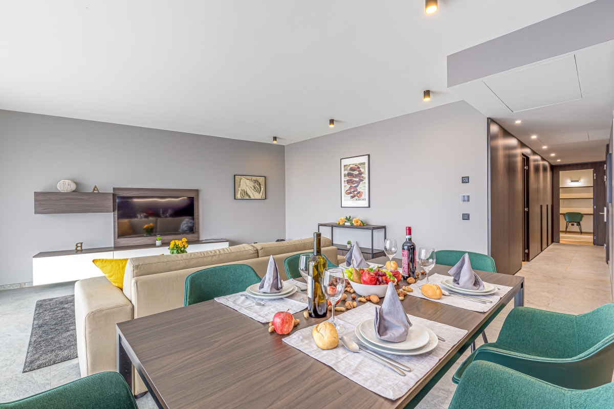 On the sixth floor of one of Lugano’s most luxurious new developments, this penthouse apartment is an ideal base from which to explore Lugano. This unique residence caters to people coming to Lugano for business and people looking for a relaxing city break. The communal facilities include a co-working space, a ground floor bar and restaurant with extensive outdoor seating, a spacious reception area, a gym and secure storage space. The apartment sleeps 6 people in comfort. The living room has a large glass door that leads out onto a private balcony with a wooden table and six chairs where you can dine al fresco and enjoy stunning views out across Lugano and the mountains. Back indoors, the open plan living area has a contemporary sofa, a flat-screen Smart TV and a dining table with 6 seats. In the sleek, fitted kitchen you will find everything you might need during your stay: a cooker hob, an oven, dishwasher, fridge, freezer and Nespresso machine. All fittings throughout the apartment are of the highest quality. Sleeping Bedroom 1: A spacious, bright bedroom with a double bed, ample wardrobe space, laptop workstation and an en suite bathroom. Bedroom 2: This airy bedroom has a double bed, good storage and an en suite bathroom. Extra: The sofa in the living room converts into a comfortable double bed. Bathroom Bathroom 1: En suite to bedroom 1, this modern, stone tiled bathroom has a glass shower, basin, bidet and WC Bathroom 2: En suite to bedroom 2, a stylish, stone-finished bathroom with a glass shower, basin and WC Bathroom 3: This separate bathroom has a glass shower, basin and WC. Additional • Free Wifi • Lift • Outside dining area • Washing machine & dryer • Laundry facilities • Laptop friendly workspace plus shared co-working space • Air conditioning • Central heating • Hairdryer • Garage parking available (chargeable) and free public parking, but car not necessary • Child-friendly • Suitable elderly • Pets possible on request • EV Garage parking available (chargeable) Location On the border of Switzerland and Italy, the city of Lugano is famous for its stunning location, rich cultural heritage and excellent restaurants and cafés. The local farmers’ market (Tuesdays and Fridays) in Via Carducci (20 mins walk) is the place to go to pick up the best ingredients if you want to cook at home. The city hosts many festivals throughout the year, including the “Luganomusica” festival every summer. MASI (the Museum of Art of Italian Switzerland) (a 20-minute walk) hosts regular contemporary art exhibitions. A day trip exploring the Lago Lugano is a must, as is a walk along Lugano’s famous waterfront, with breathtaking views over the lake. For a more active break, there are regular mountain running races throughout the year as part of the Ticino Mountain Running Cup. For business travellers, the apartment is just an 11-minute walk from the Centro Esposizioni Lugano exhibition centre and an 18-minute walk from the Palazzo Dei Congressi Lugano. The closest international airports are in Italy - Milan Malpensa 1 hour and 5 minutes away by car, or Milan Linate, a 1 hour and 20-minute journey. Arriving by train? Lugano’s railway station is a 25 minute walk from the apartment.