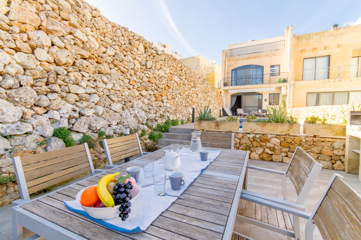 A delightfully elegant and welcoming Villa, built in typical Gozon style is located on the peaceful outskirts of Xaghra town in North Gozo. Just a stone’s throw from the famous red sand beach of Ramla this traditional stone villa is the ideal spot for your peaceful Mediterranean getaway. This modern villa comfortably sleeps six. On entering the villa, an elegant passageway takes you to an open-plan living/dining space with an open-plan full kitchen. The living area is furnished with a large comfortable sofa and flat-screen TV, leading to a dining area which comfortably seats six. The kitchen features a breakfast bar seating two, perfect for that quiet early morning coffee. The kitchen is full equipped with a cooker hob, oven and microwave, fridge freezer and washing machine. Free Wi-Fi is available throughout the villa. Large French windows lead out onto a sun-soaked private terrace and a large private swimming pool with an in-built Jacuzzi. The terrace is equipped with a coffee table and three outdoor armchairs. The path leads to a private garden, equipped with three sun loungers with a large sunshade, charcoal grill, and an outdoor dining table seating six, perfect for a moonlight dinner or simply to soak in the sun. Sleeping Bedroom 1: A bright bedroom with a King Size double bed and extensive wardrobe space, with Ensuite Bathroom. Bedroom 2: A large airy room with two single beds, two bedside tables and a wardrobe, also with an ensuite bathroom. Bedroom 3: A well-appointed bedroom with a King size double bed, bedside tables, and wardrobe space. Bathroom Bathroom 1: Fully equipped bathroom with bathtub and shower, with wash basin and WC Bathroom 2: Standalone shower with Wash basin and WC (Ensuite) Bathroom 3: Standalone shower with wash basin and WC (Ensuite) Additional • Free WIFI • Private, outdoor pool • Air Conditioning • Private Parking (Car Essential) • Smart TV • Washing Machine • Dishwasher • Suitable for the Elderly • Pets Allowed • Wheelchair Access • Smoke Detector • Carbon Monoxide detector • Toaster • Clothes horse • Sea view Location Xaghra is the third largest town in Gozo with a population of approx. 5000, the town centre has a variety of bars, restaurants and bistros to cater to every palate, as well as small grocery stores and even a spa! It is located close to the popular sandy beach of Ramla, reached by a short car ride, or for the more active a 30-minute walk away. Overlooking Ramla Bay is the Calypso’s cave, the supposed home of Homer’s Calypso. Xaghra has good road and public transport links to Victoria (Rabat) and Mgarr Harbour and Gozo ferry terminal, with frequent ferries for the 25 min crossing to Cirkewwa Ferry Terminal on Malta with accessible public transport and highway connections to the international airport. The island can be easily travelled by car and public transport. Historical tours, treks and water sports can be conveniently booked and reached anywhere on the island. Victoria the capital of Gozo is a convenient 10-minute car journey, here you’ll find many bars and restaurants as well as the famous Citadel. Victoria has many museums and tours dedicated to the history of Gozo and Malta. Mgarr Harbour is 15mins away by car, home to the ferry terminal, with frequent ferries for the 25 min crossing to Cirkewwa Ferry Terminal on Malta with accessible public transport and highway connections to the international airport. The typical Mediterranean climate of Malta is sunny climate with a daily average of five to six hours of sunshine in midwinter and 12 hours in summer. The Summers are hot, dry, and very sunny. The remarkably mild winters with piercing blue skies make it ideal for long rambles in the lush and verdant countryside. Malta has an amazing cultural heritage with 7000 years of history, the clearest water in the Mediterranean (snorkelling and diving world spot), walking/trekking tours, Land and water sports and lots of restaurants, bars and festivals.