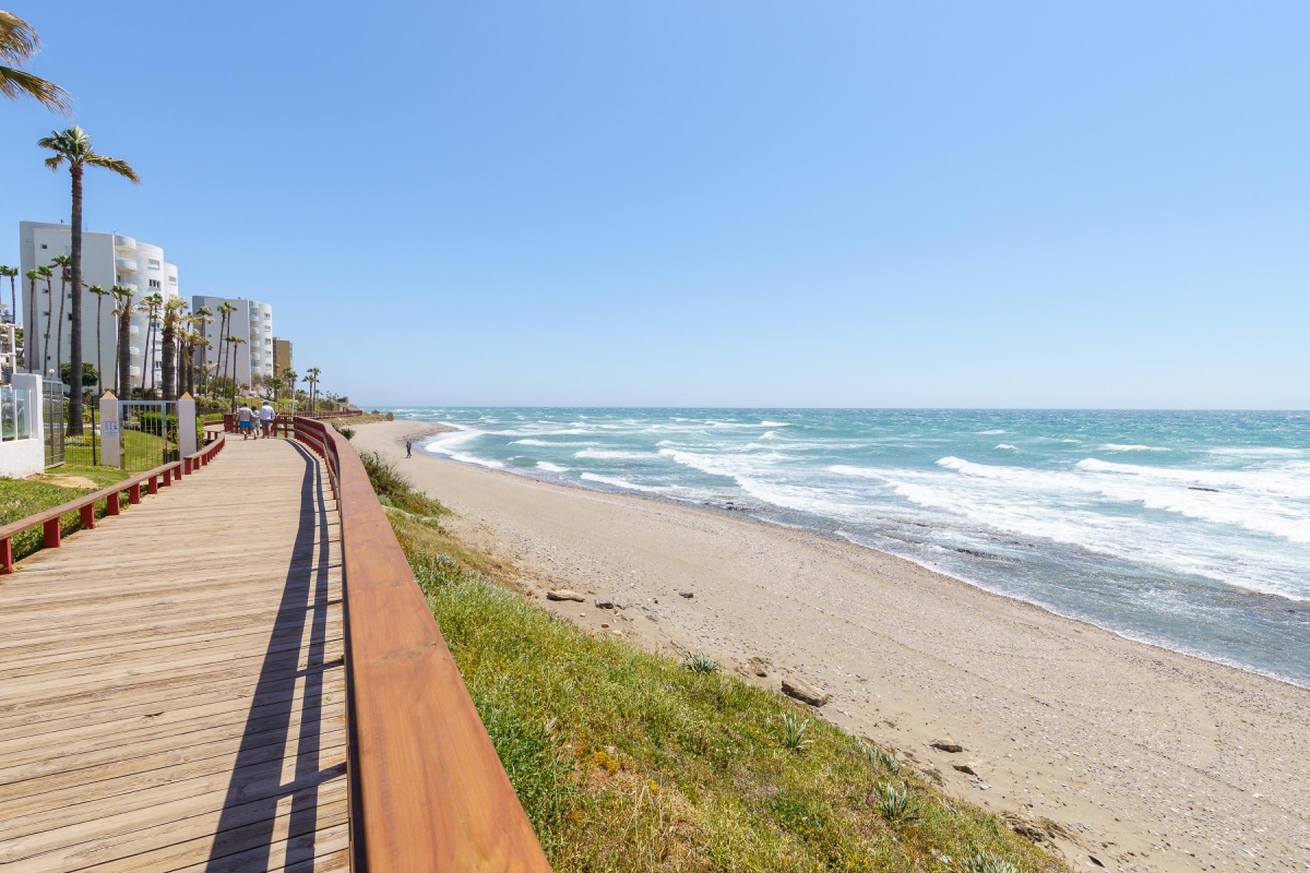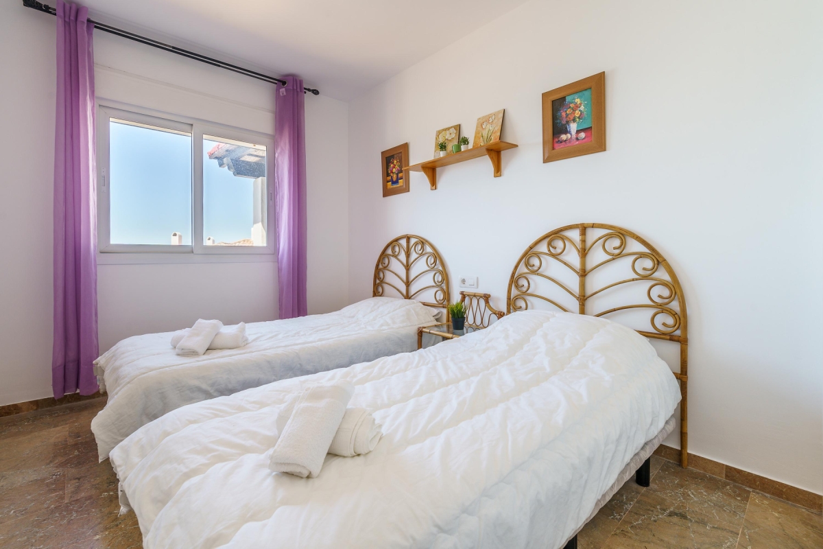Wake up to scenic views of Playa Puerta del Mar Beach at this terraced penthouse for 6! In a gated complex, a walking promenade leads to a penthouse with two bedrooms and two bathrooms. Along with shared pool access and an outdoor seating area, it offers a private terrace with a dining table and chairs set up for breakfast meals. There are sunbeds to bask in the sun. The house’s simple, restful interiors complement the living room which is equipped with a sofa double and a smart TV tucked in a fine wooden cabinet. Well-maintained with lift access, the penthouse has a sufficient seating area and a separate kitchen. It is equipped with all the essentials such as an induction hob, a dishwasher, and a Nespresso coffee machine. Additionally, with free WiFi and laptop-friendly workspace, this rental situated on the seashores is ideal for workstation. Sleeping Bedroom 1: A restful bedroom with a double bed, a wardrobe and an en-suite bathroom. It has private access to the terrace with a sea view. Bedroom 2: A lovely bedroom with two single beds and a wardrobe. Living Room: A sofa double with access to the terrace with a sea view. Bathroom Bathroom 1: An en-suite bathroom with a bathtube , bidet and WC. Bathroom 2: A well-lit bathroom with shower and WC. Additional • Smart TV • Flatscreen • Free WiFi • Air-Conditioning • Laptop Friendly Space • Laundry Facilities • Washing Machine • Iron-Ironing Board • Coffee Machine • Dishwasher • Shared Pool • Unheated Pool • Shared Fenced Garden • Private Parking • Child Friendly • Suitable for Elders • Pets Not Permitted • Smoking Not Permitted • Wheelchair Access • Lift-Elevator Please Note: This property is available for long-term rental in the winter season. Please contact us for special prices. Location Nestled in the coastal gem of Calahonda, the sunny penthouse makes a perfect spot to enjoy the sun and the sea. Nearby, one can explore the quaint streets and dine at local restaurants and cafes offering delightful Spanish cuisine. While at the shores, for those who wish to explore some water sports, there is Pirates Kayak within a 5-minute stroll. You can head to Aventura Amazonia Mijas for a bit of adventure with zip lines and treetop challenges within a 20-minute drive from the penthouse. In the vicinity, among the many clubs, there is La Siesta Golf for golf enthusiasts within a 10-minute drive. This penthouse location is suited for vacationers who long to unwind at the beach and relax. For day trips, one can consider driving to places like Malaga and Mijas Pueblo, about 37 minutes and 27 minutes away, respectively. For other unique attractions and holiday spots, you can also ride to Marbella and Fuengirola both about a 20-minute drive away from the penthouse. The nearest airport, Malaga International Airport, can be reached in just 30 minutes by car.
