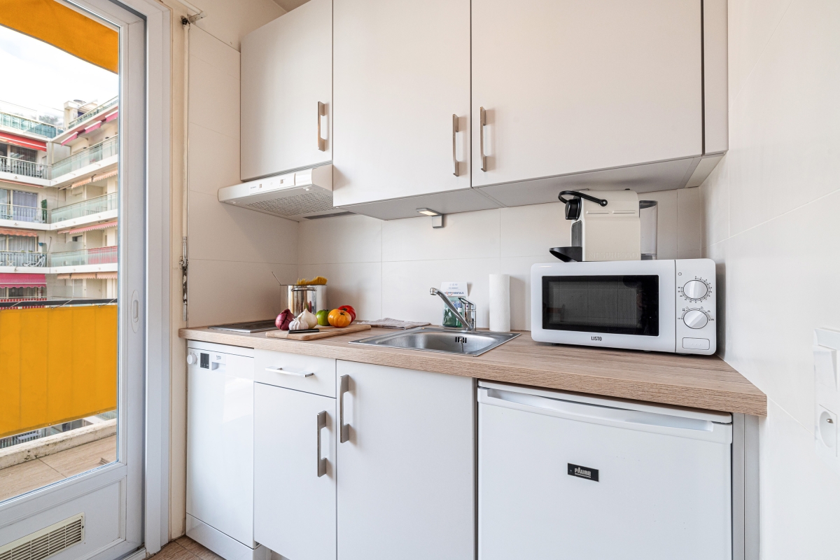 Explore the various attractions of Nice and the dazzling Côte d’Azur coastline from this studio holiday apartment just behind the Promenade des Anglais. The air-conditioned studio on the fifth floor welcomes 2 guests to a homely ambiance. It has a balcony where guests can enjoy their breakfast of fresh croissants. Sleeping Living room: A comfortable sofa bed for 2 persons Bathroom There is a separate shower room and a toilet in the apartment. Crib available on request (to avoid choking risks we do not provide sheets or pillows for the crib). Additional • Wifi not available • Lift • Washing Machine • Dishwasher Location Situated a few steps from the Promenade des Anglais and the beaches from Nice. This studio puts its guests within walking distance from major attractions of the destination. Some of the must-visit places here are Cours Saleya known for its stalls selling fresh local produce, Marché aux Fleurs- the popular flower market, and culturally significant monuments like Palais de la Préfecture, Cathédrale Sainte-Reparate, Eglise Saint-Jacques and Nice Cathedral that are known for their exquisite architecture and artwork. Besides places to visit, old Nice is also a foodie’s paradise that treats tourists to traditional delicacies. As for the apartment, there are many restaurants and shops within easy walking distance. Beyond the world of cobbled streets, alleyways, and authentic charm in the old town, guests should visit the legendary Promenade des Anglais (5 minutes) that follows the curve of the Baie des Anges beaches. Whether to stroll along the seaside road, visit the opulent buildings or take to the beaches, the choice is yours. For art lovers, Marc Chagall National Museum and the Henri Matisse Museum are 10-12 minutes’ drive. Antibes (40 minutes), Villefranche-sur-Mer (15 minutes), Cannes (38 minutes) and Monaco (27 minutes) can be easily reached by car from the holiday apartment and make for a great day trip. The closest international airport is only 7.4 kilometers away.