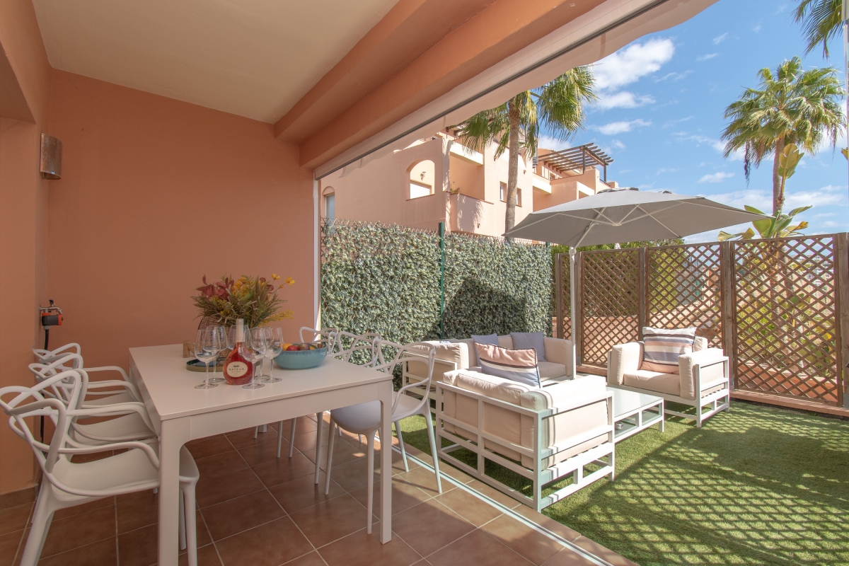 Experience a luxe beach vacation at this fully-air conditioned holiday apartment in Mijas Costa! Also available for longer term rental in winter season. Please ask for special prices Set in a delightfully sunny complex with a shared pool and garden, this 4-bedroom duplex apartment for 8 is ideal for a tranquil beach vacation or a golfing staycation with family and friends. The apartment offers access to the lovely shared areas of the complex and has a private garden with lounging, BBQ and open-air dining, perfect for relaxation and socialising. A second, sea-view terrace is also available on the upper floor for those who want to steal some moments of solitude with a glass of wine or a good book. Inside, the lower level of the hillside apartment is dedicated to a modern living room with stylish yet comfy interiors consisting of sofas, an ottoman, a large flat-screen TV and direct terrace access. A separate kitchen in the apartment is fully equipped to facilitate an effortless self-catering stay and features a dishwasher, and induction hob, among other utilities. Thanks to digital-nomad-friendly amenities like free Wi-Fi and a laptop-friendly workplace, this holiday home is also ideal for those remote workers looking to enjoy long stays at Costa del Sol! Sleeping Bedroom 1: An ensuite master bedroom with a terrace, a double bed and a wardrobe. Bedroom 2: A sea-view double bedroom with terrace access and a wardrobe. Bedroom 3: A splendid double bedroom with a wardrobe. Bedroom 4: A light-filled bedroom with a double bed and wardrobe. Bathroom There are 2 modern bathrooms in the apartment. Both are fitted with a bath with shower, WC and bidet. One of them is the en-suite. Extra: There is a service WC for added convenience. Additional • Free Wi-Fi • Covered Private Parking space • Washing Machine • Laptop-friendly workplace • Child-friendly • 16 Internal Steps • Ironing Facilities Location This home away from home is located on Mijas Costa within enviable proximity to La Cala. The sandy beaches of Costa del Sol like Cabopino and Calahonda are just a 10-minute drive away. Guests are also within walking distance (20 minutes) to amenities like supermarkets for a carefree stay. The rental is a suitable base for golfers, Mijas is one of the most popular destinations to enjoy the sport, as Cabopino Golf Club and Miraflores golf course are just 5-minutes from here. Apart from golf, guests can also visit inland Mijas and soak up peaceful strolls in its characteristic white-washed historical centre. If you are a history or an art buff, then don’t miss out on the plenty of museums dedicated to miniatures, Picasso, traditional flour mill, as well as historic buildings like the oval bullring and the parish church of Inmaculada Concepción. For party lovers, the famous Nikki Beach in Marbella is just a 15-minute drive away. Meanwhile, for some water-based family fun, Aquapark in Mijas is under a 15-minutes drive from here. The UNESCO-protected Cuevas of Nerja is an hour’s drive away. The nearest international airport is Málaga-Costa del Sol, located a 50-minutes drive from the holiday rental.