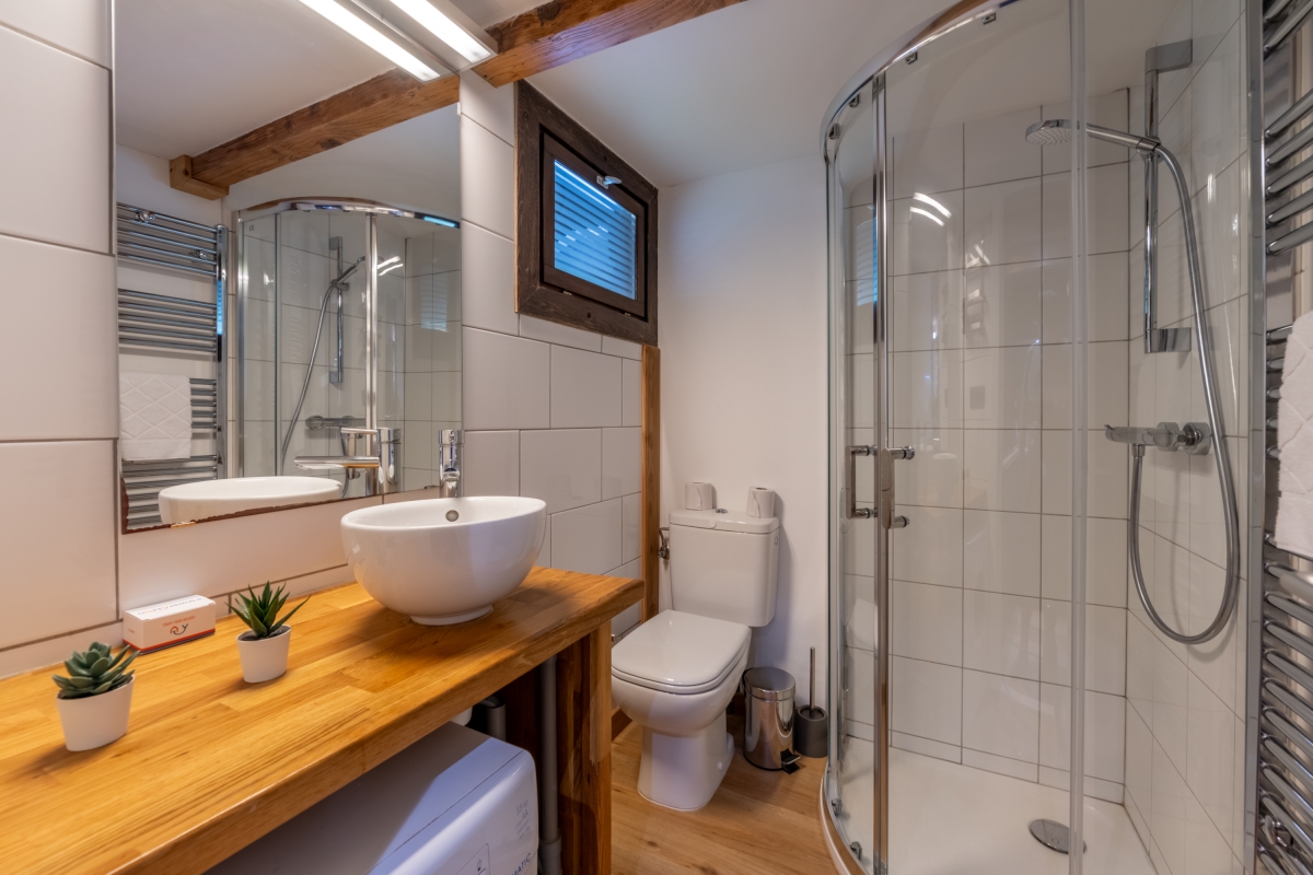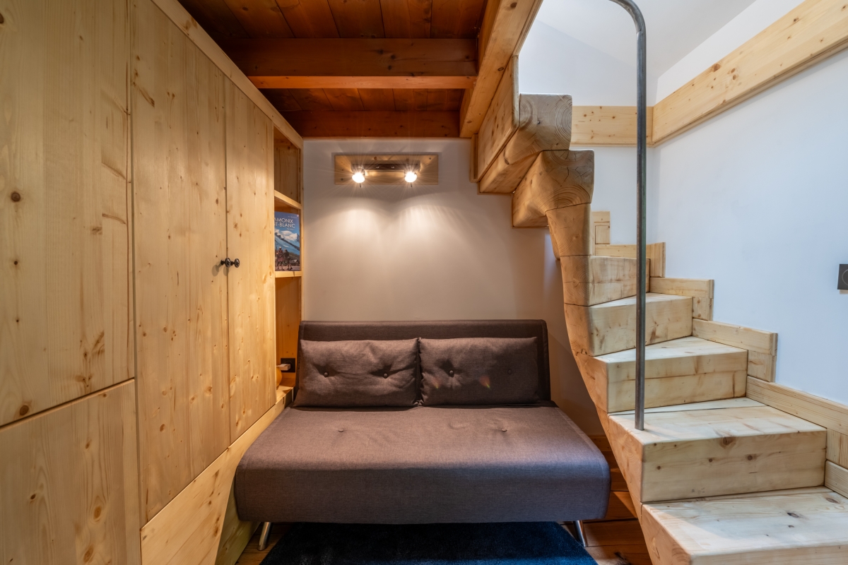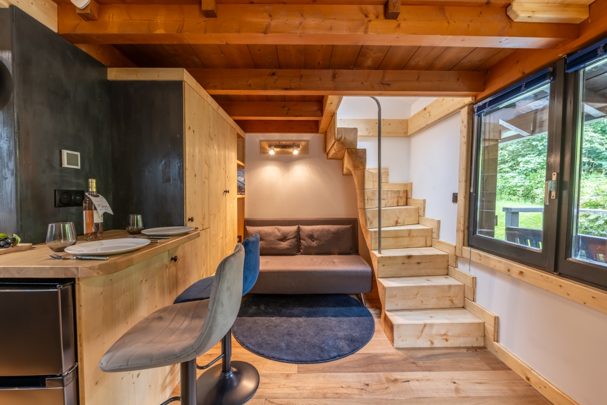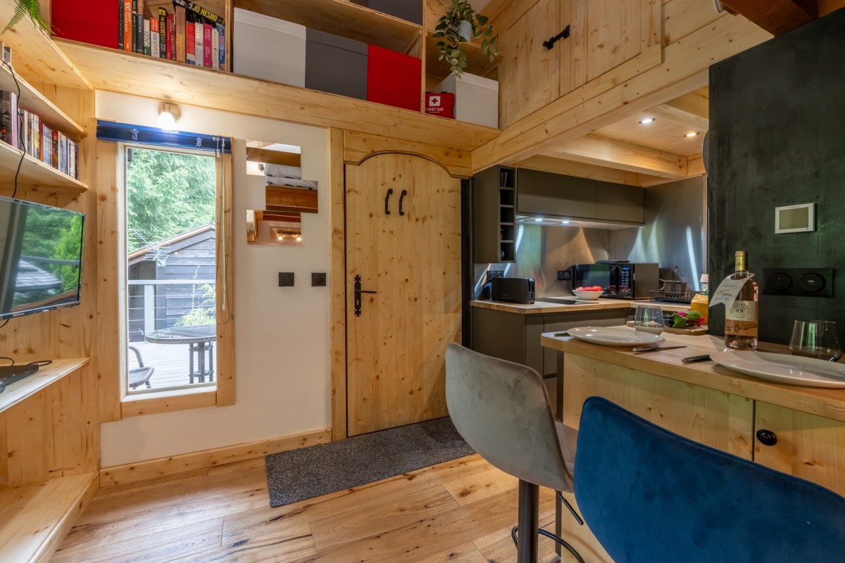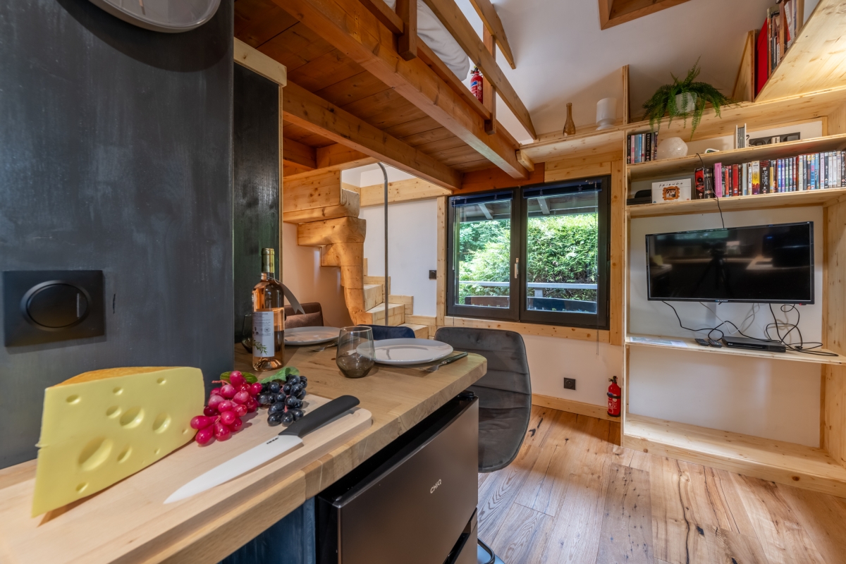 A charming mountain cabin, which makes an idyllic bolthole for 2 in the Mont Blanc region, at any time of year. This sunny, modern wooden cabin is surrounded by nature and has been thoughtfully decorated throughout. The living room has a sofa where guests can relax after a busy day, with a coffee table. Next to this is a dining table which seats 2 people and a flatscreen TV plus the very stylish, open plan kitchenette, equipped with a cooker hob, microwave-oven, fridge and toaster. Outside the cabin is a large, wooden deck with a dining table and bench where guests can enjoy the stunning surroundings. Sleeping There are twin joinable beds on the mezzanine, tucked under the eaves, with a large skylight, so is sunny and bright. Bathroom This modern bathroom has a bath and shower, washbasin and W.C. Additional • Free wifi • Outdoor terrace with dining area • Washing machine • HD TV with DVD player • Reading library • Hair dryer • Underfloor Heating • Free public parking - car recommended • Ski storage Location The cabin is located south of Chamonix, in a group of cabins on the hillside, in the heart of nature. It is a 20-minute walk or 3-minute drive from the center of Chamonix Sud, with its ski lifts and amenities. The town of Les Pèlerins is just a 2-minute drive away. Here guests will find shops, banks and Les Pèlerins railway station, which opens up the whole valley. The Chamonix region is well-known for its wide variety of both winter and summer activities. It is a centre for skiing, snowboarding, cross-country skiing, sledging and ice skating. In the summer there are numerous options including hiking and biking trails through stunning mountain scenery, horse riding at the Centre Equèstre de Mont Blanc (10-minute drive), and outdoor adventures at Accro’ Parc at Lac des Gaillands (6-minute drive). The area is home to many fine restaurants and bars, which will suit all budgets. Geneva airport is a 1 hour and 15 minute drive from the apartment. Due to the unique topography, location, and weather conditions in the Mont Blanc Valley, internet connectivity may be unreliable.