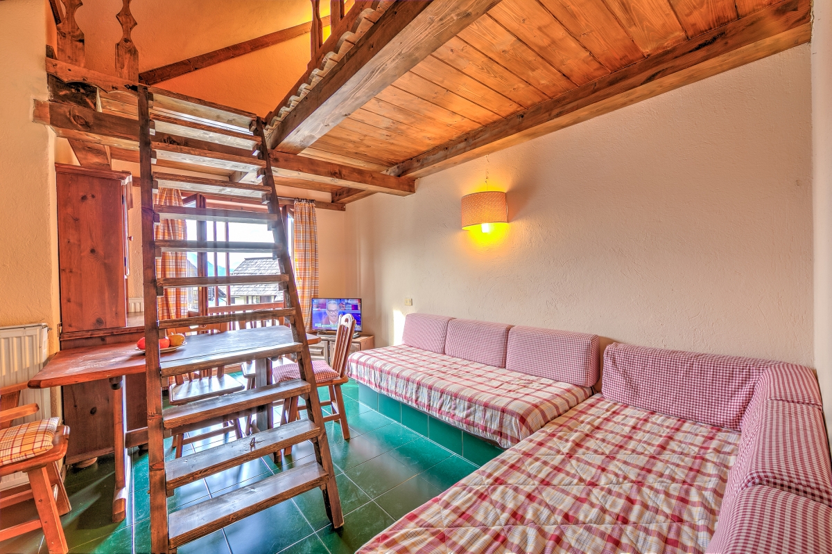 The apartment is on the second floor (with a lift), of an attractive chalet-style residence, and has a stylish living area with a corner sofa, a flat-screen TV, a classic wooden dresser and a small balcony. The wooden dining table is next to the open-plan kitchen and has seating for 4 people. The open-plan kitchenette is equipped with a cooker hob, microwave and fridge.