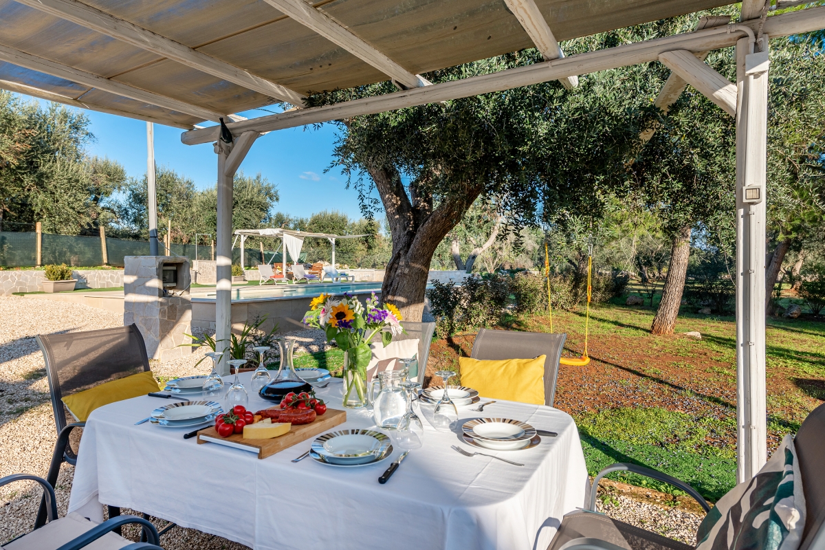 On the border of the famous Valle d’Itria, set in extensive private gardens filled with olive trees and its own private pool, this unique complex of 3 ancient trulli and a restored lamia, is really a wonderful holiday destination. The property, which sleeps 5, has been sensitively restored and furnished with all modern conveniences. The open-plan living area, under the stone domes of the trulli, has a comfortable sofa, dining table for 5 people, a wood-burning stove for winter months and two double bedrooms, in curtained alcoves. The separate kitchen is well-equipped with a cooker hob, microwave, dishwasher, American fridge & freezer and coffee machine. A door opens directly to the garden. The gardens have been beautifully arranged with a series of sitting areas. The private pool has sun beds for guests to relax and a shaded sitting area. There are hammocks and a children’s swing scattered throughout the grounds. The main outdoor dining area is shaded and has a table that seats 6 people. Sleeping Bedroom 1: The stunning master bedroom is in a separate trullo. It has a double bed, hanging rail. Bedroom 2: This alcove bedroom has a double bed Bedroom 3: This alcove bedroom has a single bed. Bathroom In the lamia this large, stone tiled bathroom has a shower, bidet, basin and WC Additional • Free Wifi • Private outdoor pool • Outside dining area • BBQ • Private fenced garden • Air conditioning • Extra child friendly • Washing machine • Private parking space, car essential for your visit • Extra pet friendly • Cash security deposit of €400 for under 21's Location Although this property is set in quiet countryside, there is plenty to do and see close by. It is just 35 minutes west of Brindisi which is a fascinating place for a day trip. The town of San Vito Michele Salentino is just 10 minutes away. Here visitors can enjoy the fascinating local history as well as regional food, in particular at the weekly market (Thursday). The charming old of town of Cisternino (35 minutes) makes a perfect day trip. The closest airport is Aeroporto del Salento, Brindisi, which is just 35 minutes from the house.